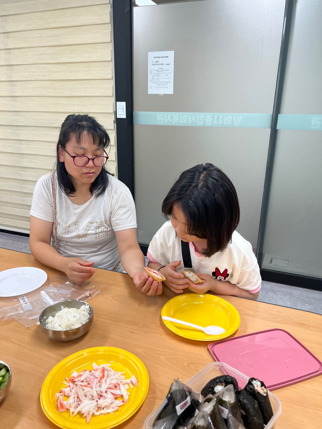 삼각김밥 만들며 누구 먼저 먹으면 좋을지, 누구에게 주고 싶은지 도란도란 이야기 나눕니다.