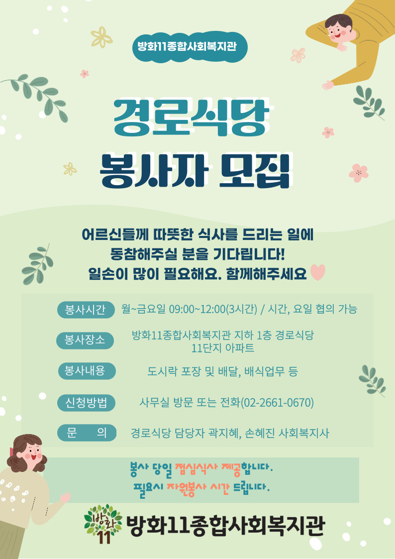 무료급식사업 자원봉사자를 모집하오니, 많은 관심과 신청 부탁드립니다.