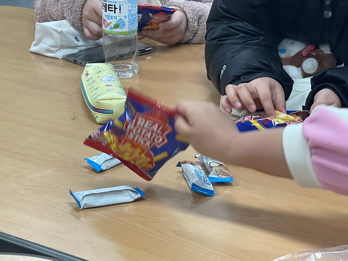 활동이 마칠 때쯤, 서지유가 모두를 위해 가져온 과자를 나눠줬습니다. 옹기종기 모여 앉아 과자 나눠 먹었습니다. 칠판에 그림도 그렸습니다. 선생님 예쁘게 그려준다던 아이들이 생각납니다. 오늘 하루 함께해준 아이들에게 고맙습니다. 하하호호 웃음꽃이 가득 피어난 소중한 날입니다.