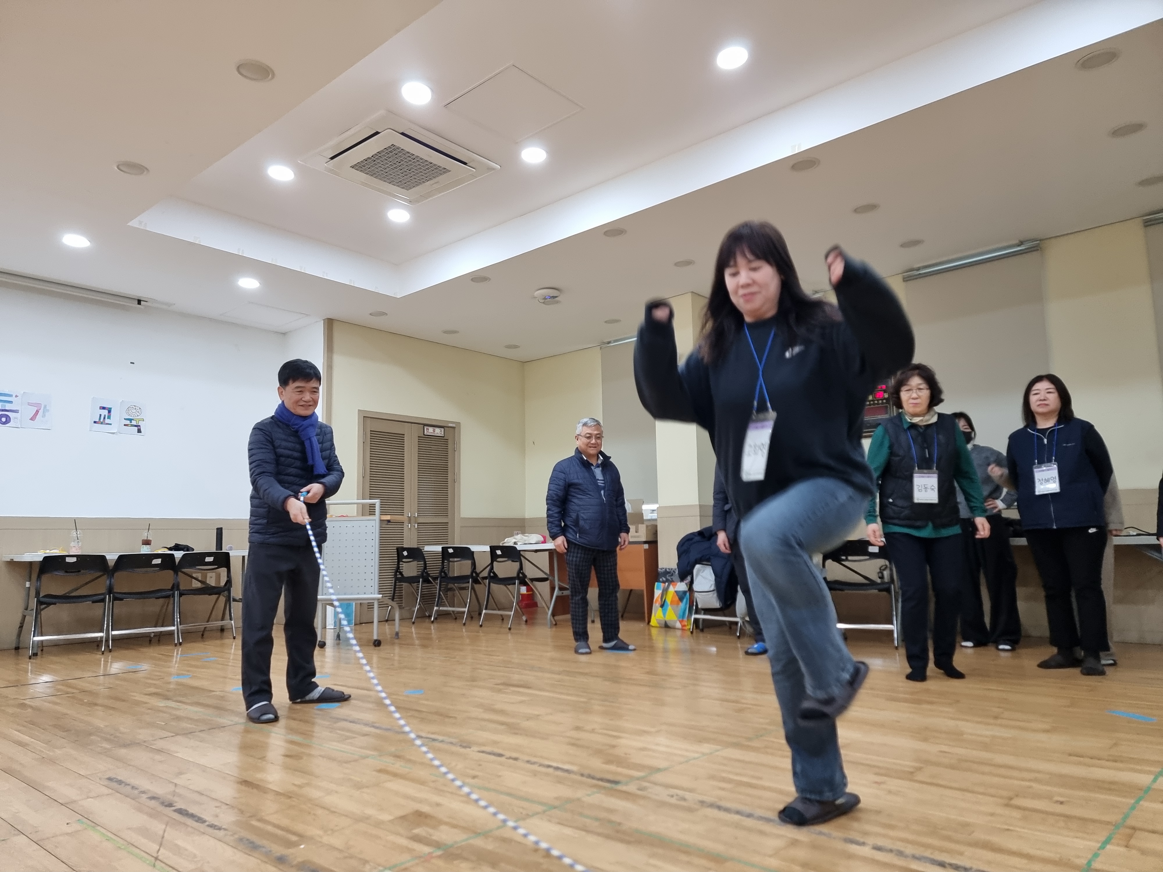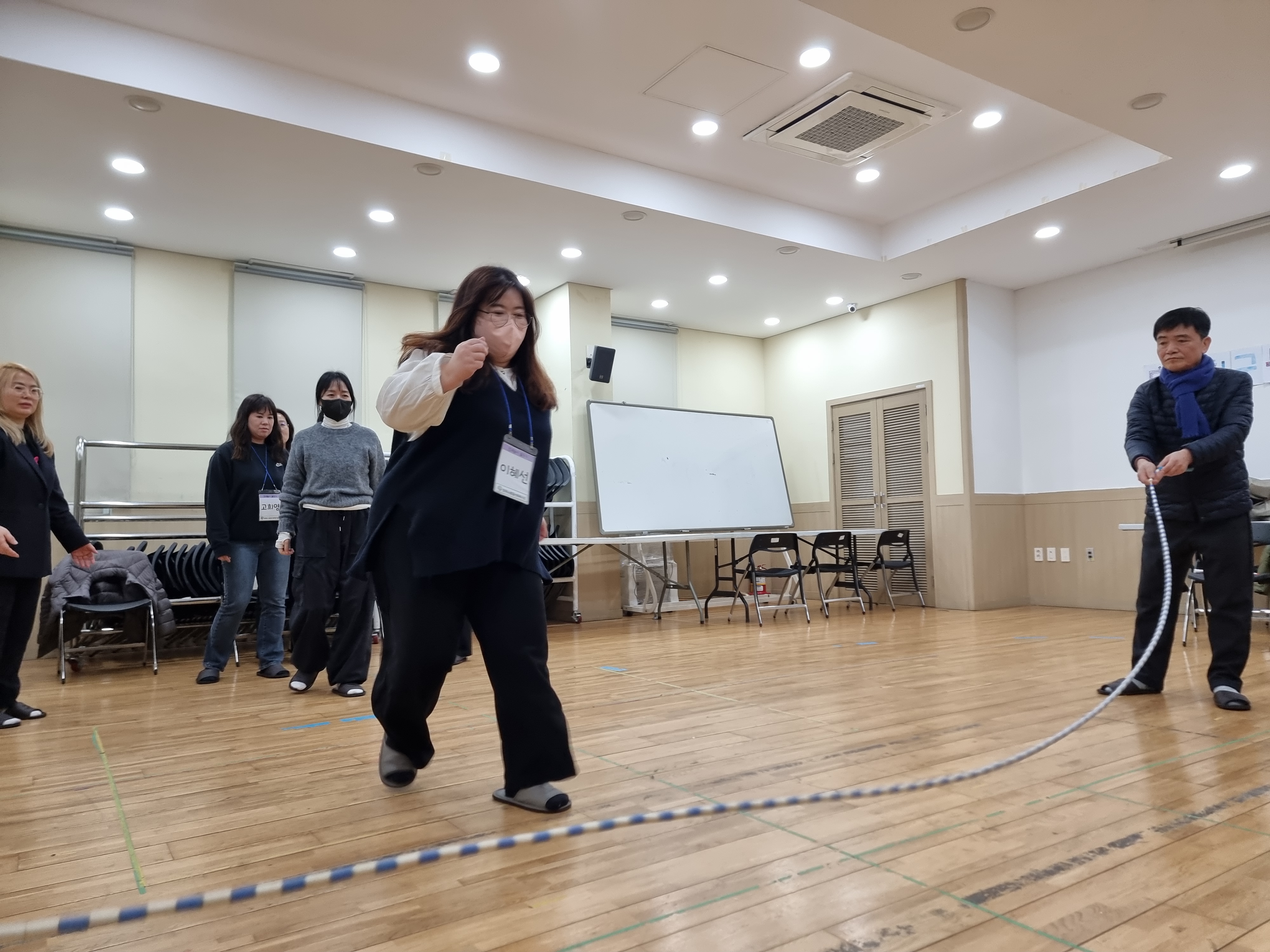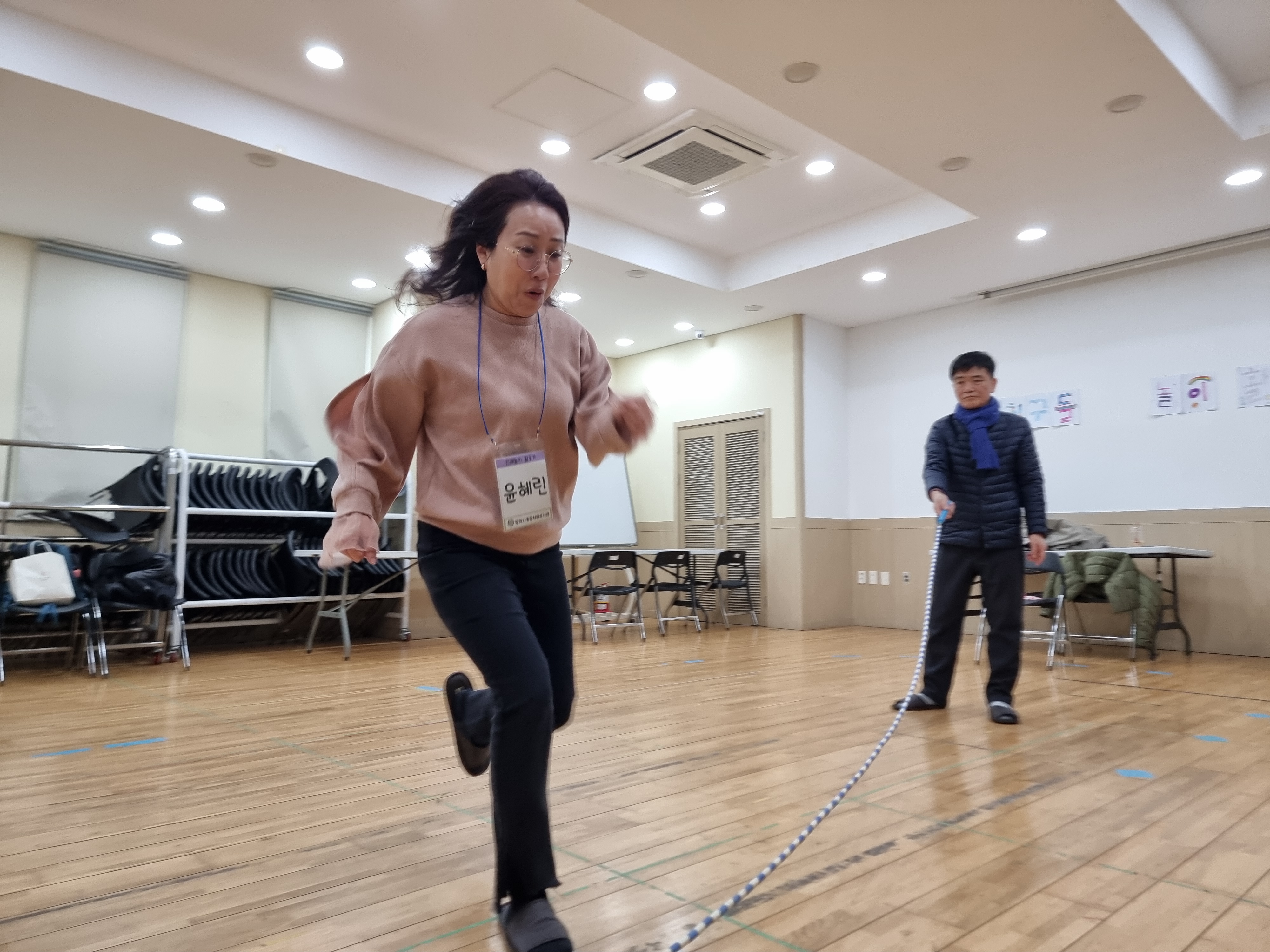 여러번 시도 끝에 놀랍게도 50개를 넘겼습니다. 기적입니다. 나이도 많고 몸도 무겁고 요령도 없었는데 함께 서로를 응원하면서 하니 50개를 성공한 겁니다. 모두 환호했습니다. 서로를 기뻐했습니다. 교육생이 함께 하나되었습니다.