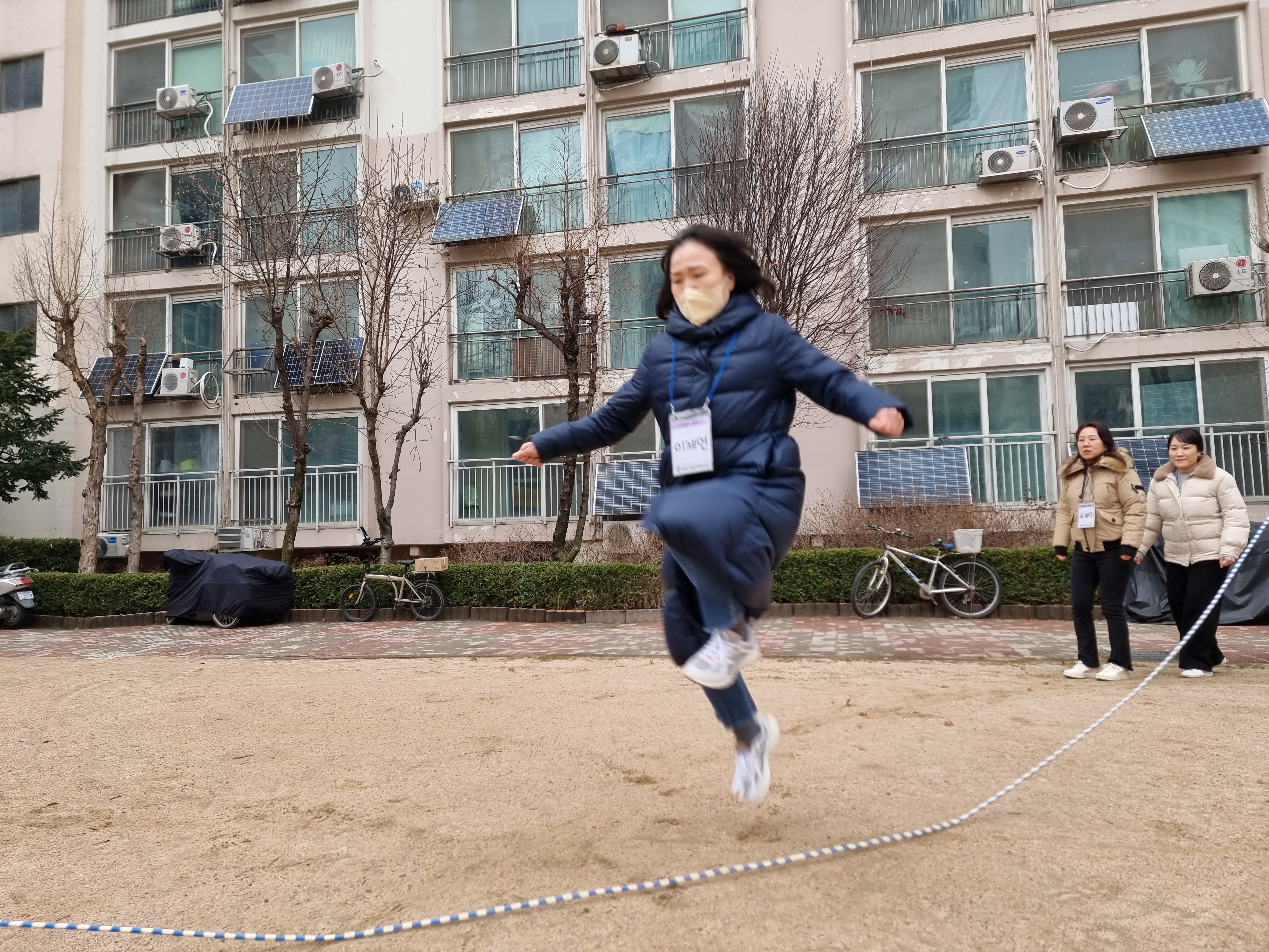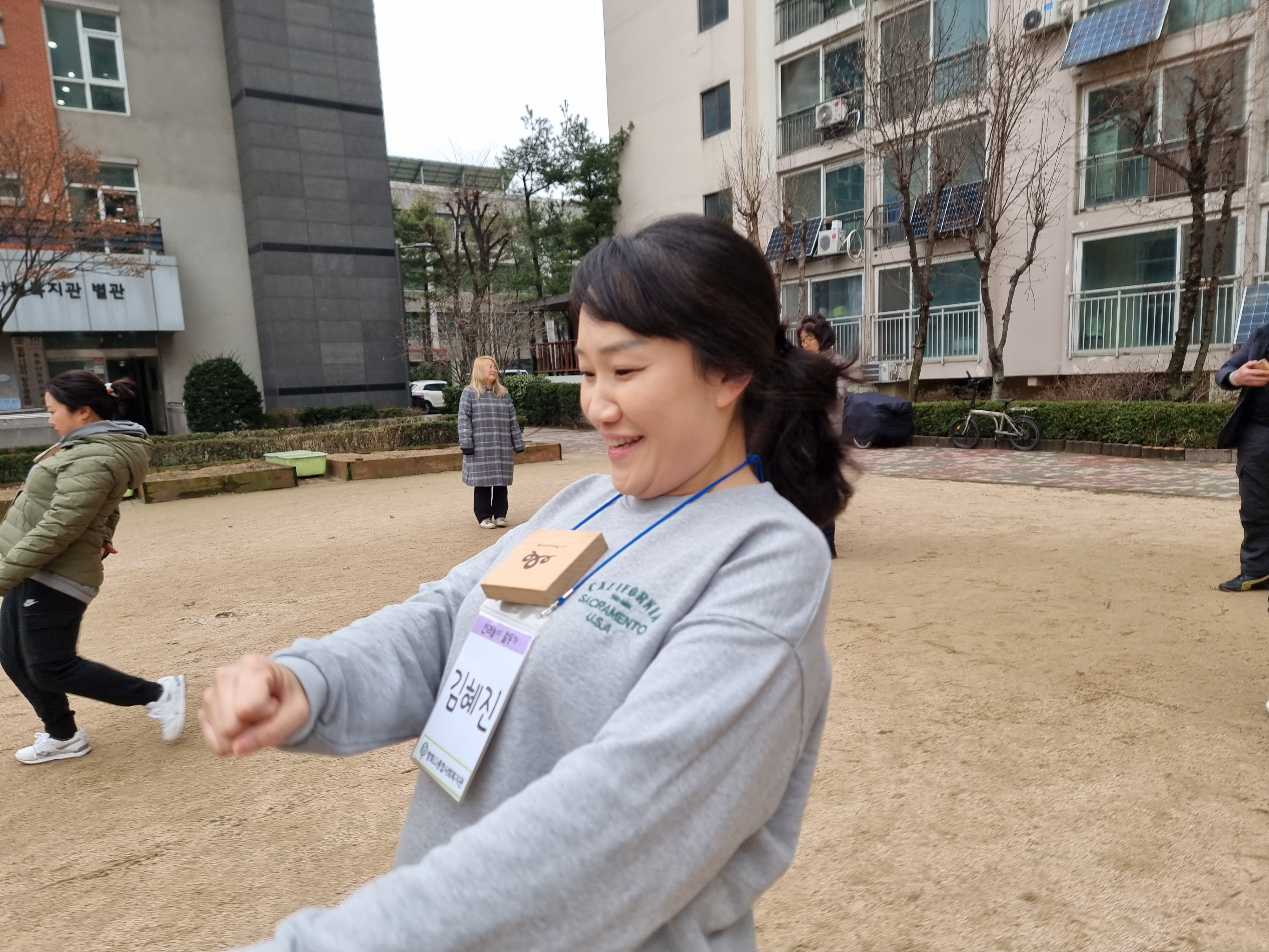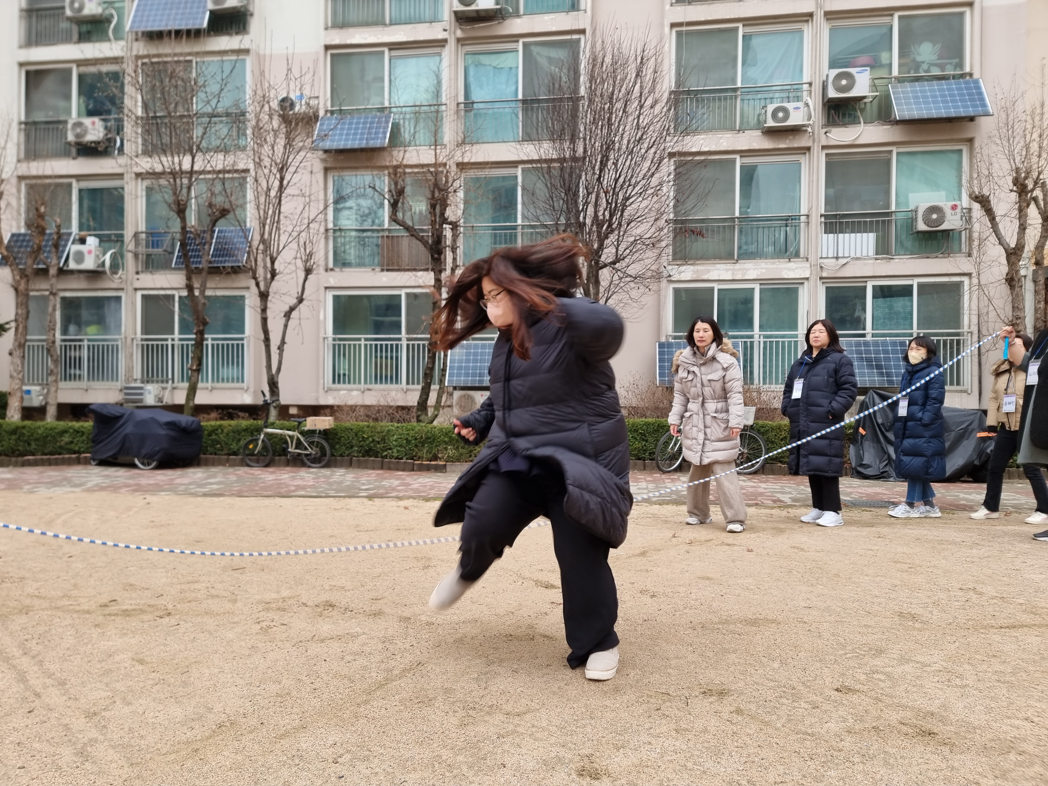 다음으로 단체 줄넘기를 했습니다. 먼저 강당에서 시작했는데 미끄러워 밖으로 나갔습니다. 조금 춥고 비온 뒤라 땅이 젖어 있지만 우리의 열정으로 나가기로 했습니다.
