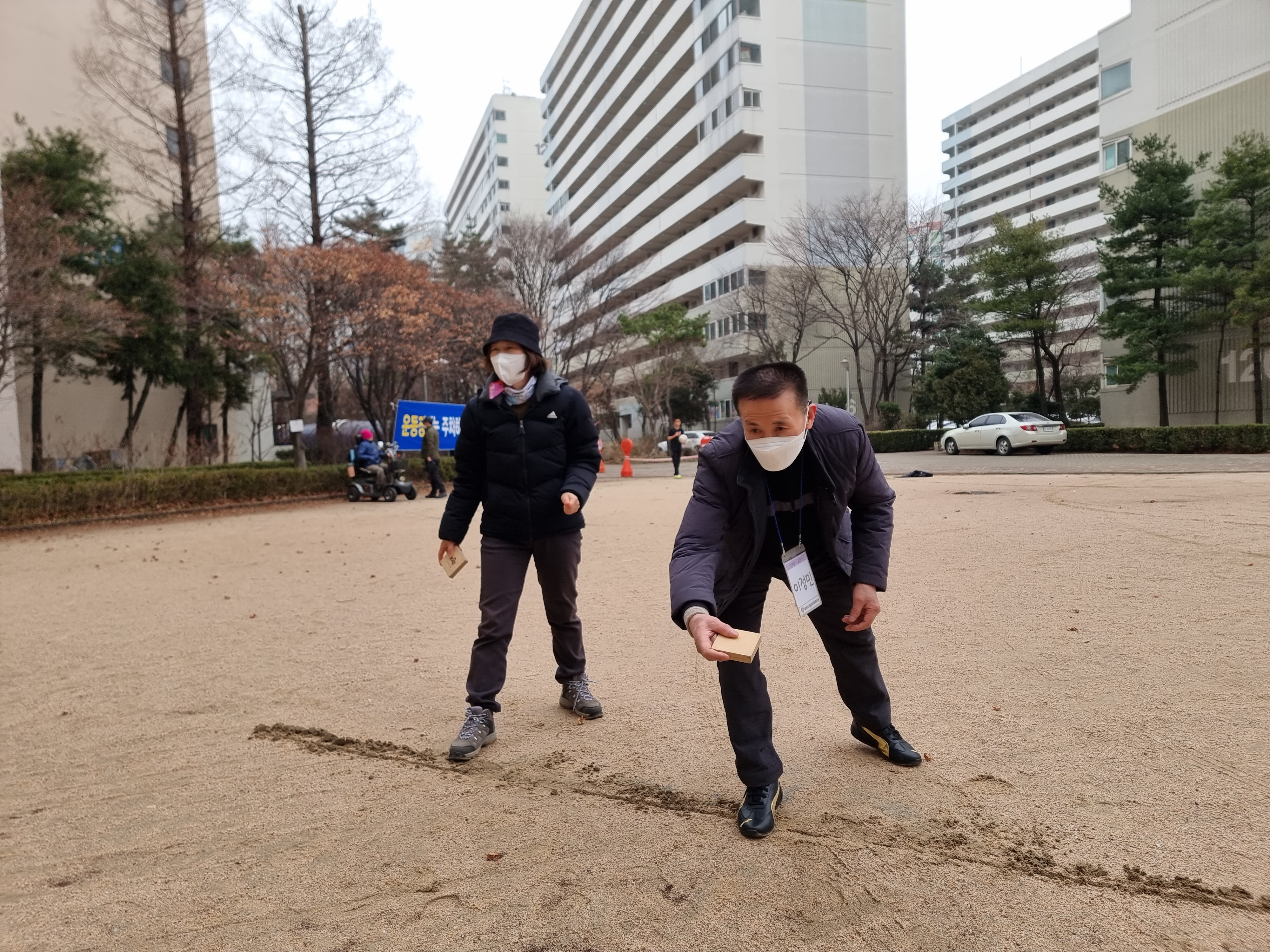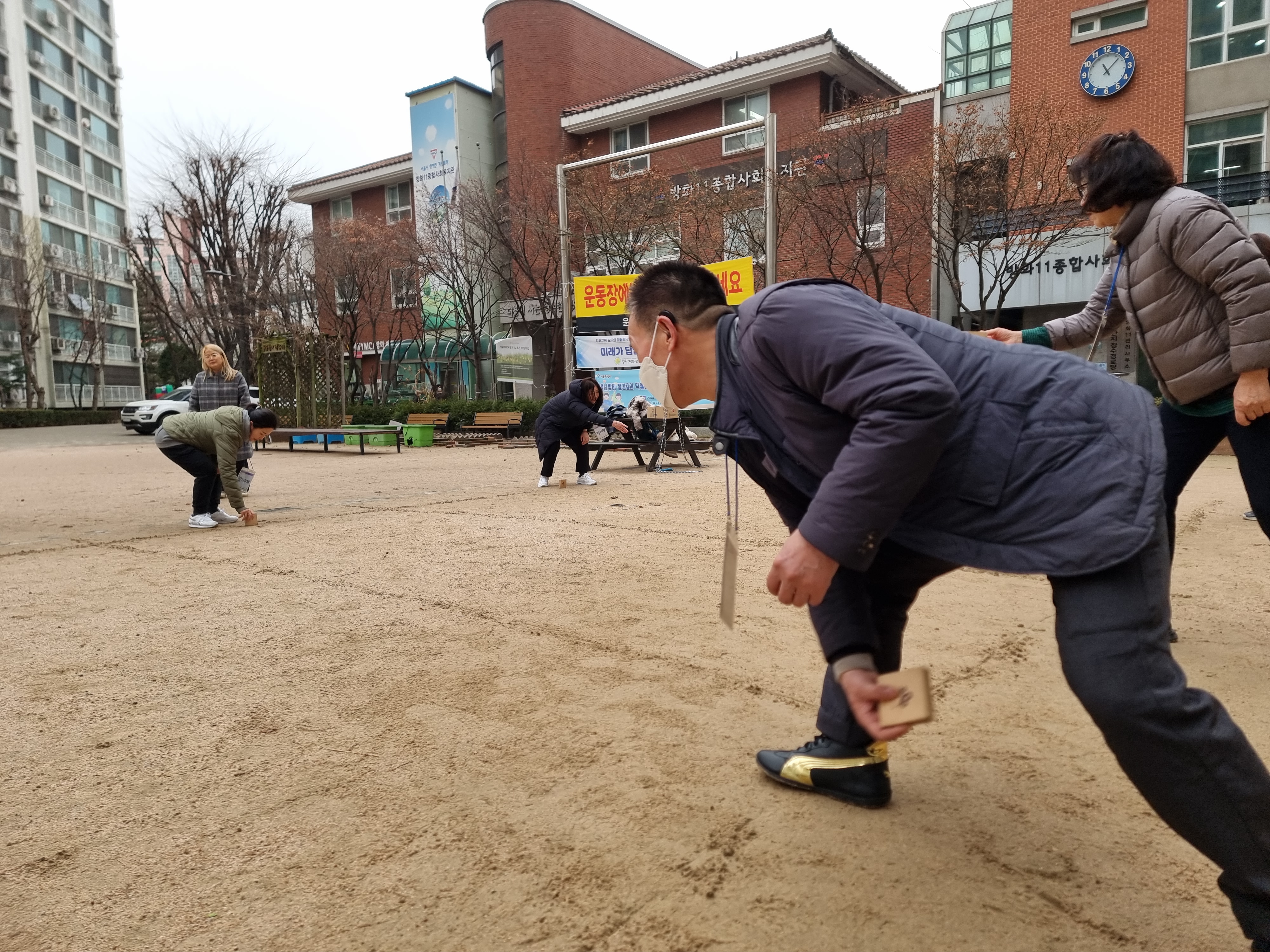 단연코 남성이신 황홍섭 우준하 이정민 님 놀라운 실력을 발휘했습니다. 이정민 님은 먼거리에서도 5번 연속 성공했습니다. 모두 감탄했습니다. 실뜨기는 그토록 어려워하셨는데 비석치기는 과연 놀이왕입니다. 잘하는 사람끼리는 다시 결승전을 했습니다. 결승에 올라온 분들은 전래놀이 한마당에서 비석치기를 담당해야 합니다. 초등학생 아이들에게 우상이 될 겁니다.