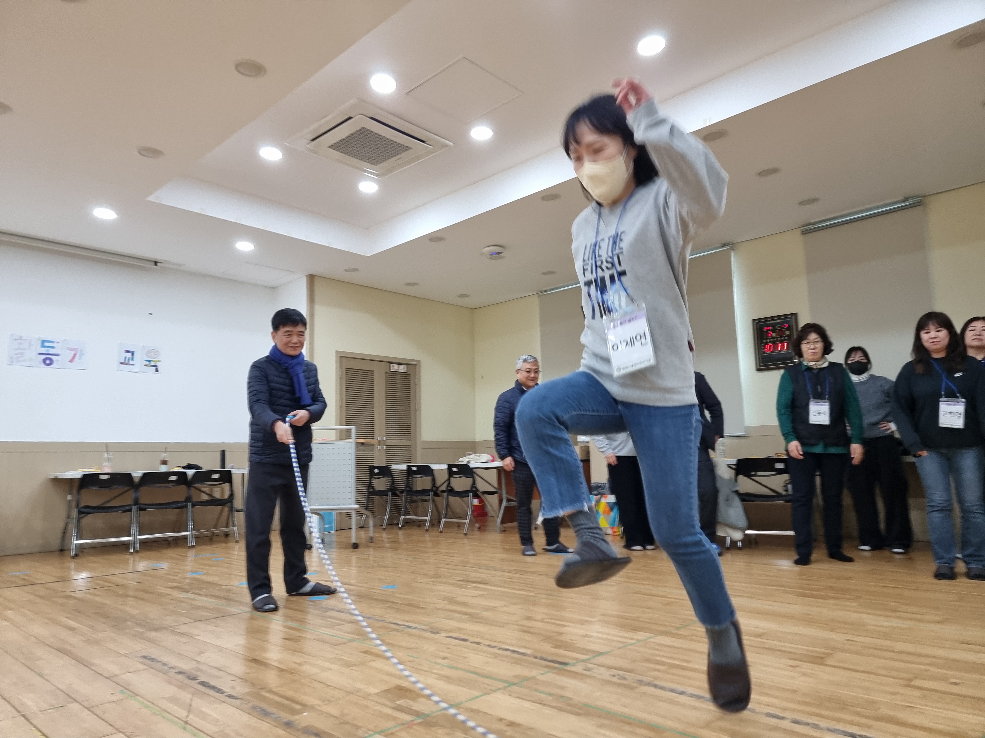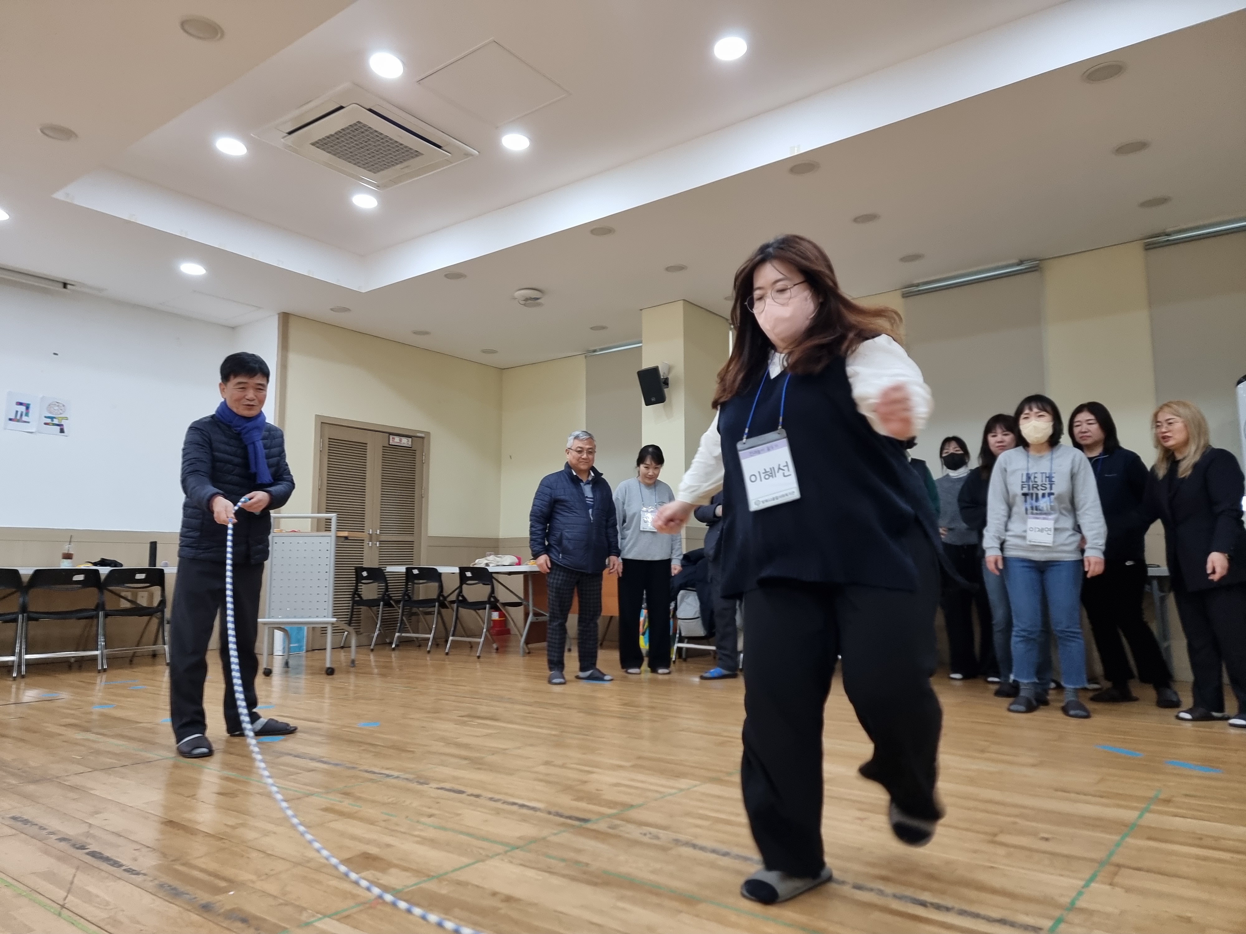여러번 시도 끝에 놀랍게도 50개를 넘겼습니다. 기적입니다. 나이도 많고 몸도 무겁고 요령도 없었는데 함께 서로를 응원하면서 하니 50개를 성공한 겁니다. 모두 환호했습니다. 서로를 기뻐했습니다. 교육생이 함께 하나되었습니다.