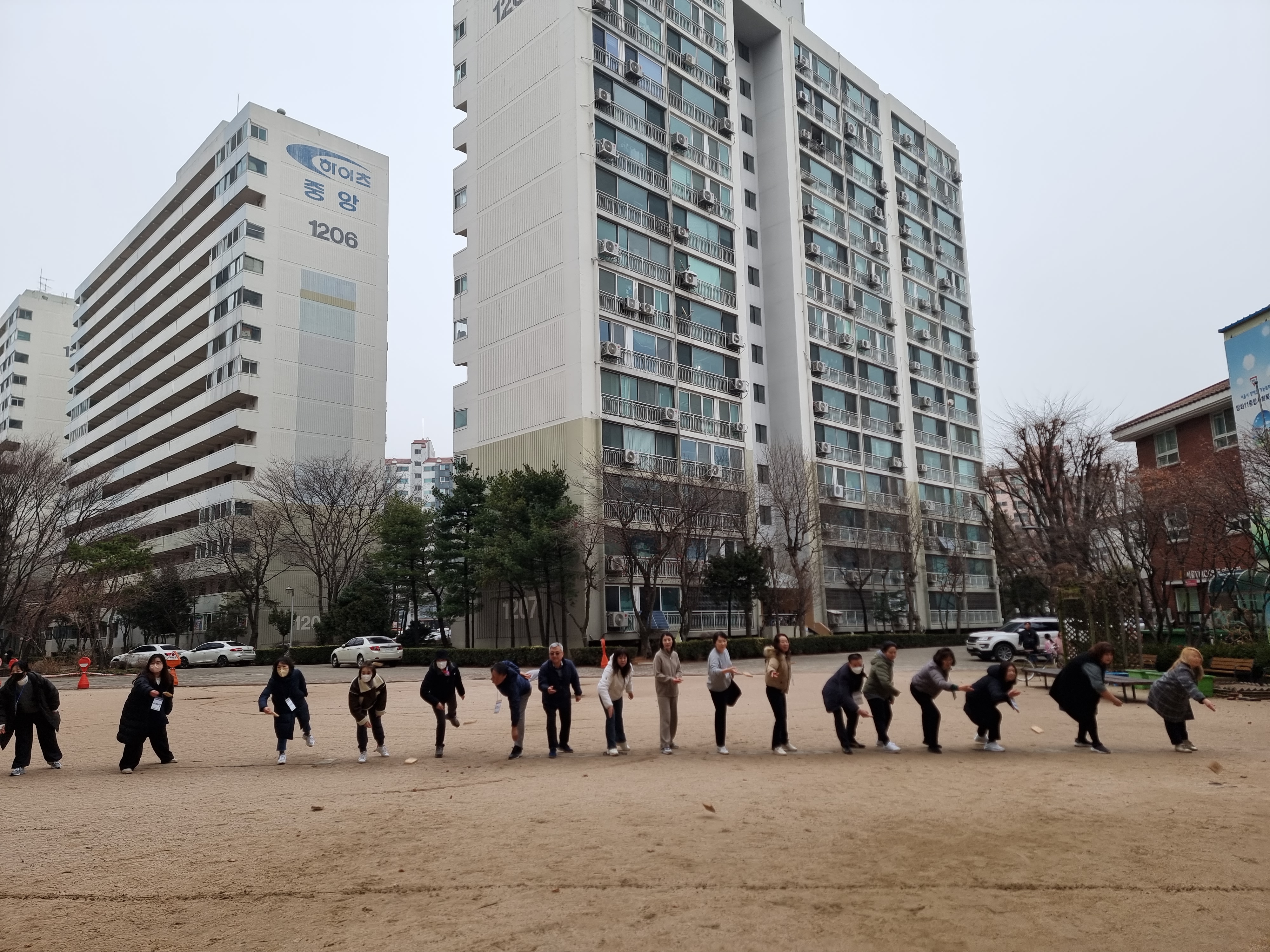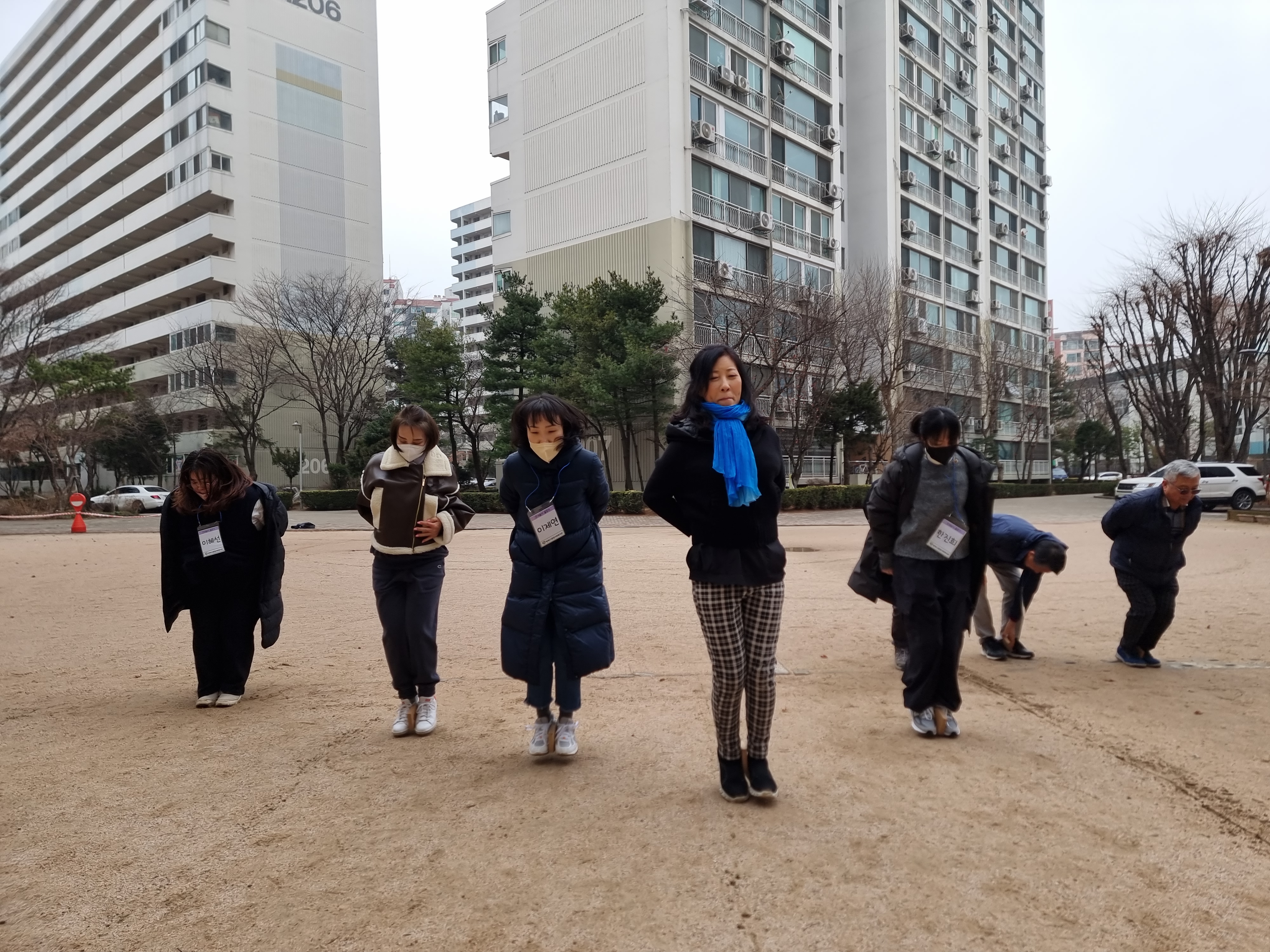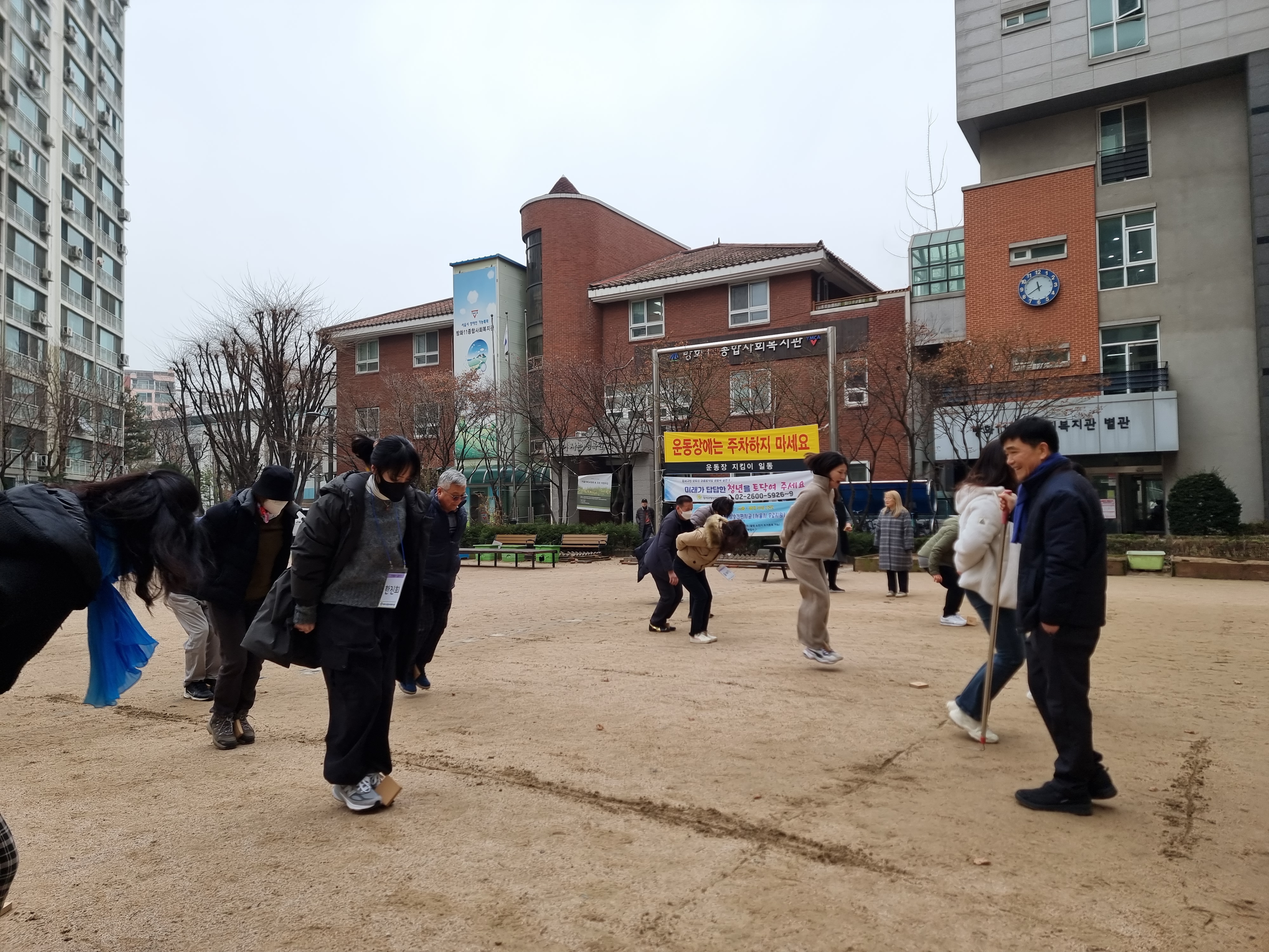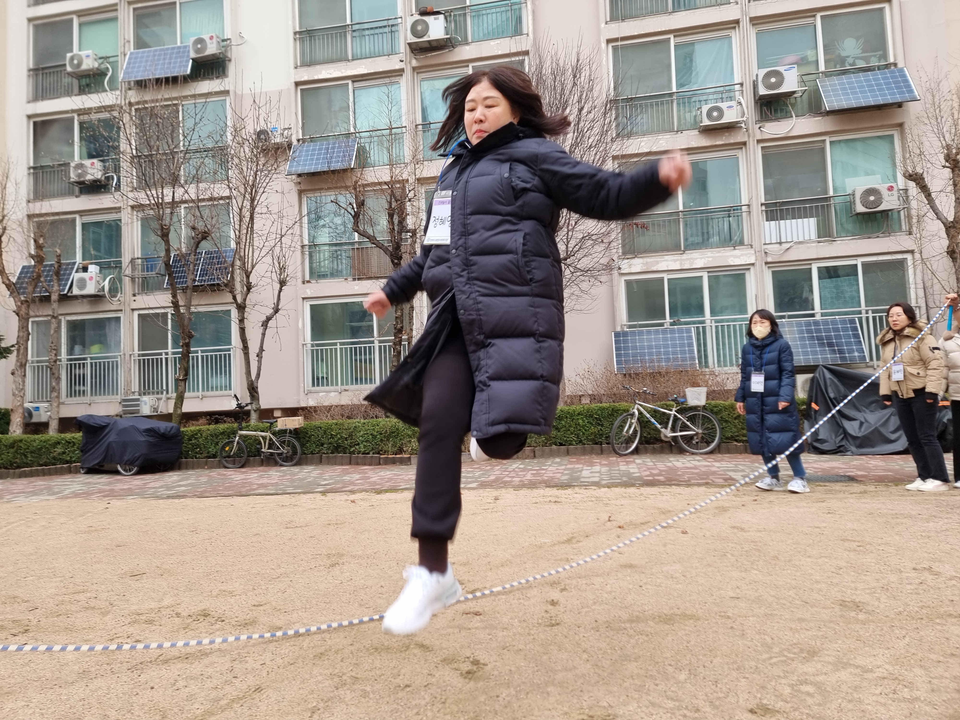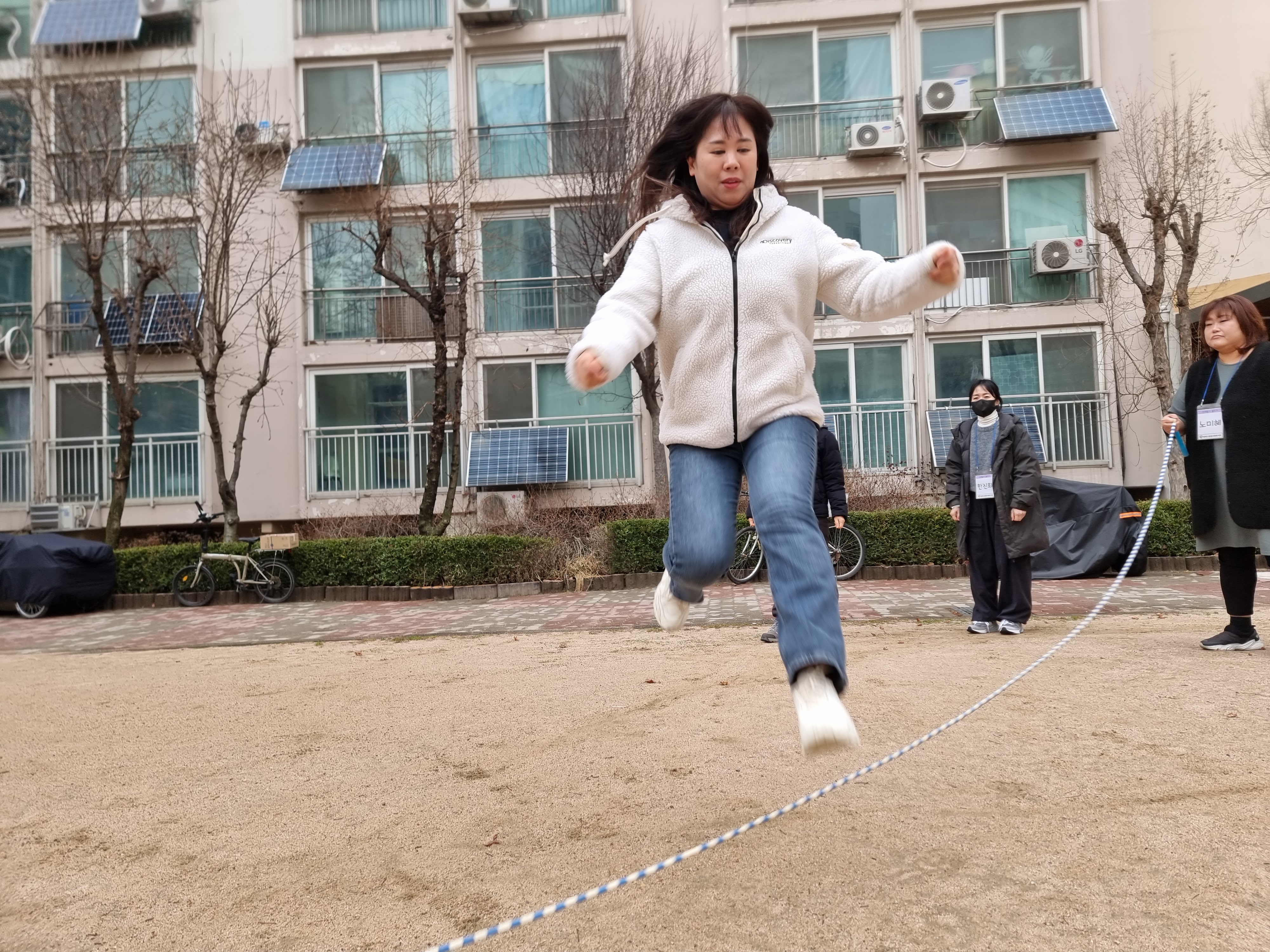 다음으로 단체 줄넘기를 했습니다. 먼저 강당에서 시작했는데 미끄러워 밖으로 나갔습니다. 조금 춥고 비온 뒤라 땅이 젖어 있지만 우리의 열정으로 나가기로 했습니다.
