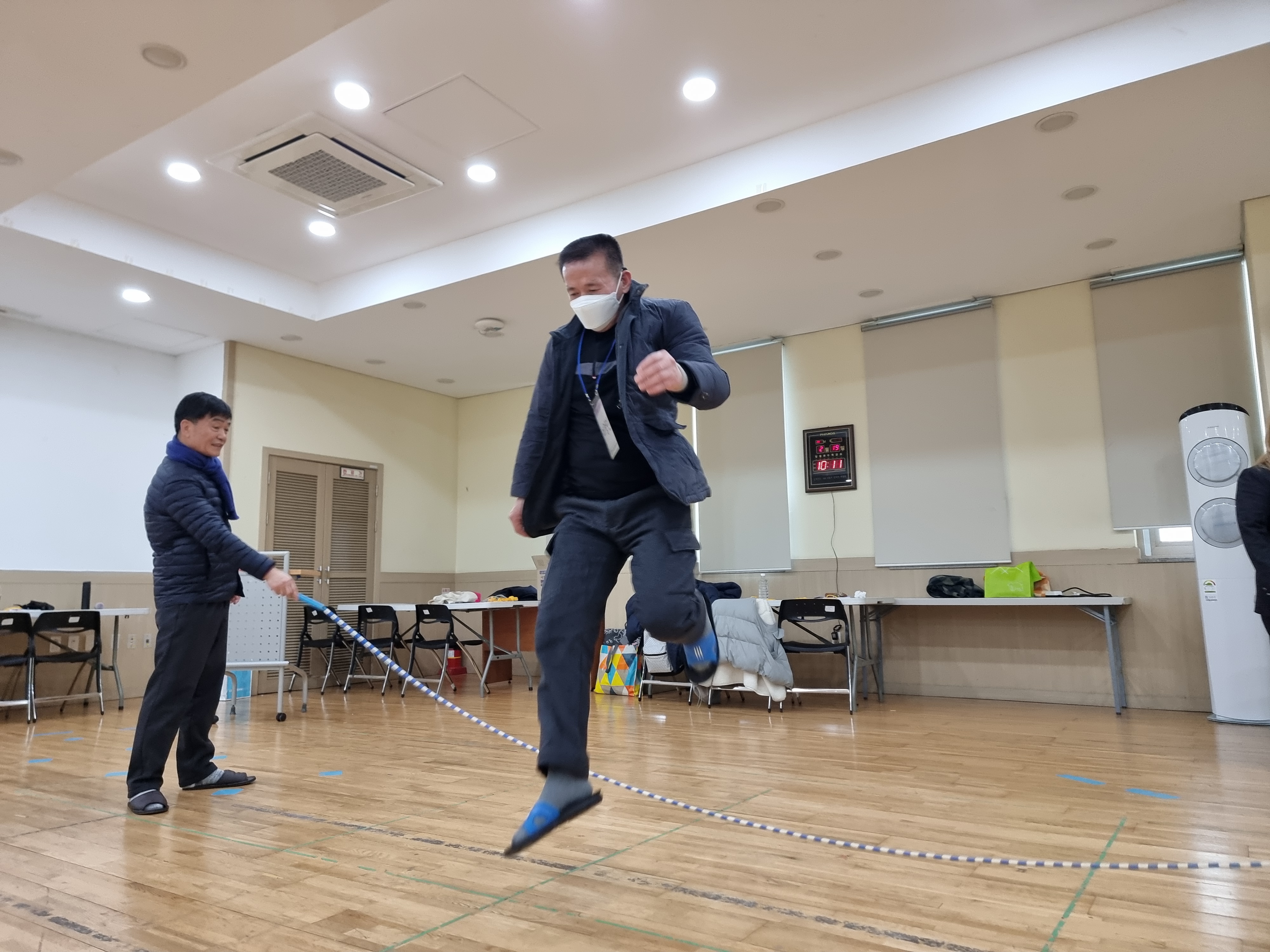 먼저 기본 동작을 했습니다. 어려운 동작을 하기 전에 줄넘기 기본을 먼저 배우는 겁니다. 줄넘기가 바닥에서 왔다갔다 하는 모습이 마치 파도처럼 생각하고 파도가 나갈 때 사람도 함께 나가는 겁니다. 이것이 익숙해지니 양쪽에서 줄을 돌리고 사람이 한명 씩 들어가 뛰고 나왔습니다. 처음에는 3~4명도 하지 못했습니다. 이상호 선생님께서 요령을 알려주시고 계속 응원해 주셨습니다. 30개를 목표로 시도했습니다. 20개가 넘어서 걸렸습니다. 그래도 다시 해보자고 했습니다.