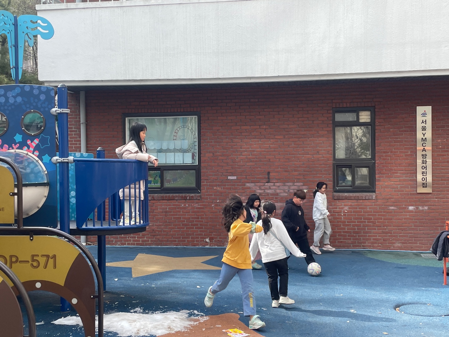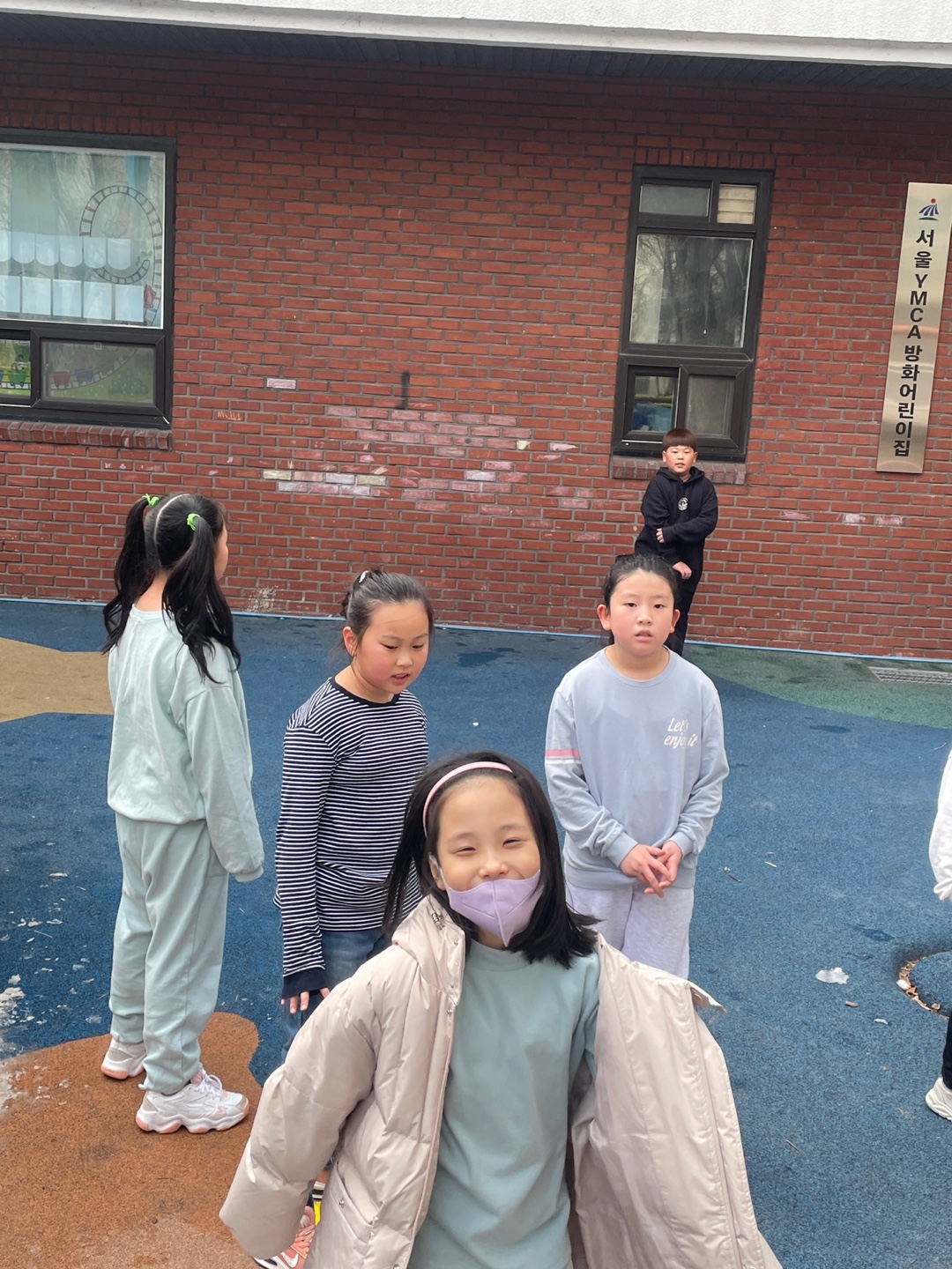 다같이 복지관 옆 놀이터에서 축구도 하고 얼음땡 놀이했습니다. 이미 지난 화요일에 얼음땡 해본 예서, 예주, (황)지유, 시은이, (서)지유, 하선이가 아이들에게 놀이 규칙 설명해주었습니다. 아직은 다른 아이들과 어색한 연아와 재영이는 놀이터 벽에 있는 퍼즐놀이 했습니다.