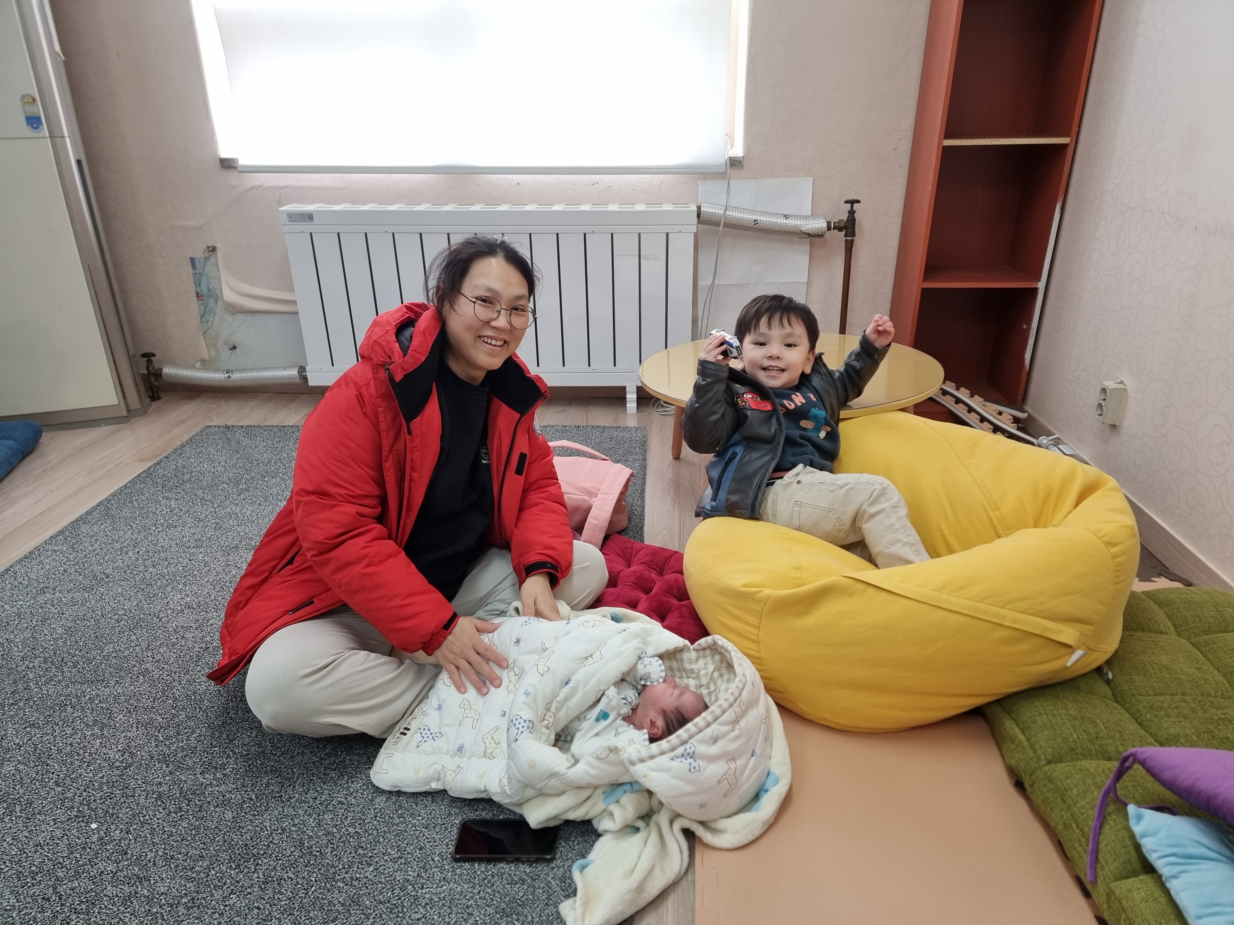 특별히 출산한 지 19일 밖에 되지 않은 정연희 님께서 신생아 하영이를 데리고 오셨습니다. 가족 7명이 복지관에 총출동 했습니다. 1시간 전부터 마실을 따뜻하게 데워두었습니다. 정연희 님과 하영이가 힘들 때 쉴 수 있는 공간입니다. 막내 하영이가 언니오빠 사이에 인기가 많습니다. 함께 인사 나눴습니다.