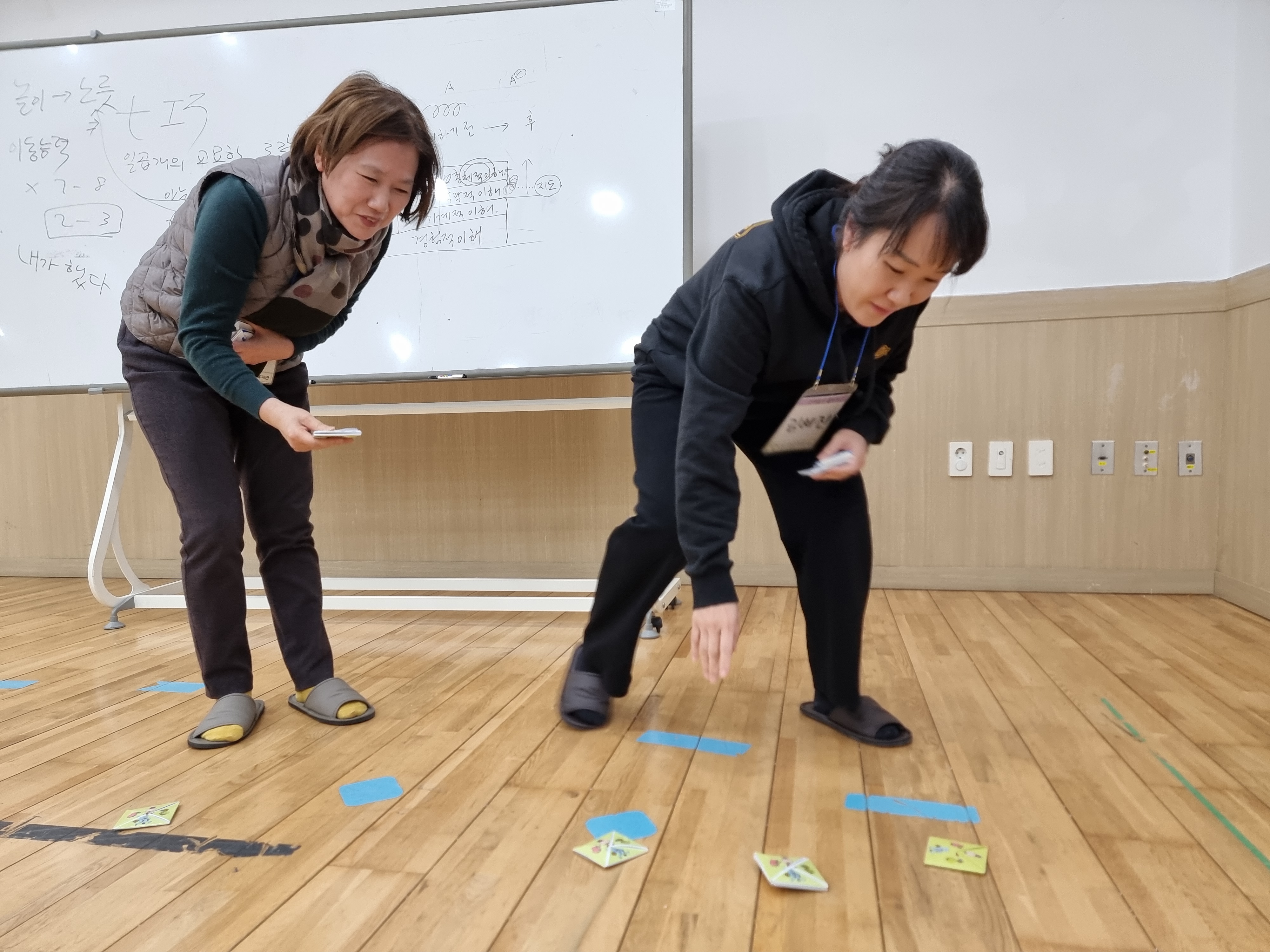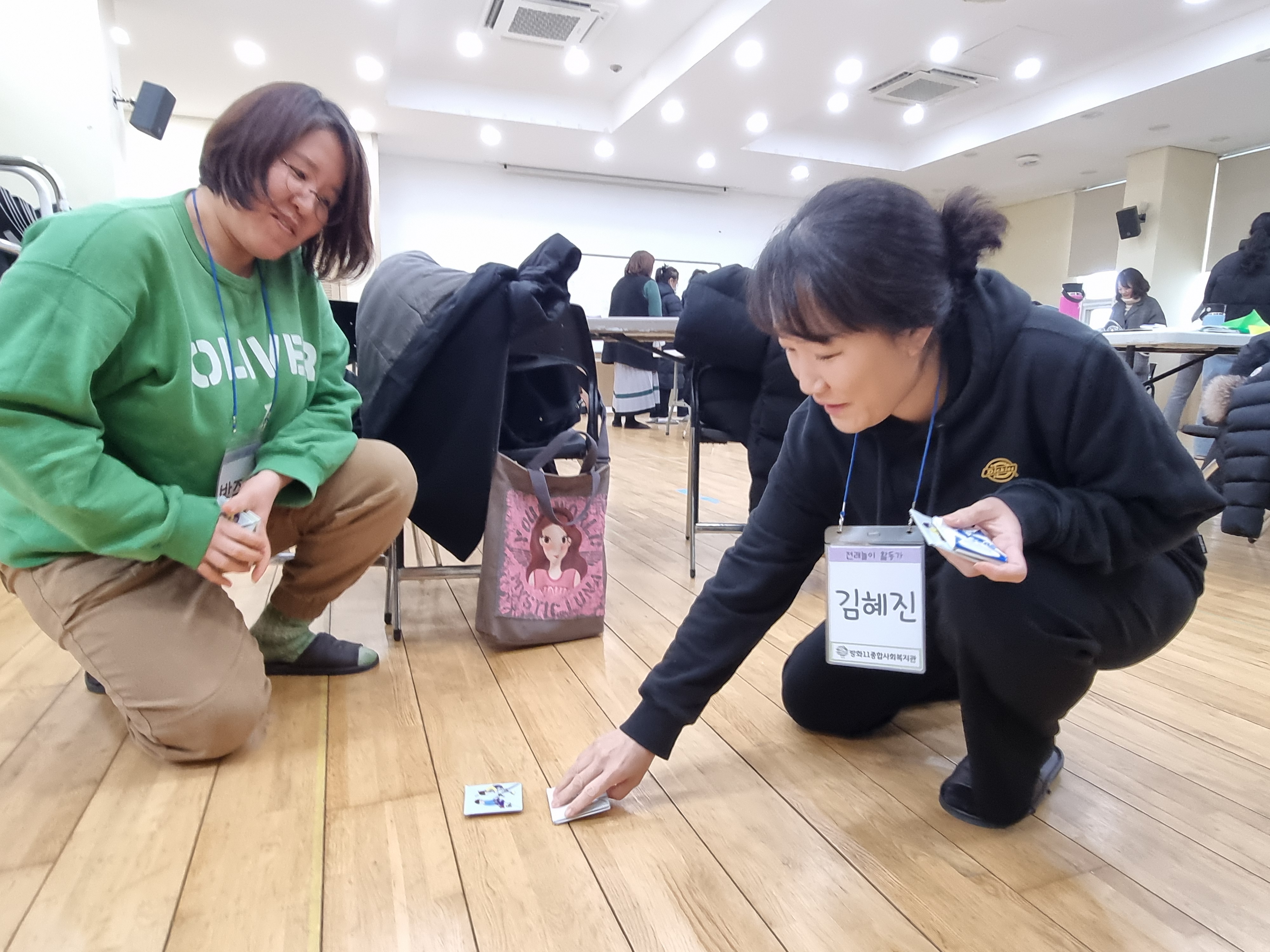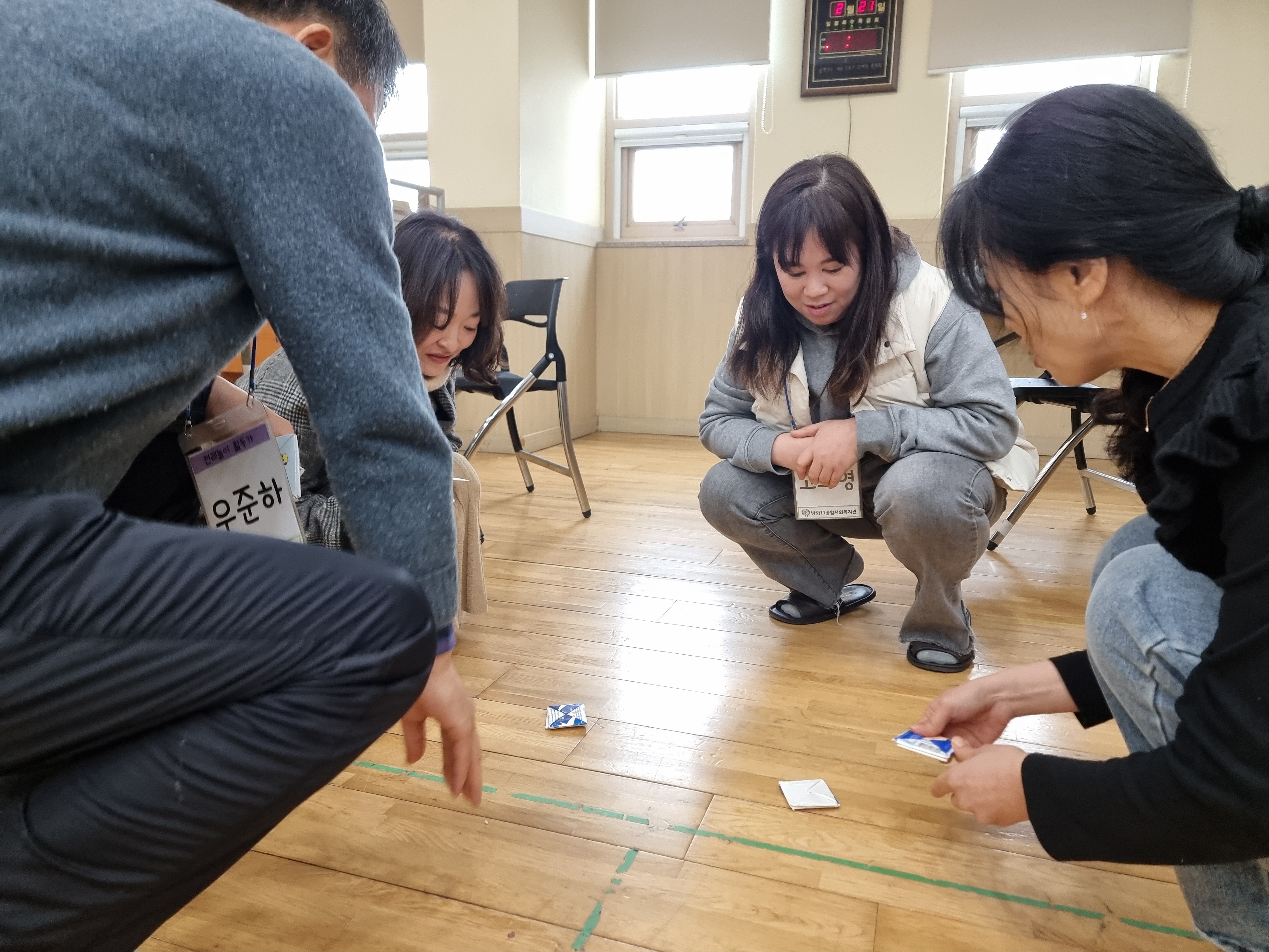 딱지치기를 배웠습니다. 딱지를 접는 방법부터 직접 딱지를 따는 놀이를 했습니다. 옛날에는 종이가 귀한 시절이라 딱지 자체가 귀했는데 지금은 누구나 쉽게 종리를 구할 수 있습니다. 딱지의 재미를 찾는 방법도 알려주셨습니다.