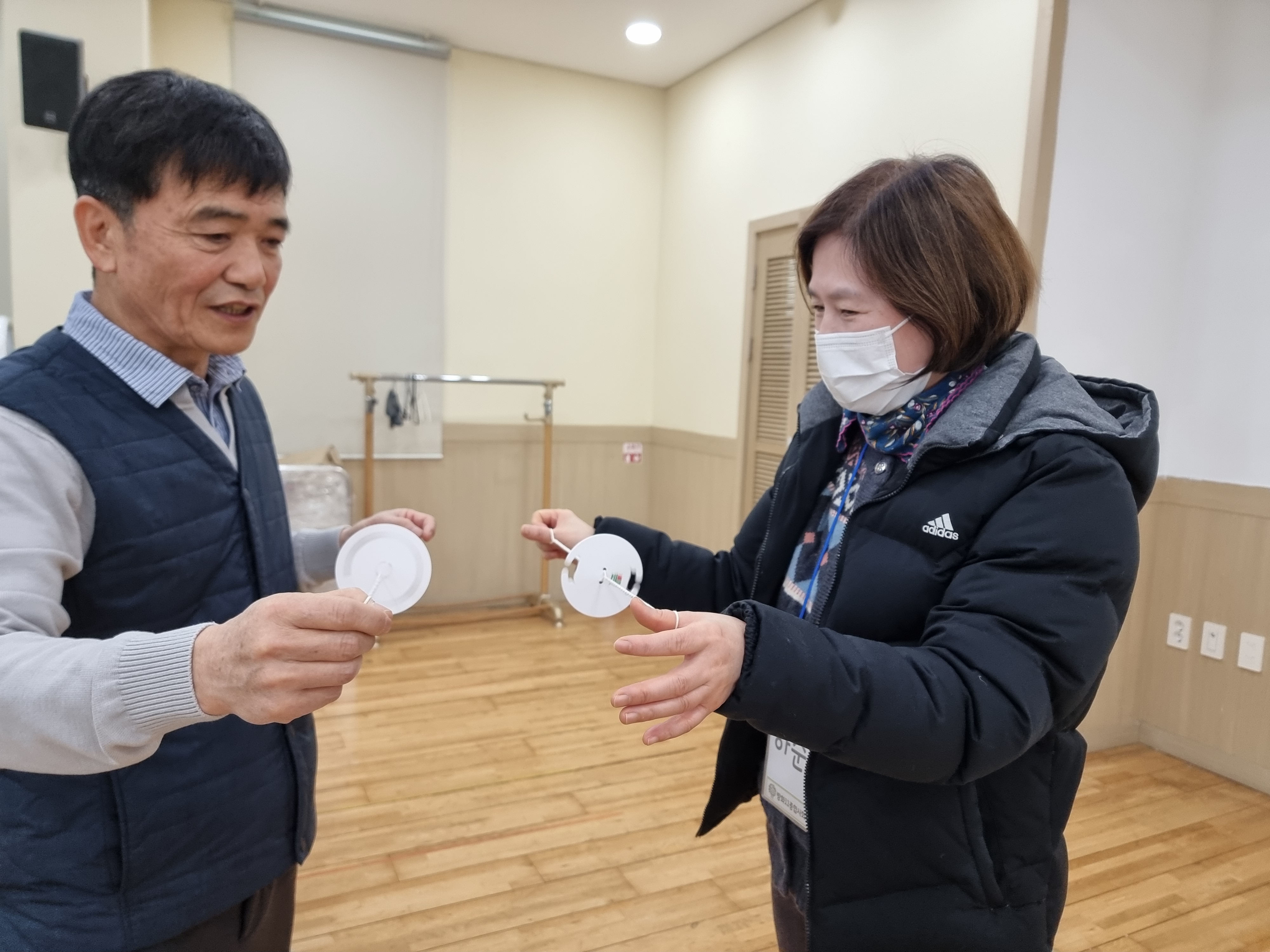 쌩쌩이를 했습니다. 옛날에는 실에 단추를 넣어서 돌렸다고 합니다. 양손을 잡고 몇 번 튕기면서 종이가 돌아갑니다. 잘하시는 분들이 많았습니다. 저는 어려웠습니다. 그런데 신기하게도 홍문주 선생님이 양손을 잡고 몇 번 튕기면 금세 종이가 돌아갑니다. 이상호 선생님은 양손과 양발로 돌리는 묘기를 보여주셨습니다. 역시 전래놀이 고수입니다.