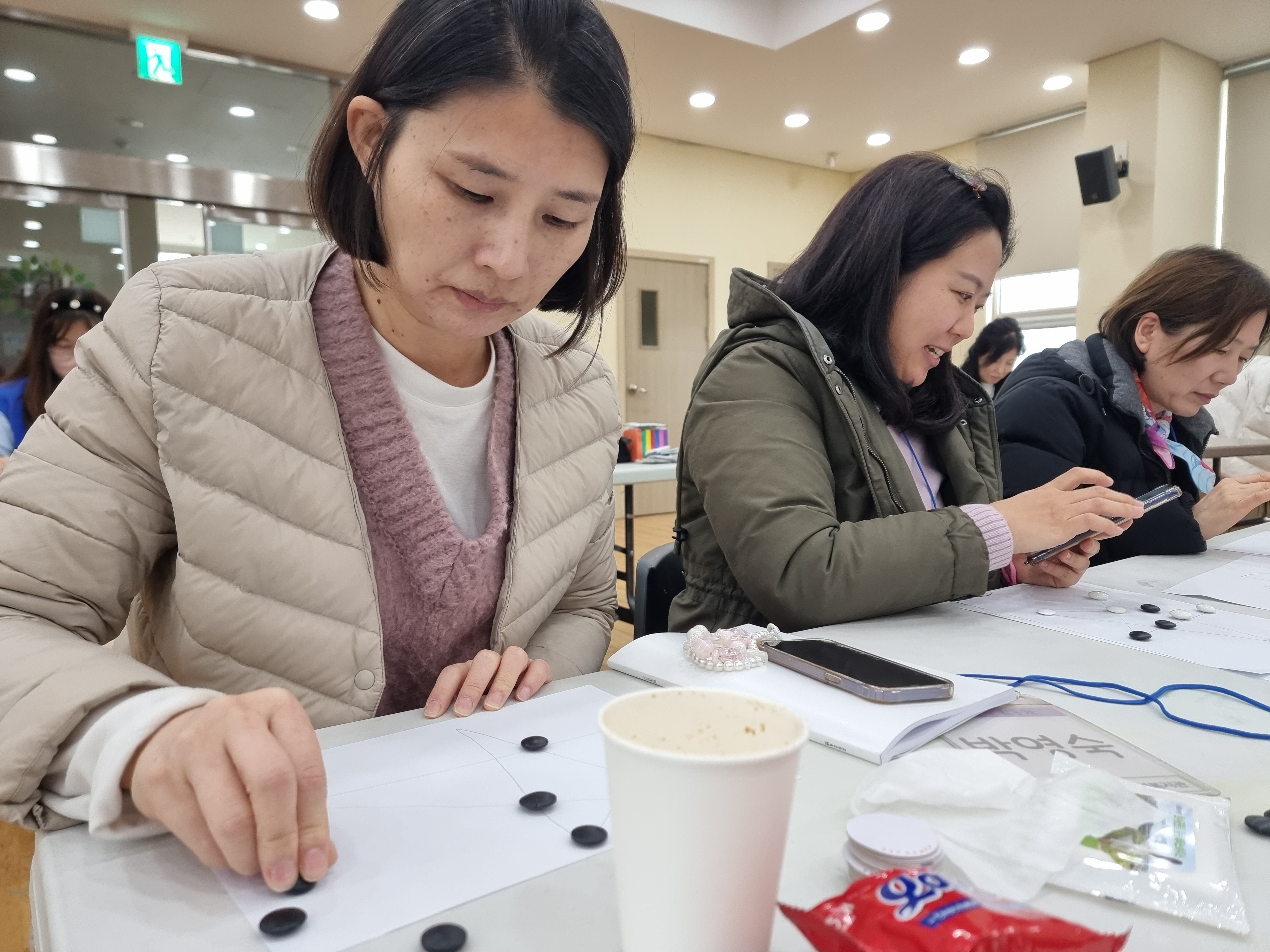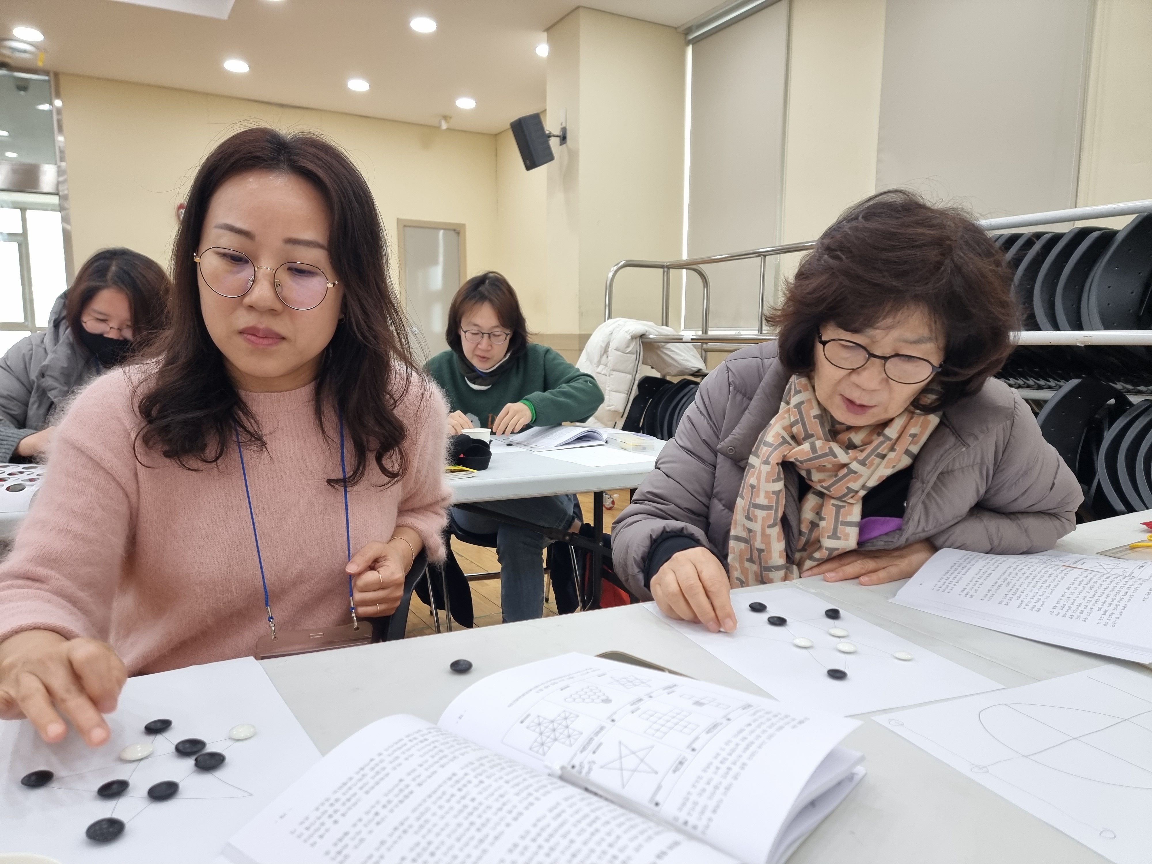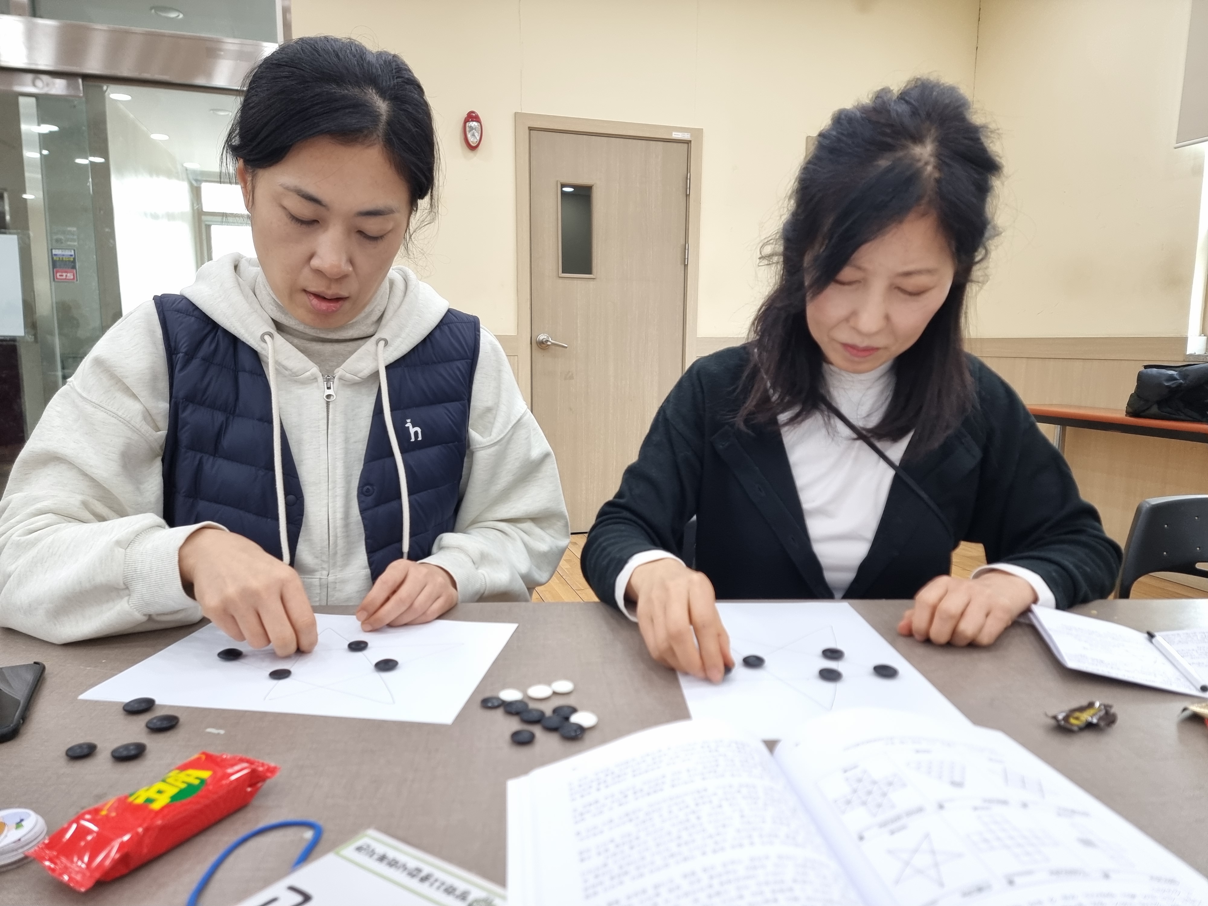 고누놀이를 배웠습니다. 종이에 그림판을 그리고 바둑알로 손쉽게 할 수 있는 놀이입니다. 둘씩 짝지어 대결했습니다. 저는 이정민 님과 했습니다. 업치락 뒤치락 했지만 결국에는 이정민 님이 이겼습니다. 연습이 필요해 보입니다. 혼자하는 고누놀이도 있습니다. 머리를 싸메고 천천히 도전해서 미션을 완수해야 합니다.