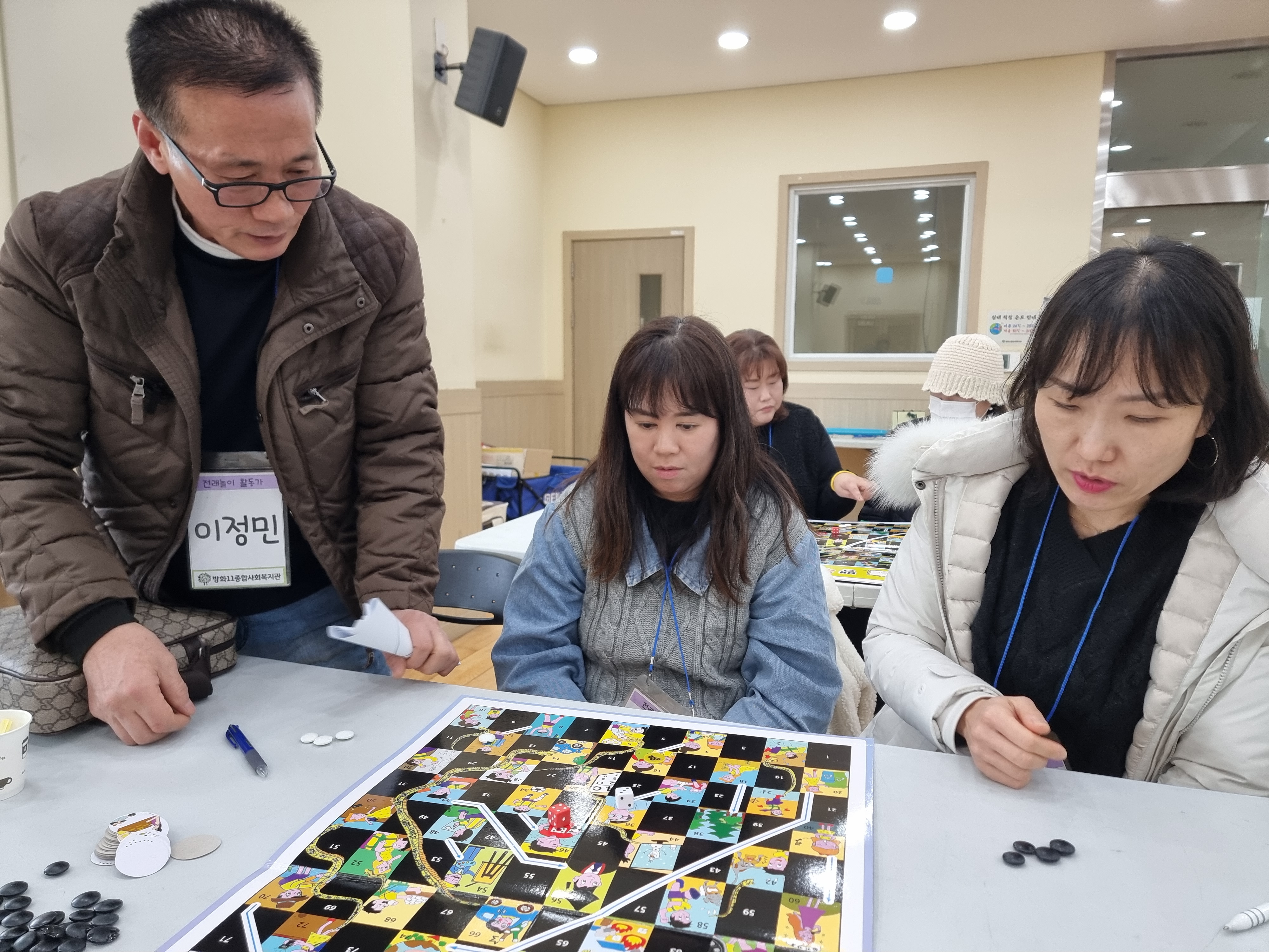 뱀주사위놀이도 했습니다. 주사위 2개로 사다리를 타고 정상까지 올라가는 겁니다. 예전과 달리 현대에 맞게 재구성했습니다. 뱀주사위놀이를 이긴 사람에게 이 판을 선물로 주셨습니다. 집에서 자녀와 재미있게 할 수 있는 놀이도구를 선물 받은 겁니다.