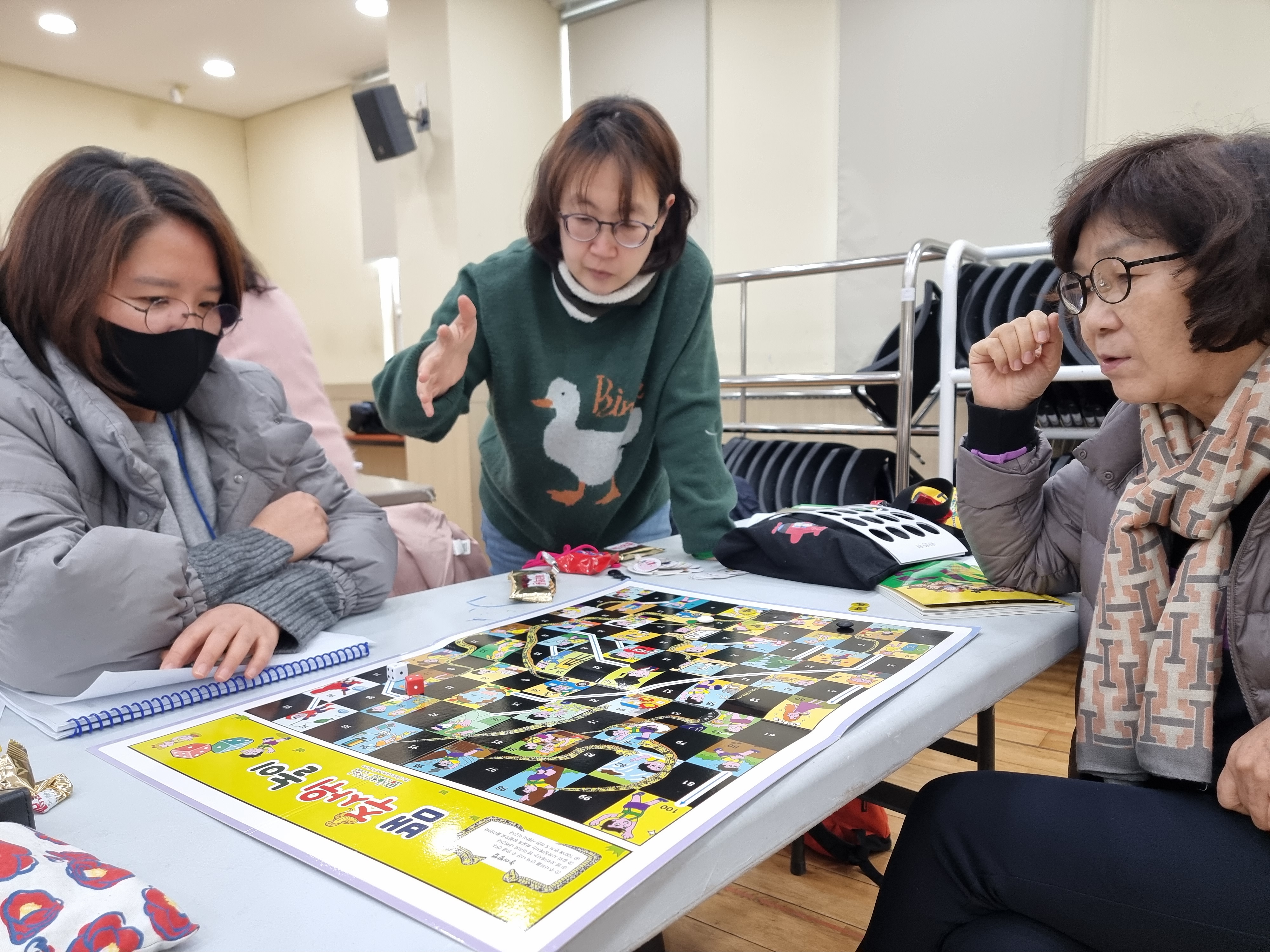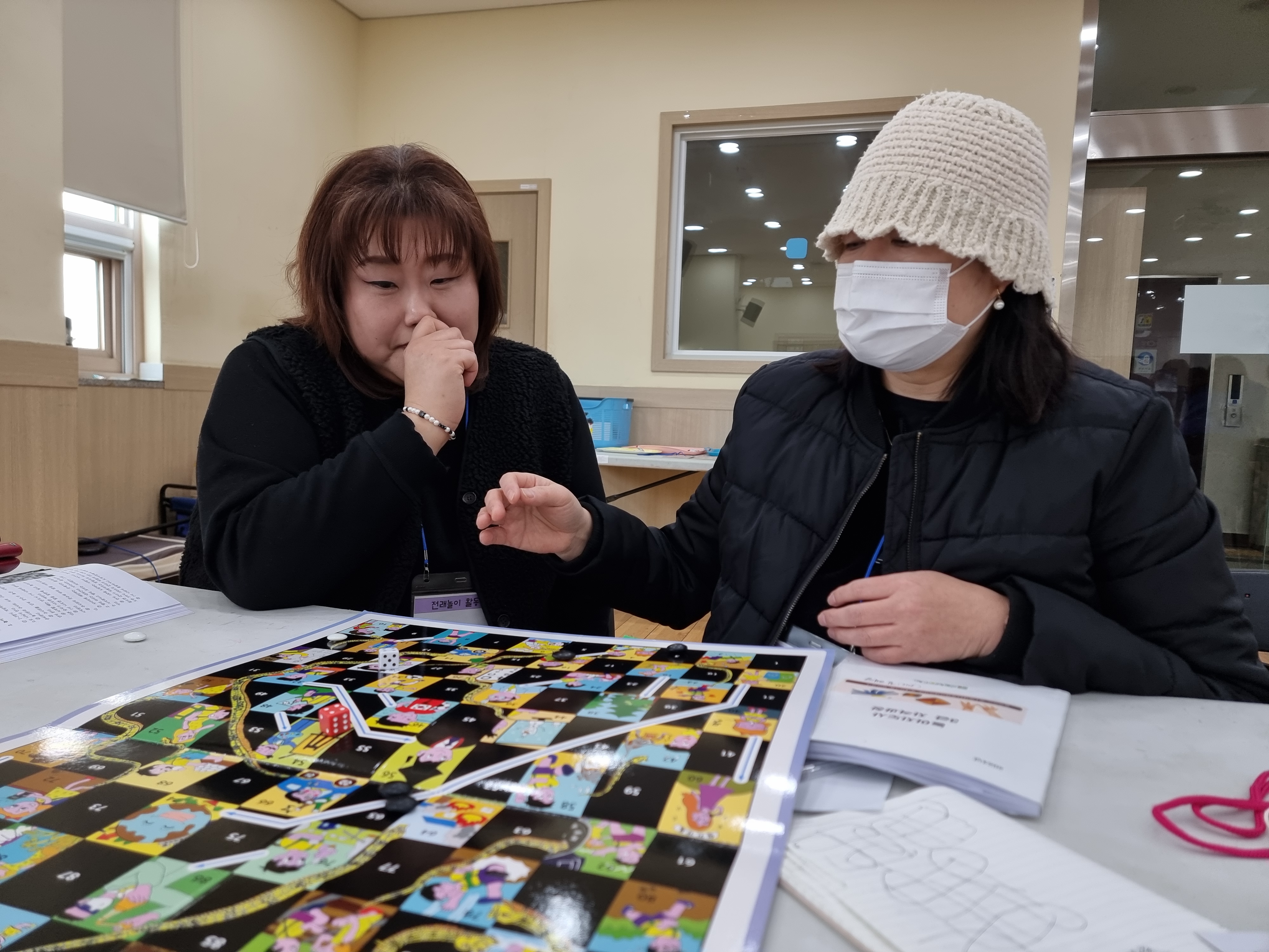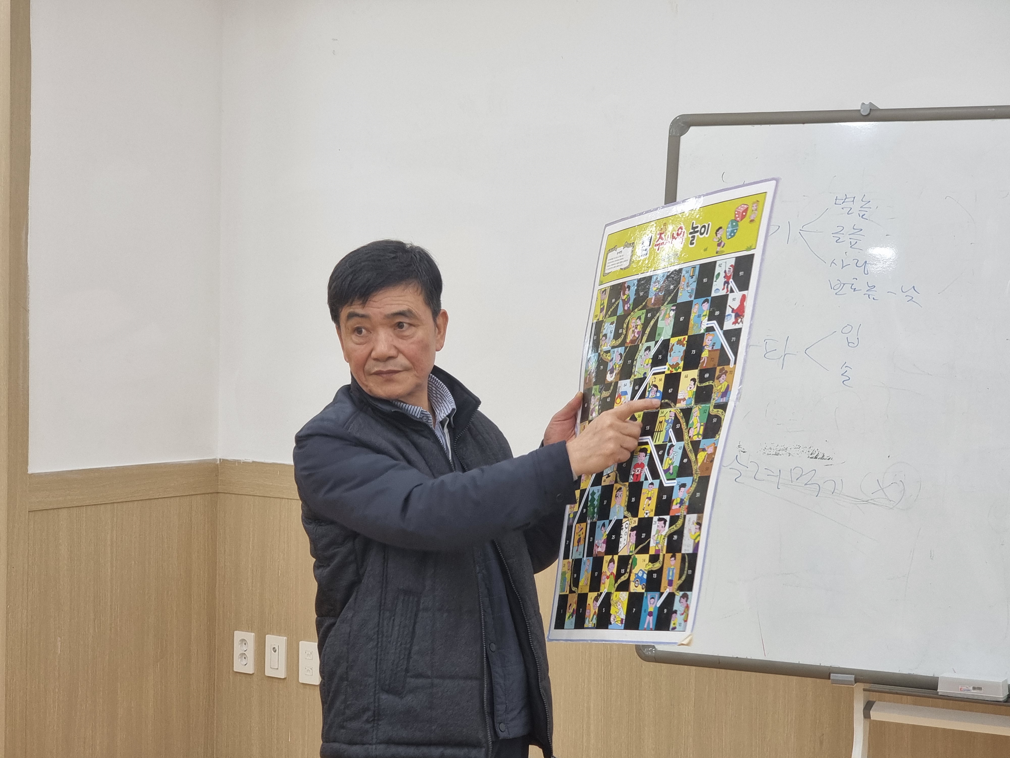 뱀주사위놀이도 했습니다. 주사위 2개로 사다리를 타고 정상까지 올라가는 겁니다. 예전과 달리 현대에 맞게 재구성했습니다. 뱀주사위놀이를 이긴 사람에게 이 판을 선물로 주셨습니다. 집에서 자녀와 재미있게 할 수 있는 놀이도구를 선물 받은 겁니다.