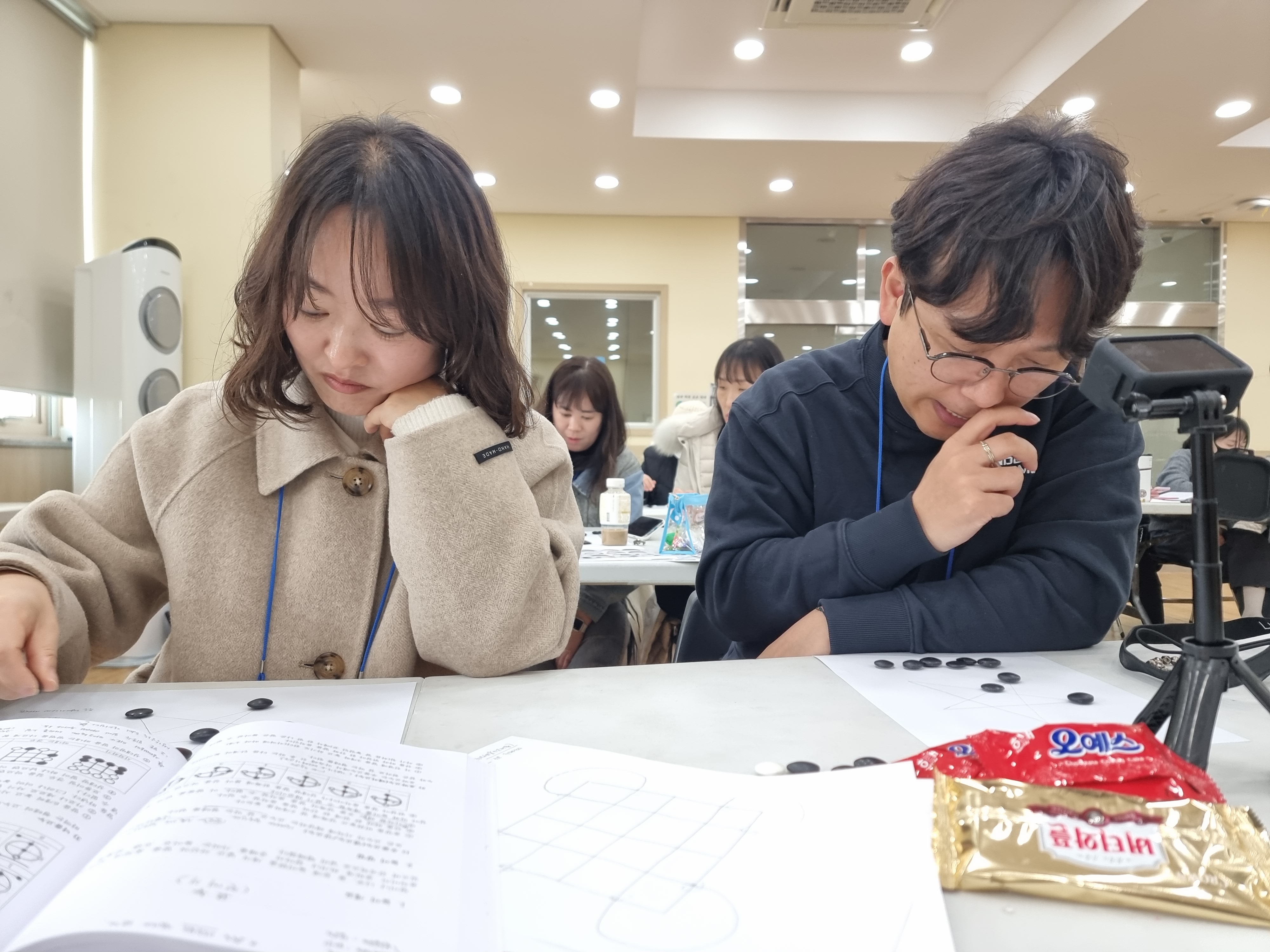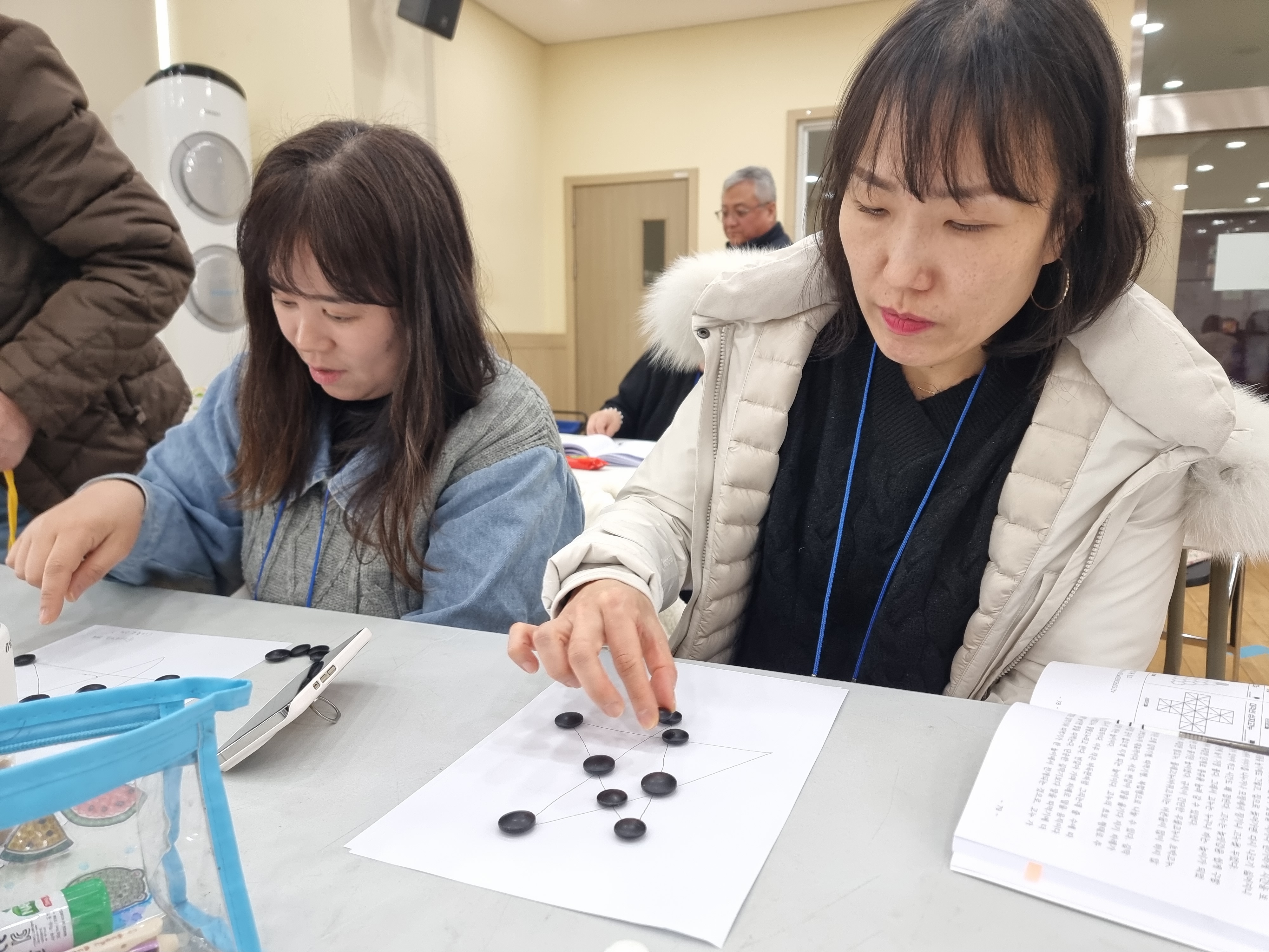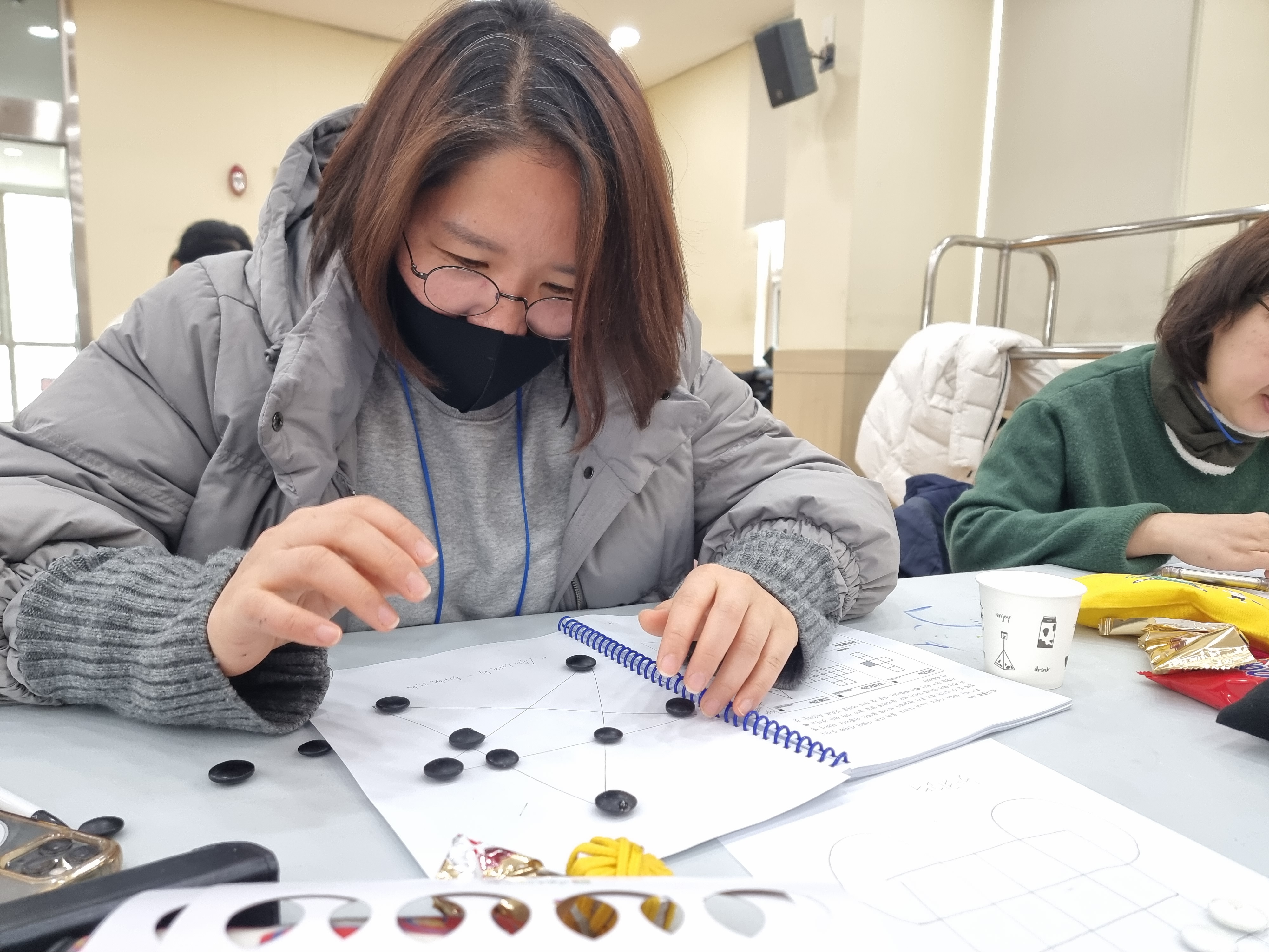 고누놀이를 배웠습니다. 종이에 그림판을 그리고 바둑알로 손쉽게 할 수 있는 놀이입니다. 둘씩 짝지어 대결했습니다. 저는 이정민 님과 했습니다. 업치락 뒤치락 했지만 결국에는 이정민 님이 이겼습니다. 연습이 필요해 보입니다. 혼자하는 고누놀이도 있습니다. 머리를 싸메고 천천히 도전해서 미션을 완수해야 합니다.