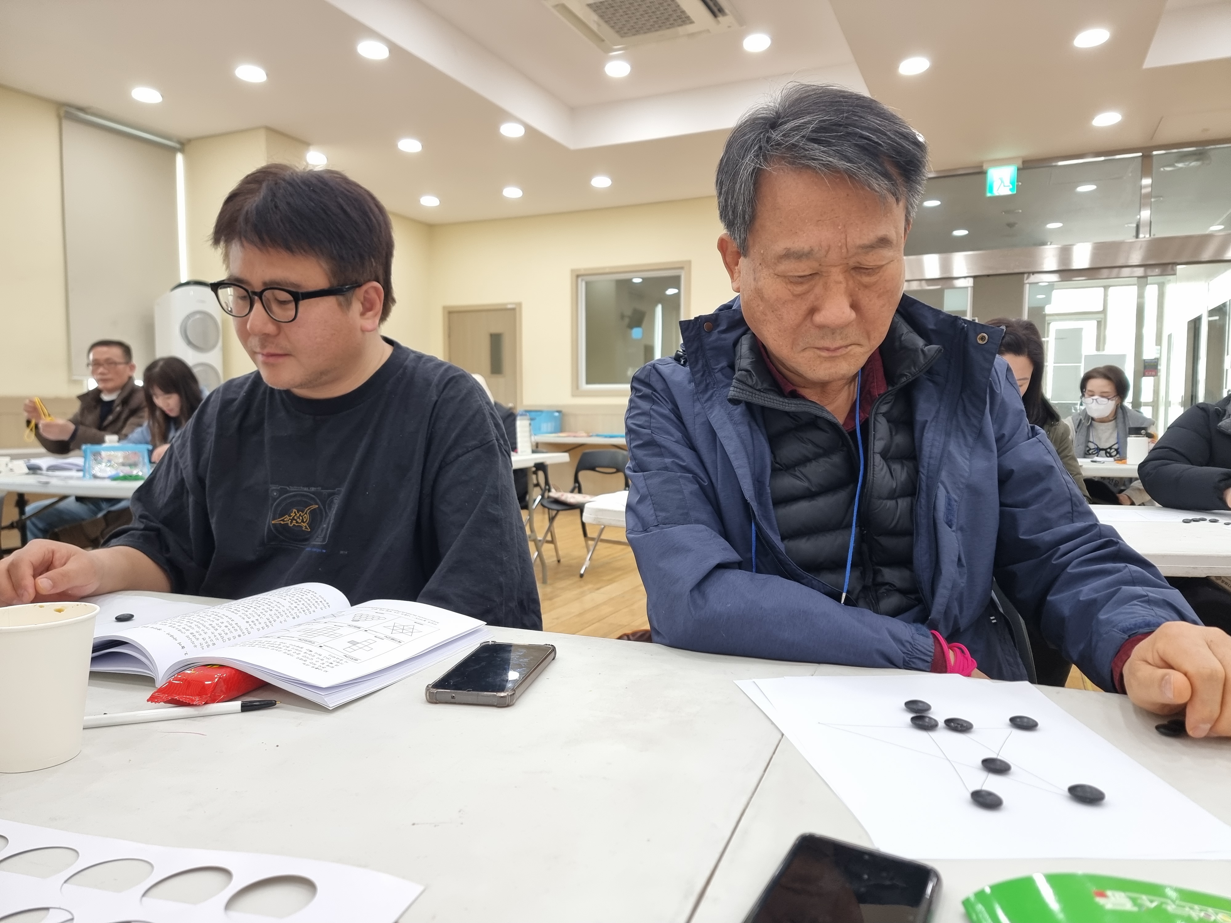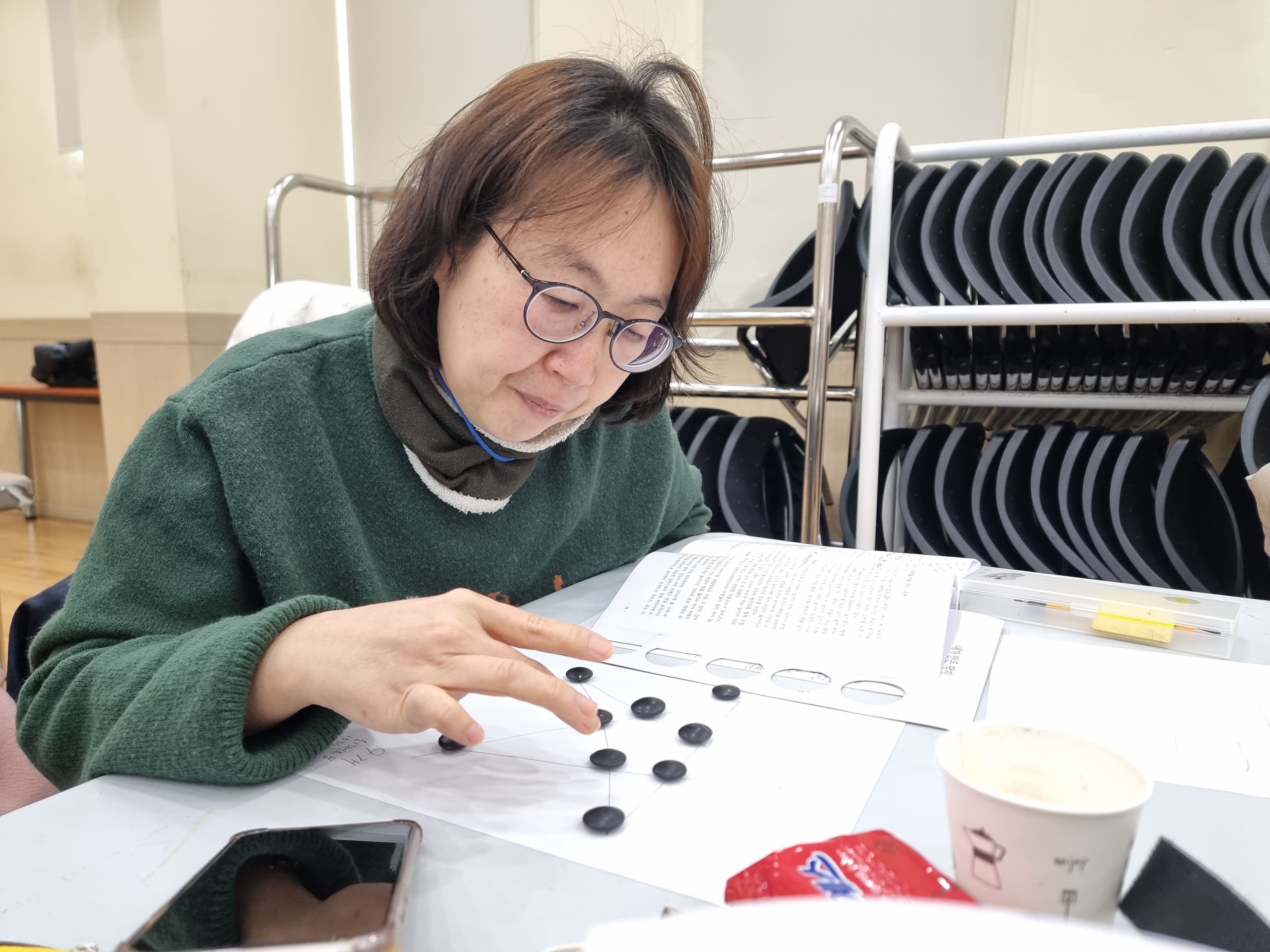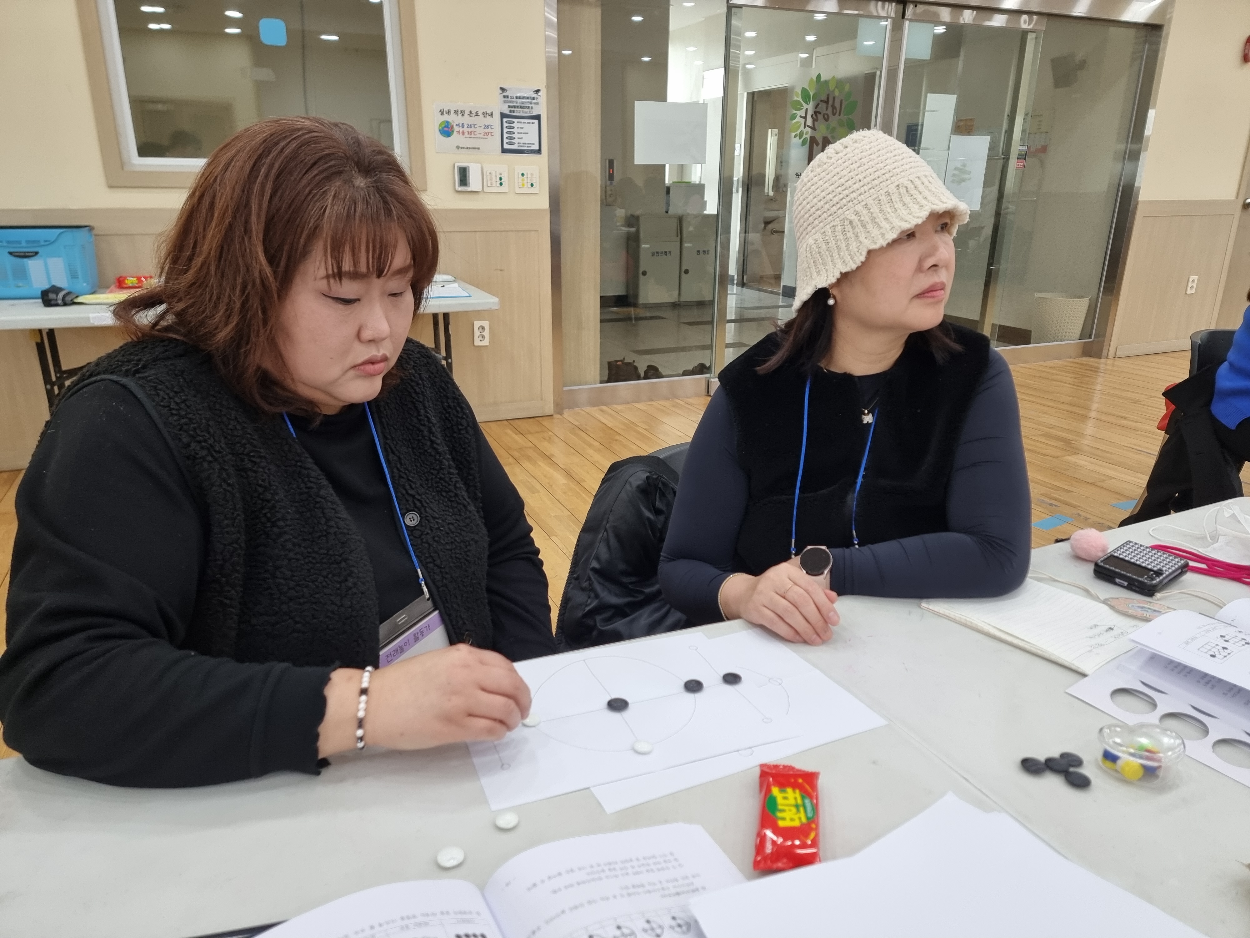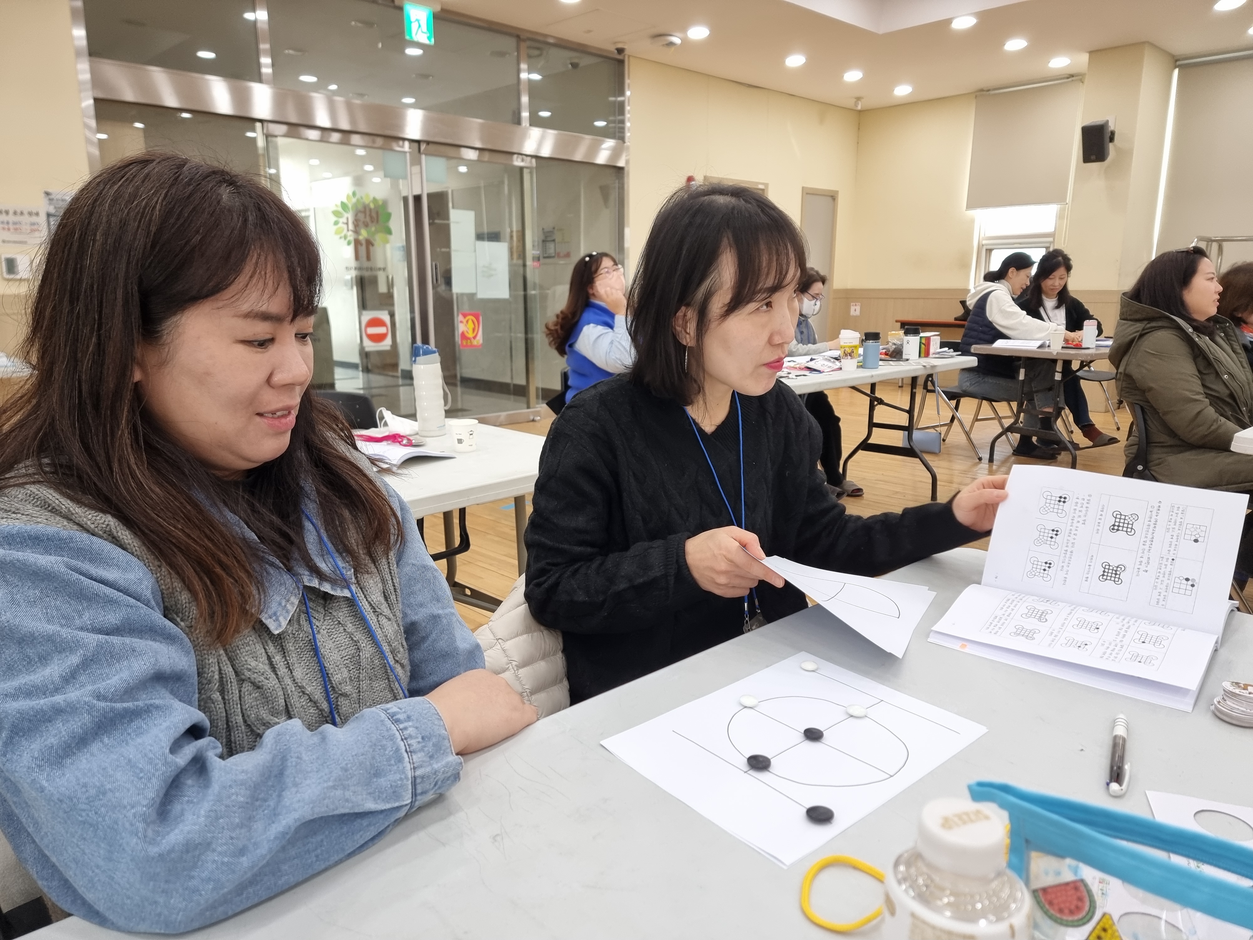 고누놀이를 배웠습니다. 종이에 그림판을 그리고 바둑알로 손쉽게 할 수 있는 놀이입니다. 둘씩 짝지어 대결했습니다. 저는 이정민 님과 했습니다. 업치락 뒤치락 했지만 결국에는 이정민 님이 이겼습니다. 연습이 필요해 보입니다. 혼자하는 고누놀이도 있습니다. 머리를 싸메고 천천히 도전해서 미션을 완수해야 합니다.