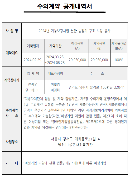 2024년 기능보강사업 (본관 승강기 구조 보강 공사) 수의계약 공고