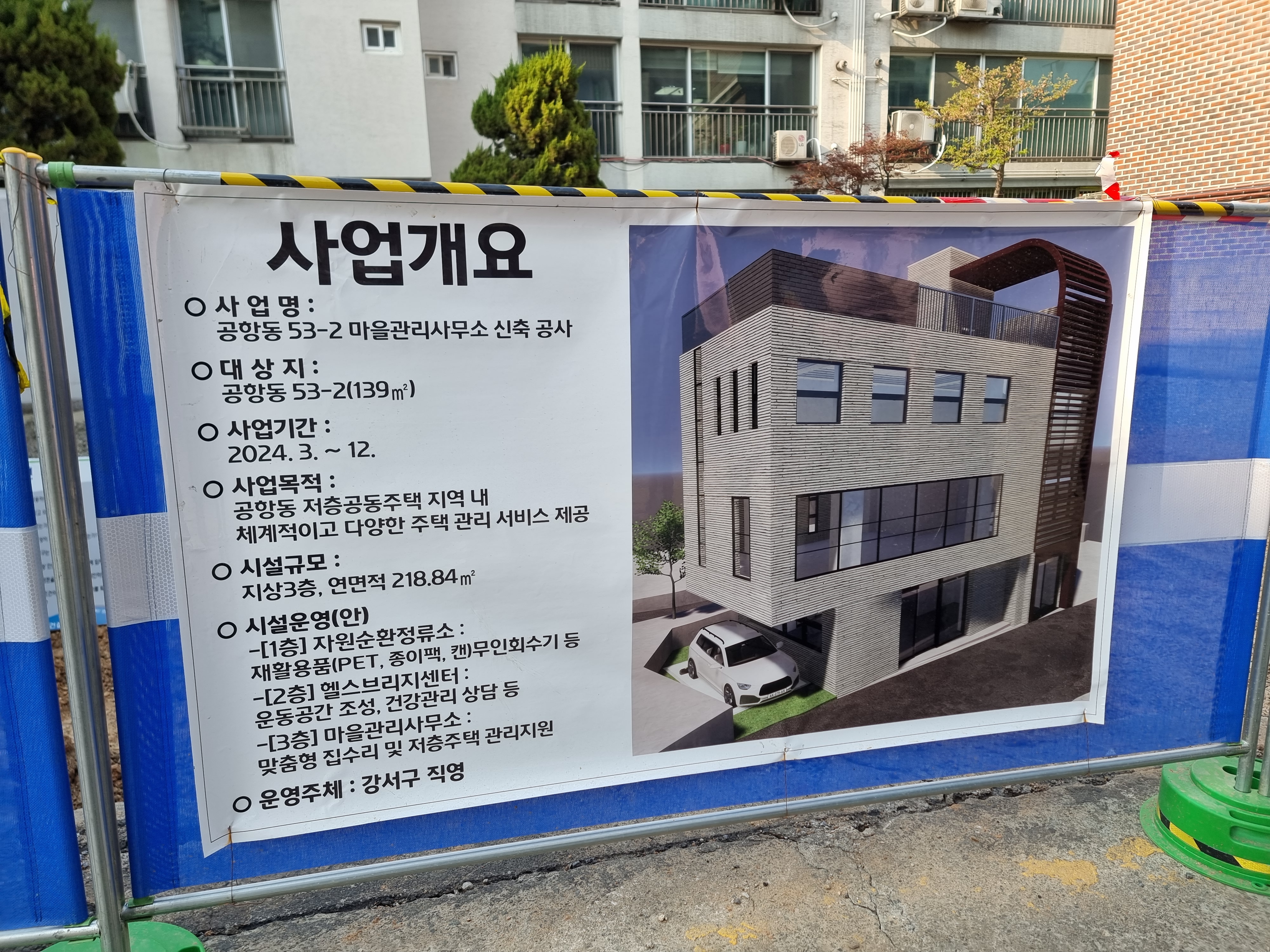 공항벧엘교회에 차를 주차했습니다. 14~15통 골목을 걸었습니다. 1년 동안 일했던 유혜숙 선생님도 처음 걷는 골목입니다. 강서구청 도시재생과에서 발주하는 마을관리사무소 신축공사가 있는 곳이 있었습니다. 공사정보를 보니 올해 3층 건물로 완공될 예정이며 1층에는 자원순환정류소(재활용품 무인회수기), 2층에는 헬스브리지센터(운동공간 조성, 건강관리상담), 3층에는 마을관리사무소(집수리, 저층주택관리지원)이 생긴다고 합니다. 공항동 지역에 새로운 주민공간이 만들어지는 겁니다. 이후 복지관에서 여러 주민이 함께 모이는 거점공간으로도 이용할 수 있기를 기대합니다.