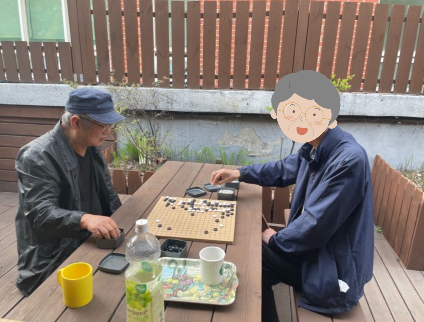 감사하게도 조 씨 어르신께서 복지관 앞 벤치에 도착해 계셨습니다. 최 씨 아저씨가 복지관에 도착하실 때까지 조 씨 어르신과 바둑, 축구, 야구 이야기를 나눴습니다. 최 씨 아저씨가 도착하고 두 분께서 악수하며 인사 나누셨습니다. 모임 장소로 이동하던 와중 본관과 별관을 잇는 야외 데크를 지나가고 있었습니다. 두 분께서 날도 좋으니 여기서 바둑 두면 어떠냐고 먼저 말씀하셨습니다. 미리 준비해둔 바둑판, 바둑알을 잽싸게 야외 데크로 옮겼습니다.