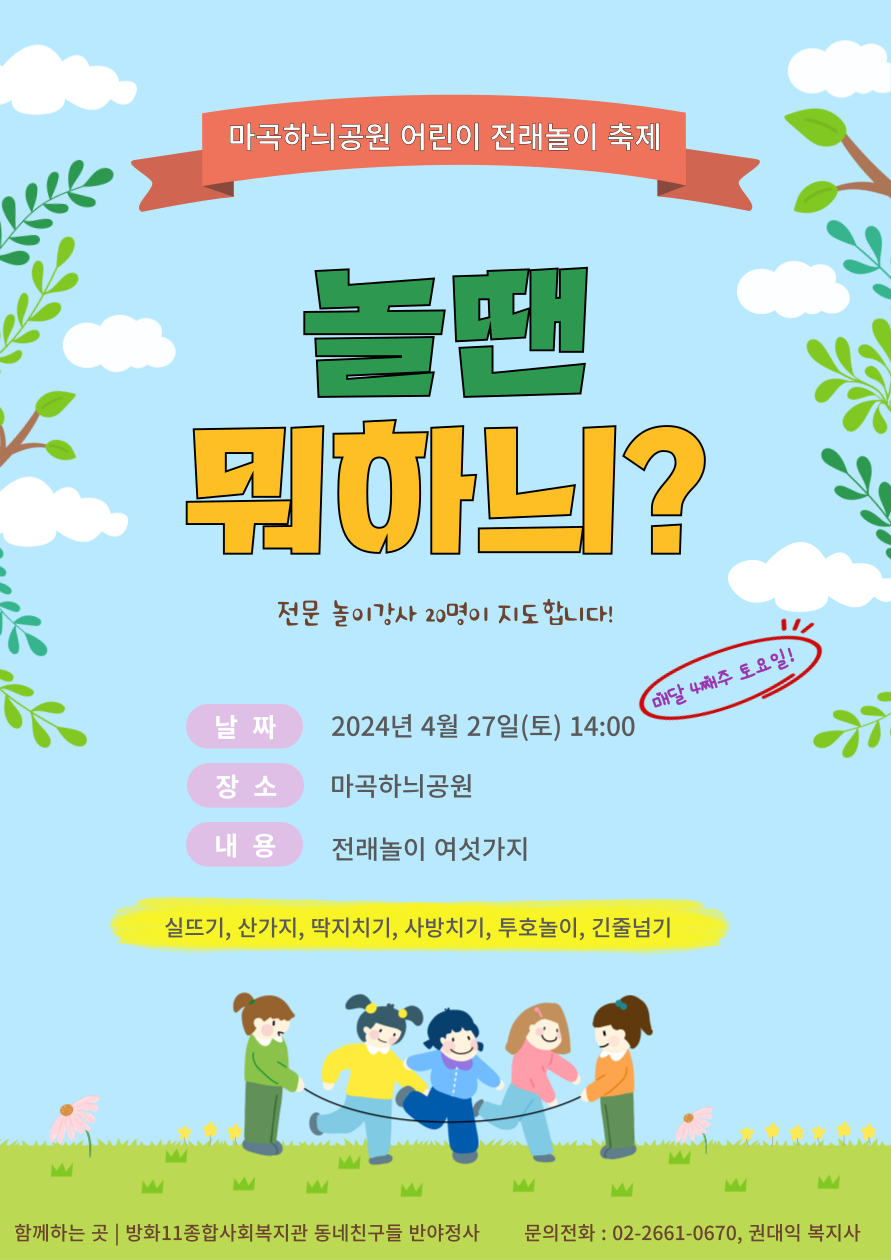 마곡하늬공원에서 어린이 전래놀이 축제를 시작합니다.