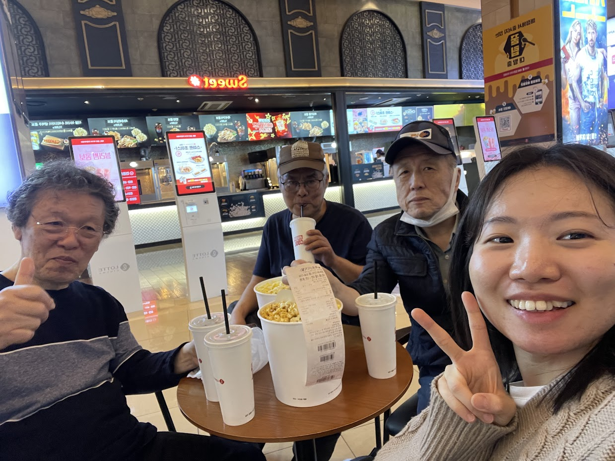 참여자분들과 마지막으로 본 영화는 무엇인지, 인생 영화는 무엇인지 이야기 나누며 상영관으로 이동했습니다. 세 분과 나란히 앉아 영화를 관람했습니다. 영화가 다 끝난 뒤 서로 어땠는지 이야기를 나눴습니다. 괜찮았다는 분도 계셨고, 전개가 조금 빨라 이해가 잘 가지 않았다는 분도 계셨습니다. 다음에는 세 분의 취향을 모두 고려하여 영화를 골라봐도 좋겠습니다.