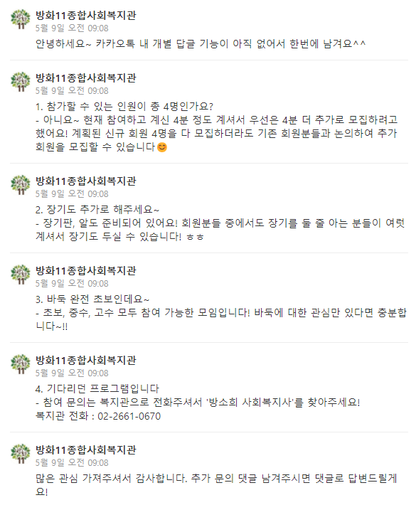 제가 생각했던 것보다 훨~~씬 많은 주민분들께서 관심을 가져주셨습니다. 댓글을 남겨주신 분도 계셨고, 복지관으로 직접 전화주셔서 바둑모임에 참여하고 싶다고 신청하신 분도 계셨습니다.
