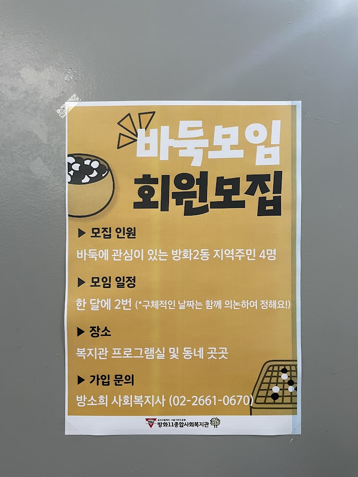 4월 한 달 동안 파일럿 형태로 바둑모임을 진행했습니다. 조 씨 어르신, 최 씨 아저씨와 함께 소박하게 시작했던 바둑모임은 어느덧 네 분의 회원분들이 꾸준히 참여하는 어엿한 모임이 되었습니다. 회원분들께서도 신규 회원을 모집하여 더욱 많은 주민분들과 어울리고 싶은 마음이 크셨고, 담당자인 저도 이번 바둑모임을 주선하며 생각보다 동네 곳곳에 바둑에 관심있는 주민분들이 많이 계시다는 것을 알게 되었습니다. 회원분들의 의견에 따라 바둑모임 신규 회원을 모집하기로 했습니다!