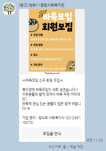 올해부터 우리 복지관에서도 카카오톡 비즈니스 채널을 운영하기로 했습니다. 카카오톡 비즈니스 채널을 비롯한 복지관 사업 홍보 전반을 담당하고 계신 이미진 대리님께서 그동안 사업이 진행될 때마다 비즈니스 채널을 통해 주민분들께 홍보를 진행했습니다. 저도 옆에서 홍보 효과를 전해들으며 나중에 제 사업을 진행할 때 꼭 한번 비즈니스 채널을 활용해봐야겠다고 생각했습니다. 더욱 많은 주민분들께 바둑모임 회원 모집에 대해 전달되기를 바라는 마음에 카카오톡을 활용하여 홍보 문자를 발송했습니다.