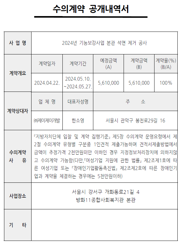 2024년 기능보강사업 (본관 석면 제거 공사) 수의계약 공고