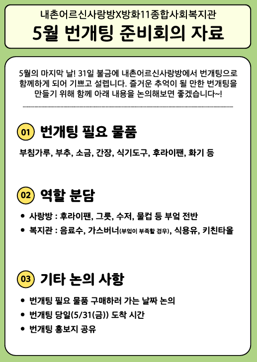 내촌경로당 임원진분들과 번개팅을 준비하기 위해 어떤 물품이 필요하고, 어떻게 역할을 나누면 좋을지 의논했습니다.