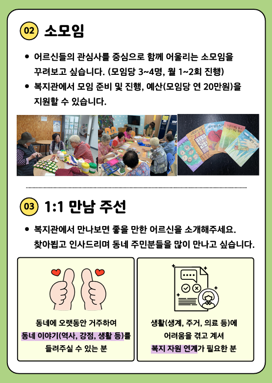 "코로나 때 경로당이 문을 닫았잖아요. 그 이후로 경로당이 아주 죽어버렸어요. 사람도 안오고. 코로나가 끝났는데 3년 째 그대로예요. 동네로 사업에서 그리는 모습들을 한꺼번에 다 하기에는 어려울 거예요. 그러니까 사람들이 같이 어울려서 먹는 것부터 시작하면 좋겠어요. 밥을 같이 먹으면 친해져요."