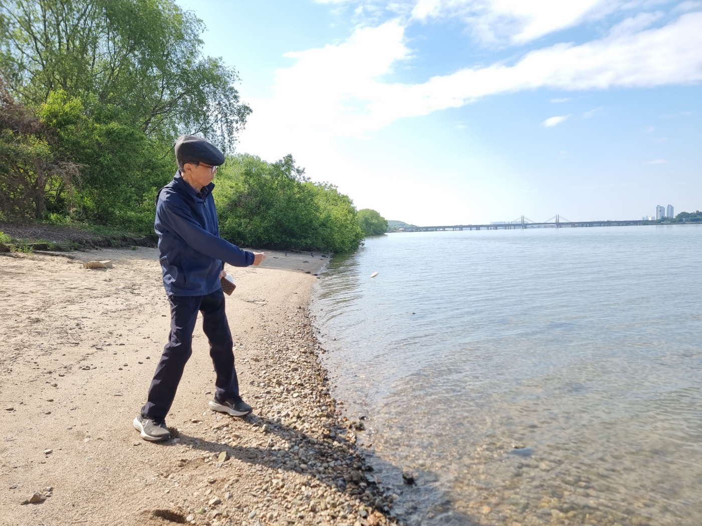 한강 둔치로 내려가 물수제비도 했습니다.