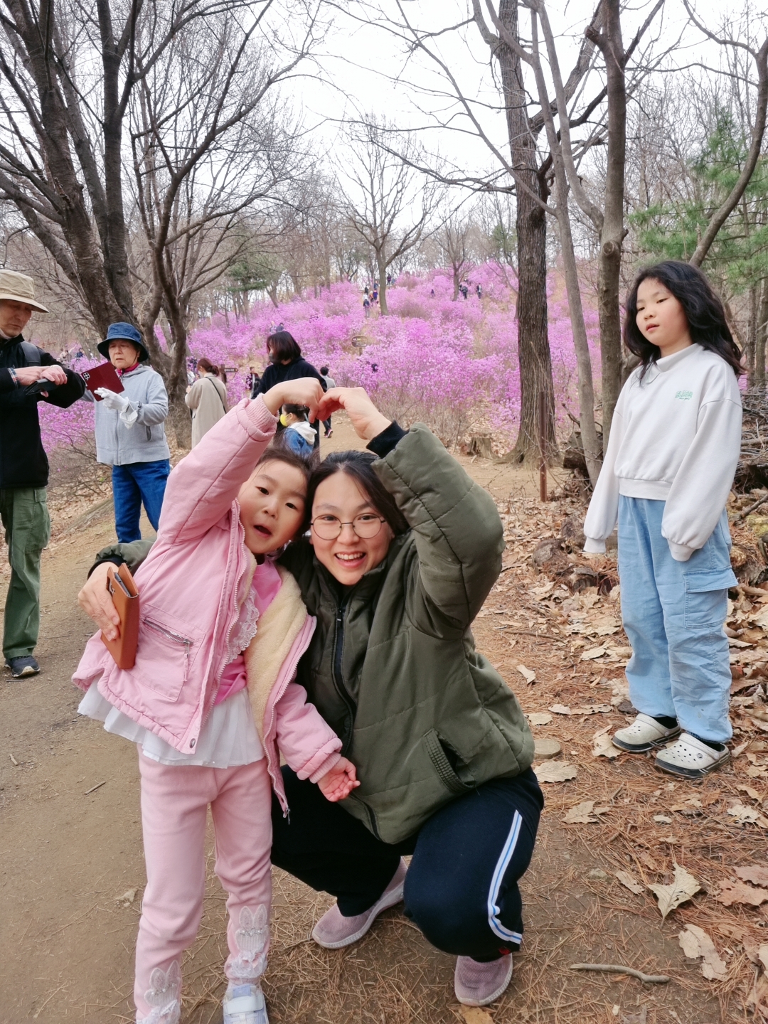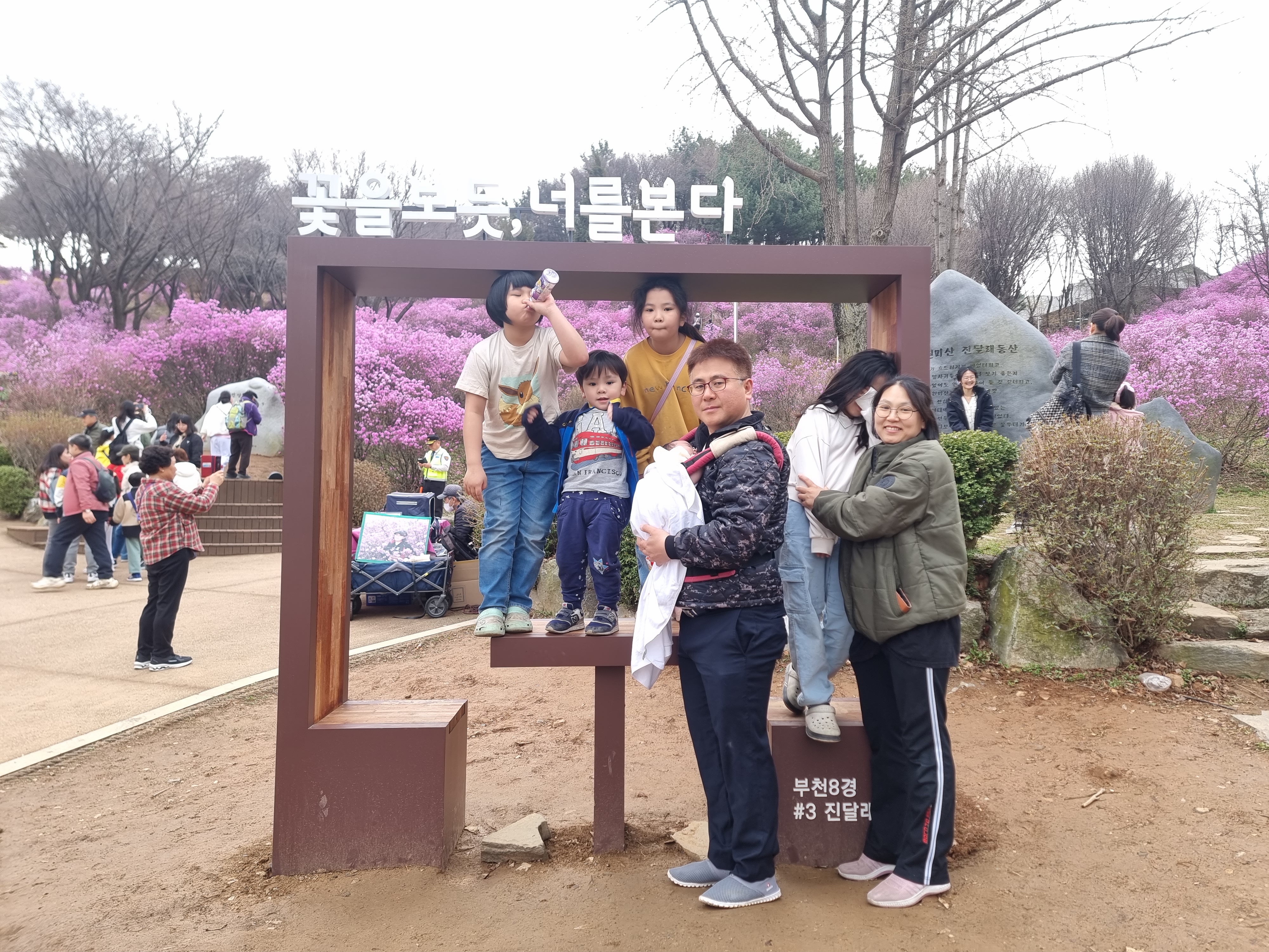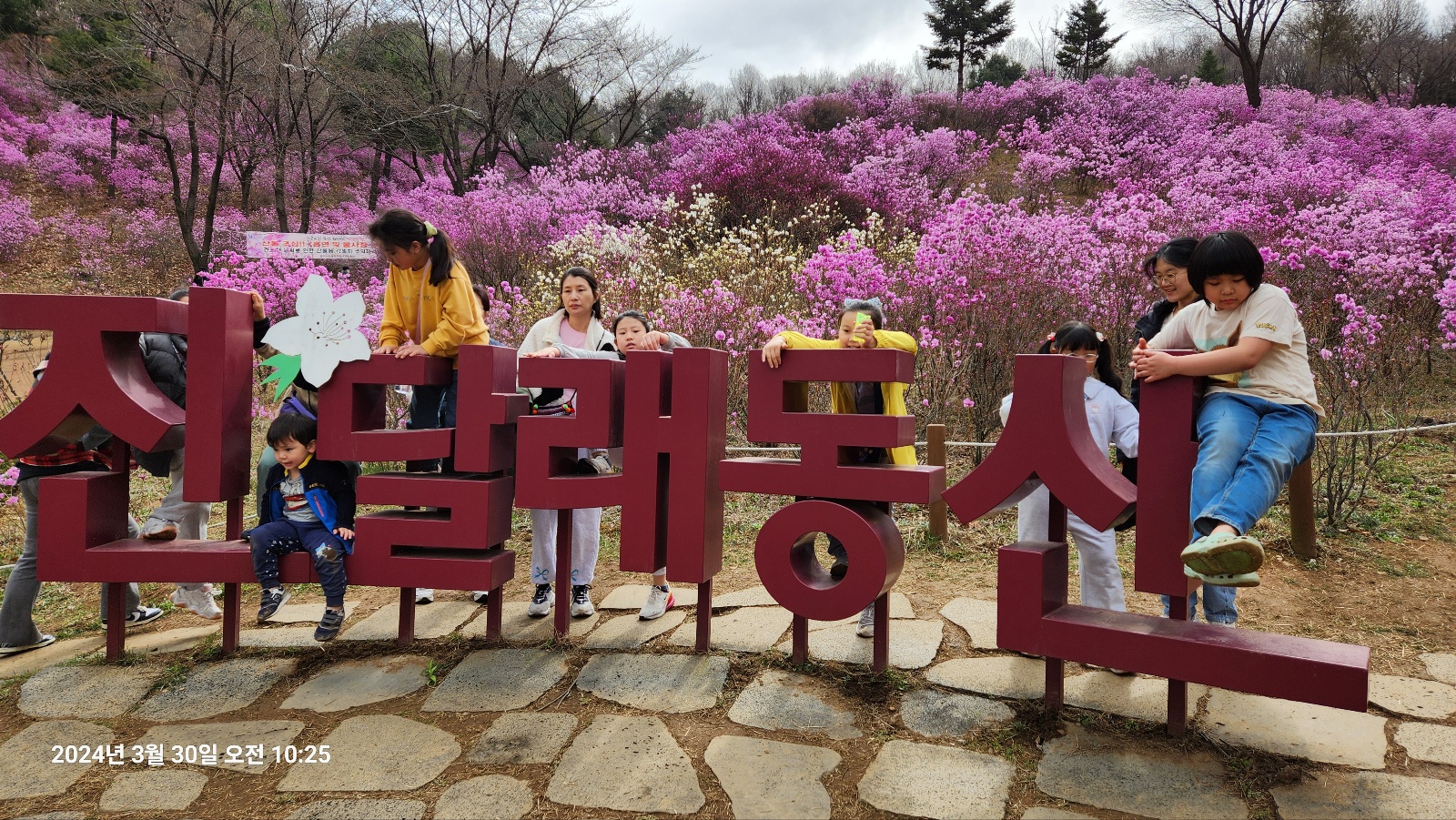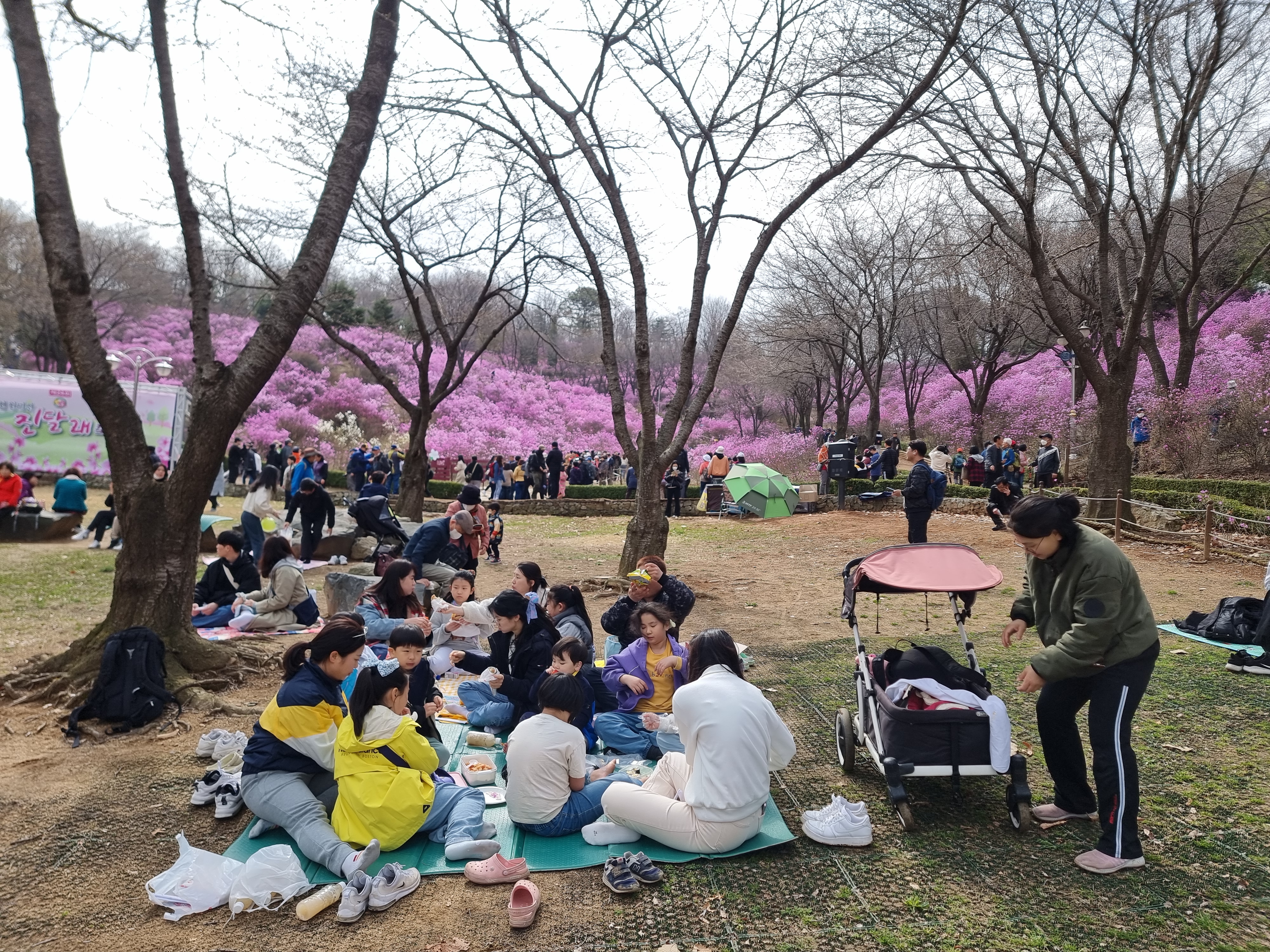 점점 사람이 많아졌습니다. 진달래 동산에 온 지 시간이 흘렀습니다. 사람이 적을 때 잘 놀았고 집으로 돌아가기로 했습니다. 지하철역까지 가는 길에 들어오는 사람이 더욱 많았습니다.