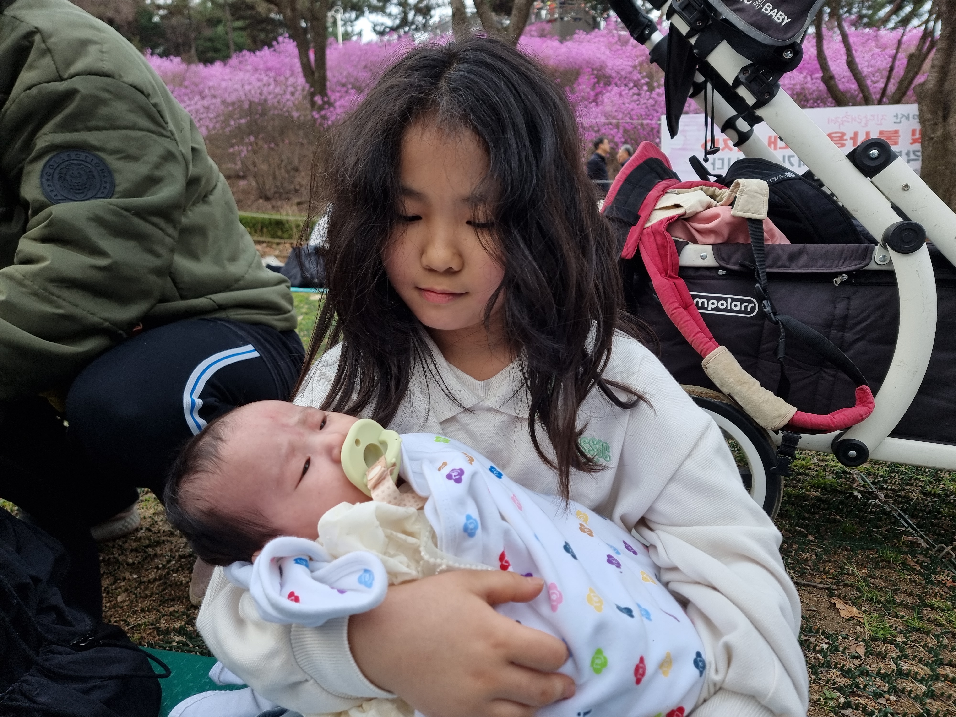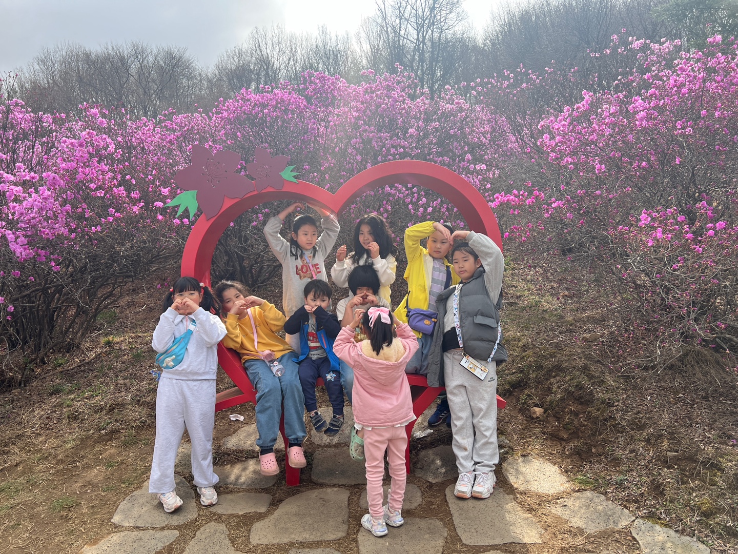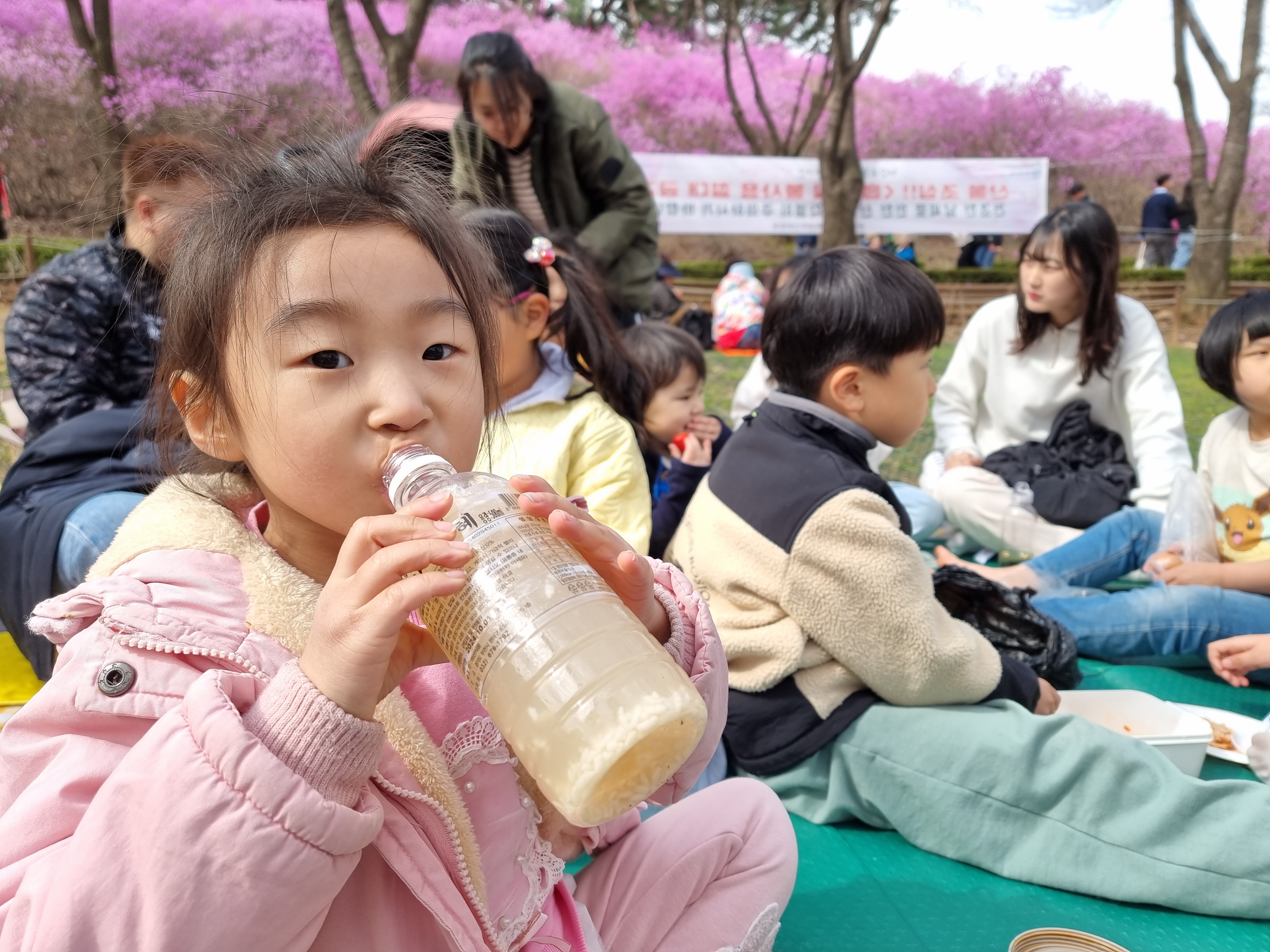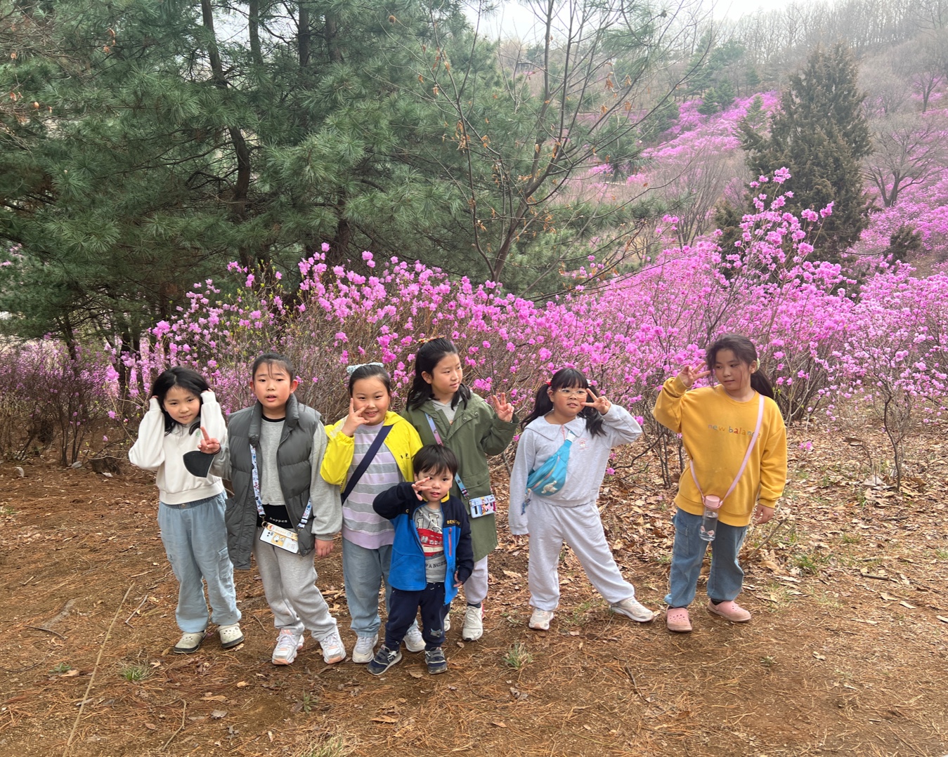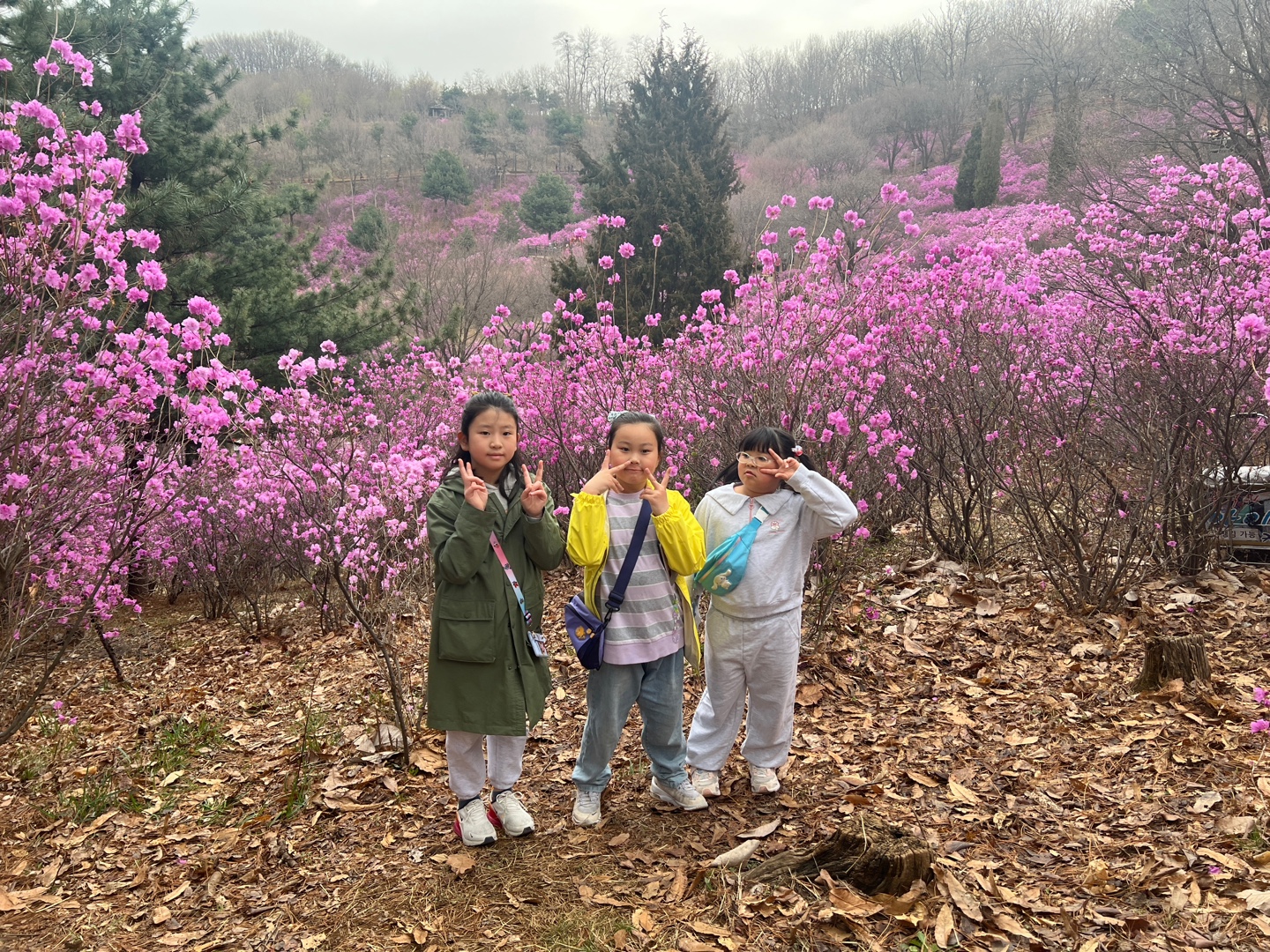 진달래 동산에 도착했습니다. 분홍빛 진달래가 입구에서부터 반겨줍니다. 입구 한곳에 돗자리를 펴고 짐을 놓고 산책을 시작했습니다. 동산마다 진달래가 절정입니다. 오르막을 오르니 넓게 펼쳐진 진달래 군락지가 더욱 흐드러졌습니다. 엄마도 아이도 모두 감탄했습니다. 5살 재영이도 6살 지영이도 잘 걸었습니다.