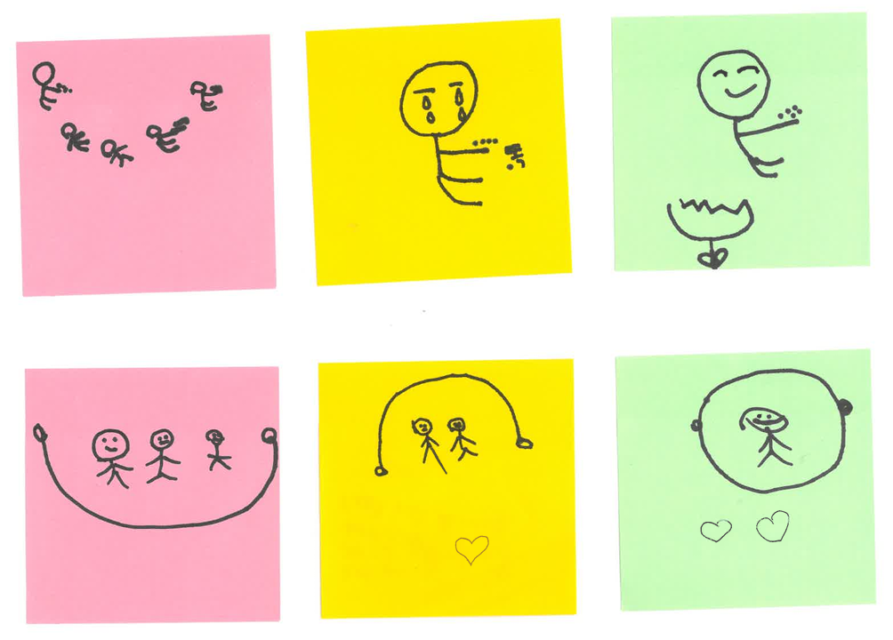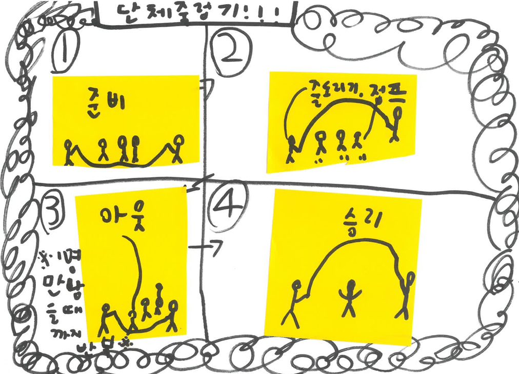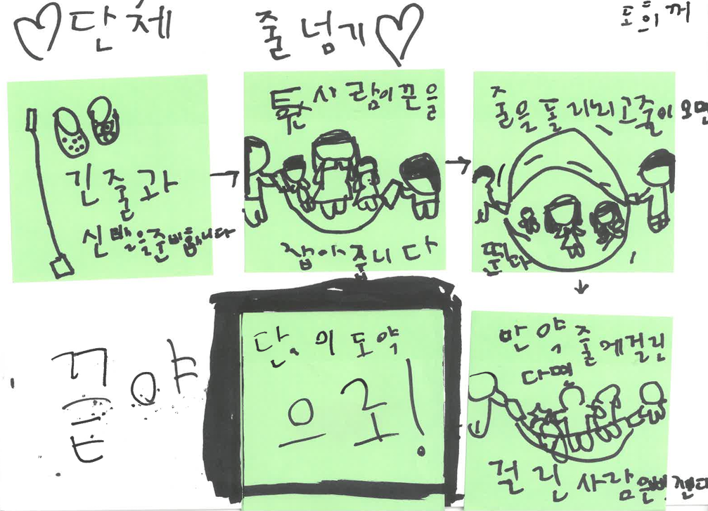 함께한 단체줄넘기, 공기놀이 활동을 그림으로 돌아보는 시간을 가졌습니다. 기억에 남는 순간 표현하기, 즐거웠던 순간 표현하기, 놀이를 통해 동화 창작하기, 놀이 방법을 소개하기 등등 각자 하고 싶은 방식으로 그림 그리며 표현했습니다. 그림을 모두 그린 뒤에는 자신이 그린 그림을 친구들 앞에서 소개하고 싶은 아이들은 발표를 하며 서로 생각을 나눴습니다. 아이들의 그림을 통해 이번 활동에서 무엇이 재밌었고, 어떤 것을 느꼈는지 살펴볼 수 있었습니다. 아이들이 그린 그림의 일부를 아래에 소개합니다!