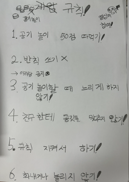 드디어 기다리던 전통놀이 활동 시간입니다. 본격적으로 마을선생님과 놀이활동을 시작하기 전에 지난 시간에 함께 세운 규칙을 아이들과 다시 한번 살펴봤습니다. 직접 세운 규칙을 지키며 서로를 배려하면서 즐겁게 활동하길 기대합니다.