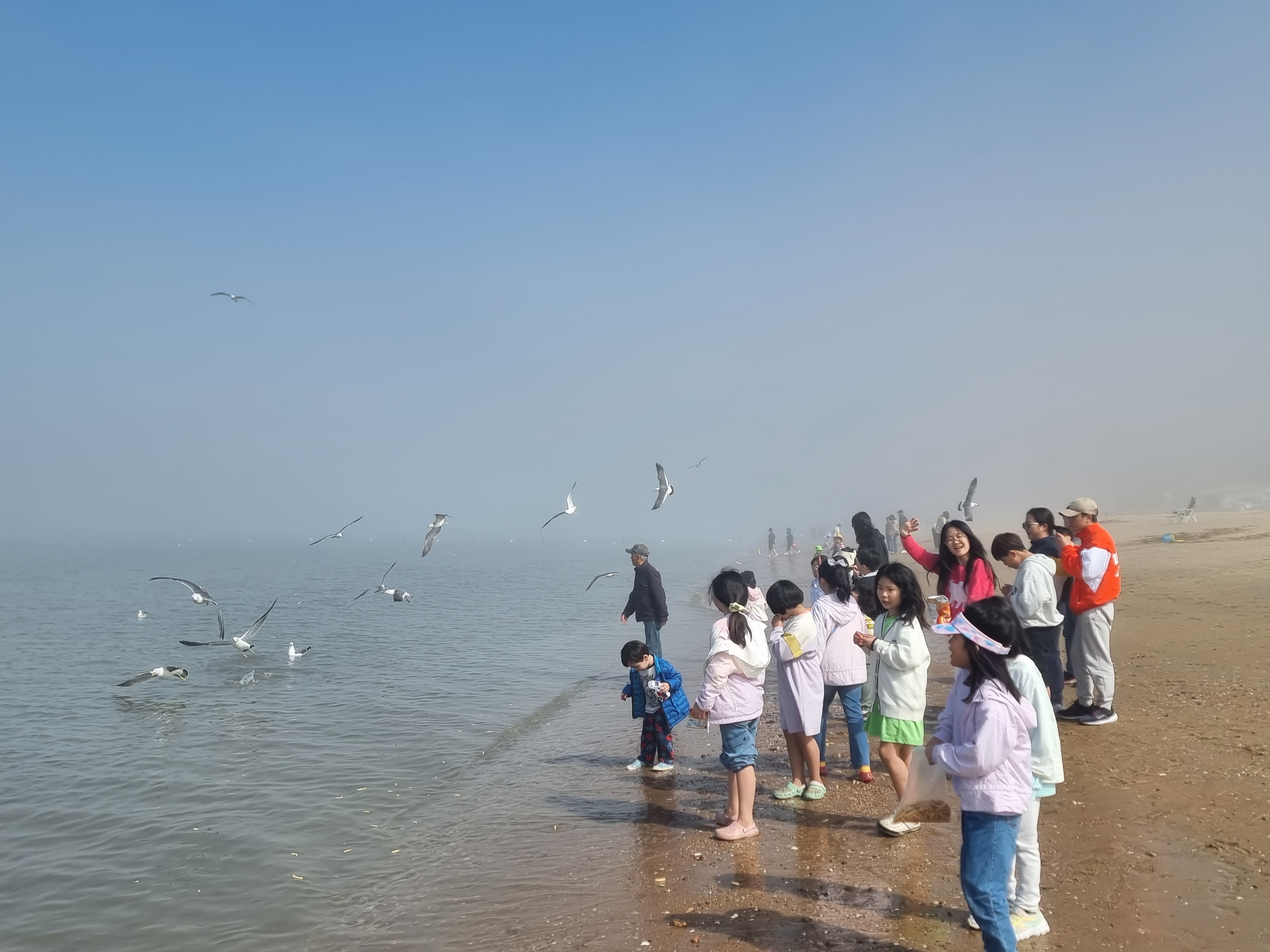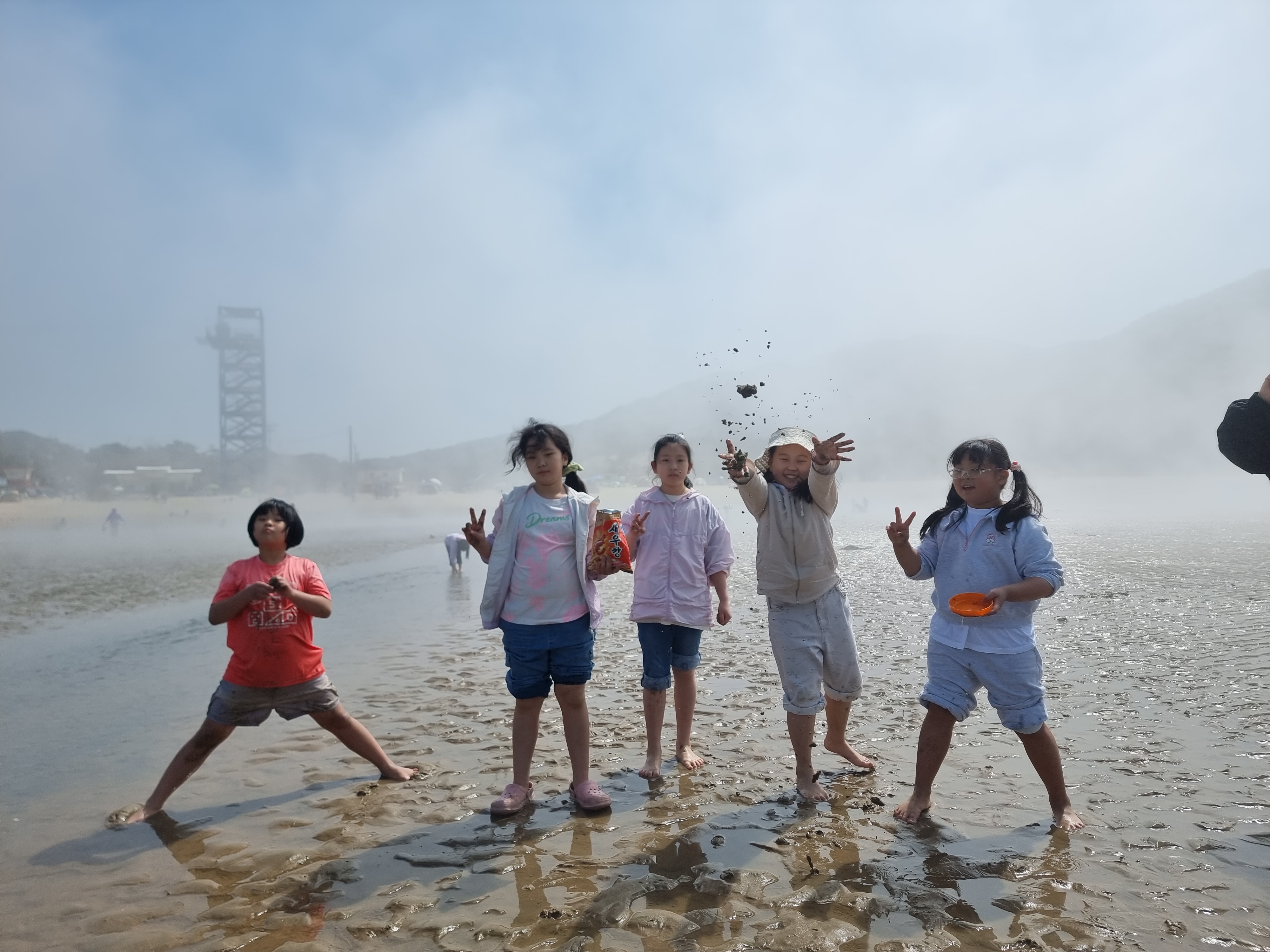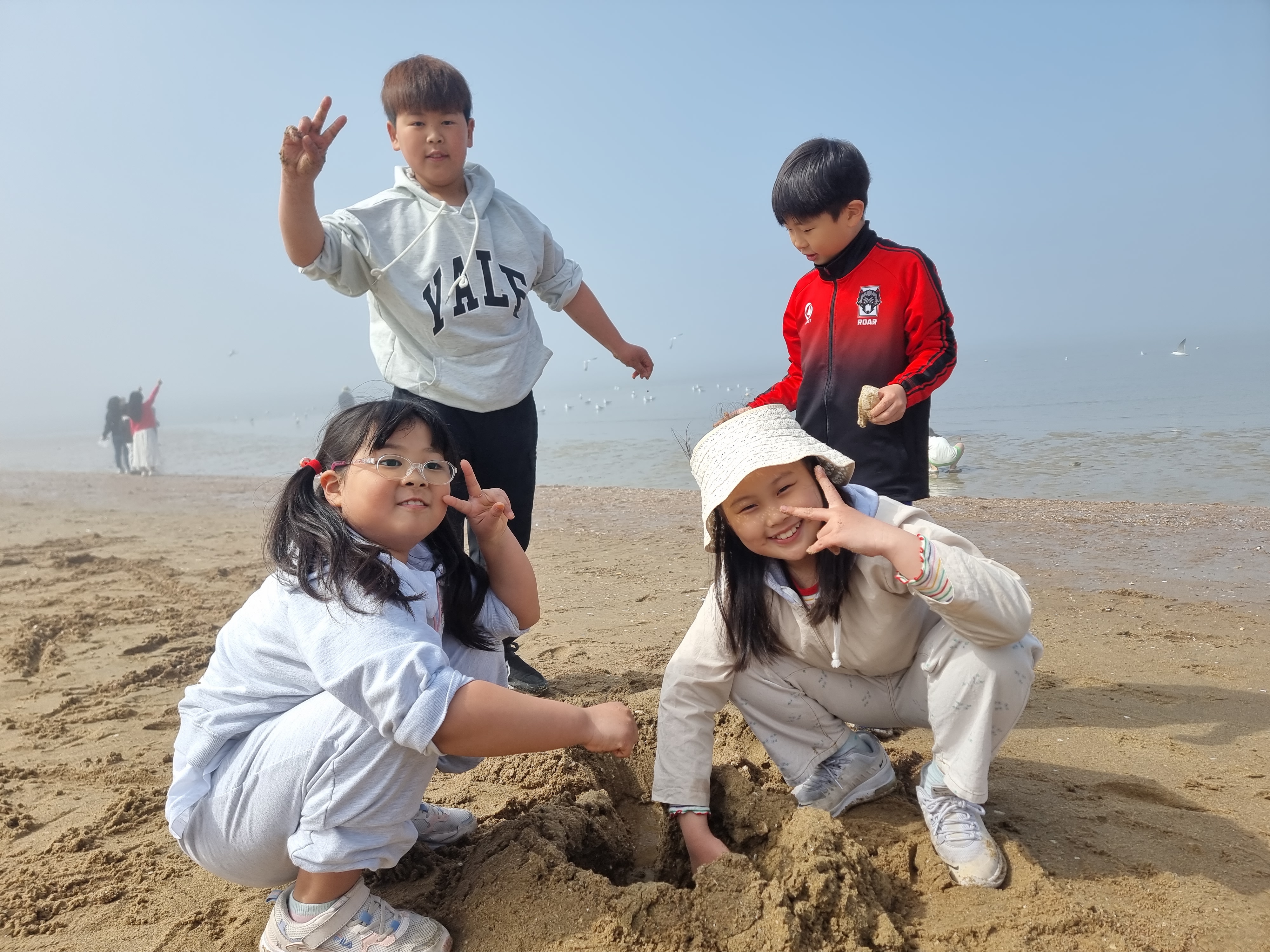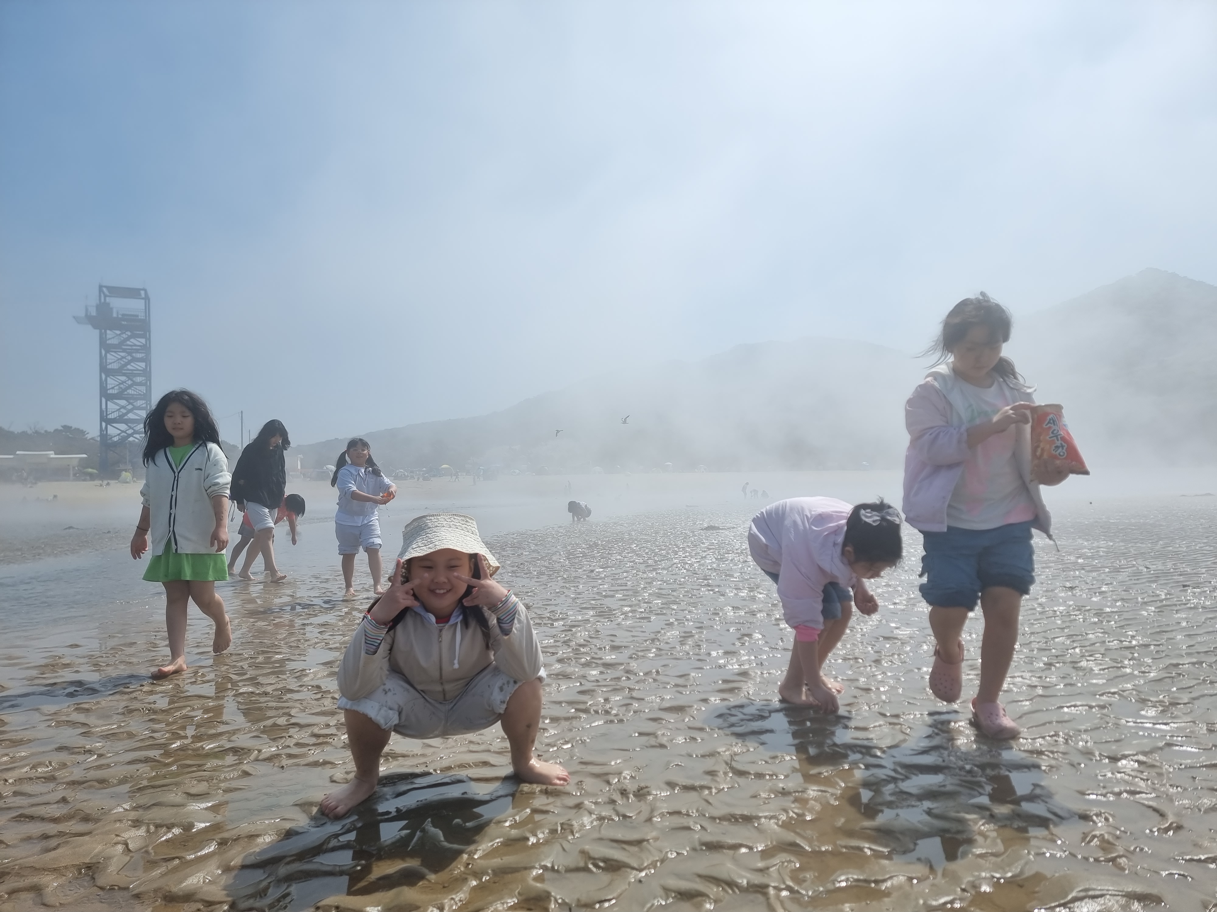 다른 아이들은 갯벌에서 온갖 생물과 놀고 조개를 캤습니다. 시원한 바람과 바다, 넘실거리는 해무, 해무가 걷히고 맑은 날씨, 절로 마음이 열렸습니다. 아이들도 서로 신나게 어울려 놀았습니다. 바다에 들어가지 않은 아이들과 어른들은 백사장에서 모래놀이와 모래에서 그림그리기를 하고 놀았습니다. 2월 전래놀이 활동가 교육을 할 때 아이들끼리 놀면서 조금 더 가까워진 덕분입니다. 이후에 이렇게 함께 여행을 오니 작년보다 서로 더욱 친해졌습니다.