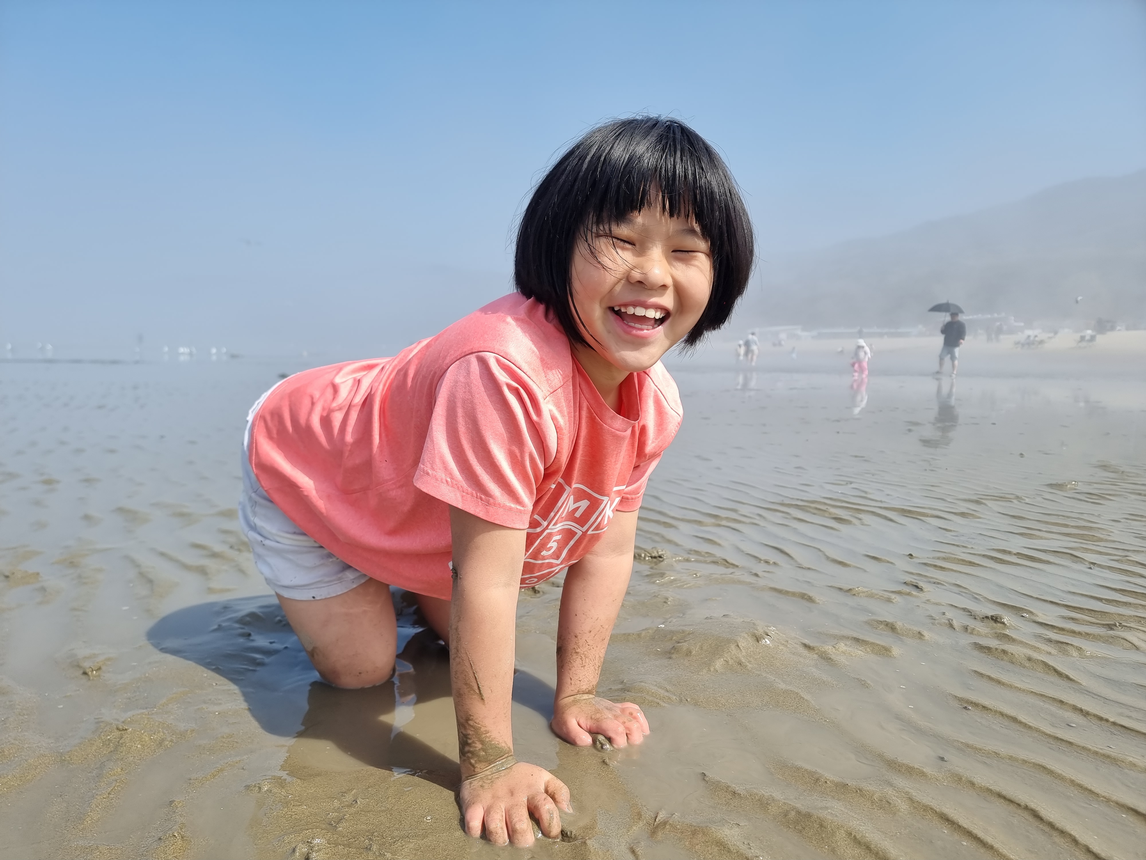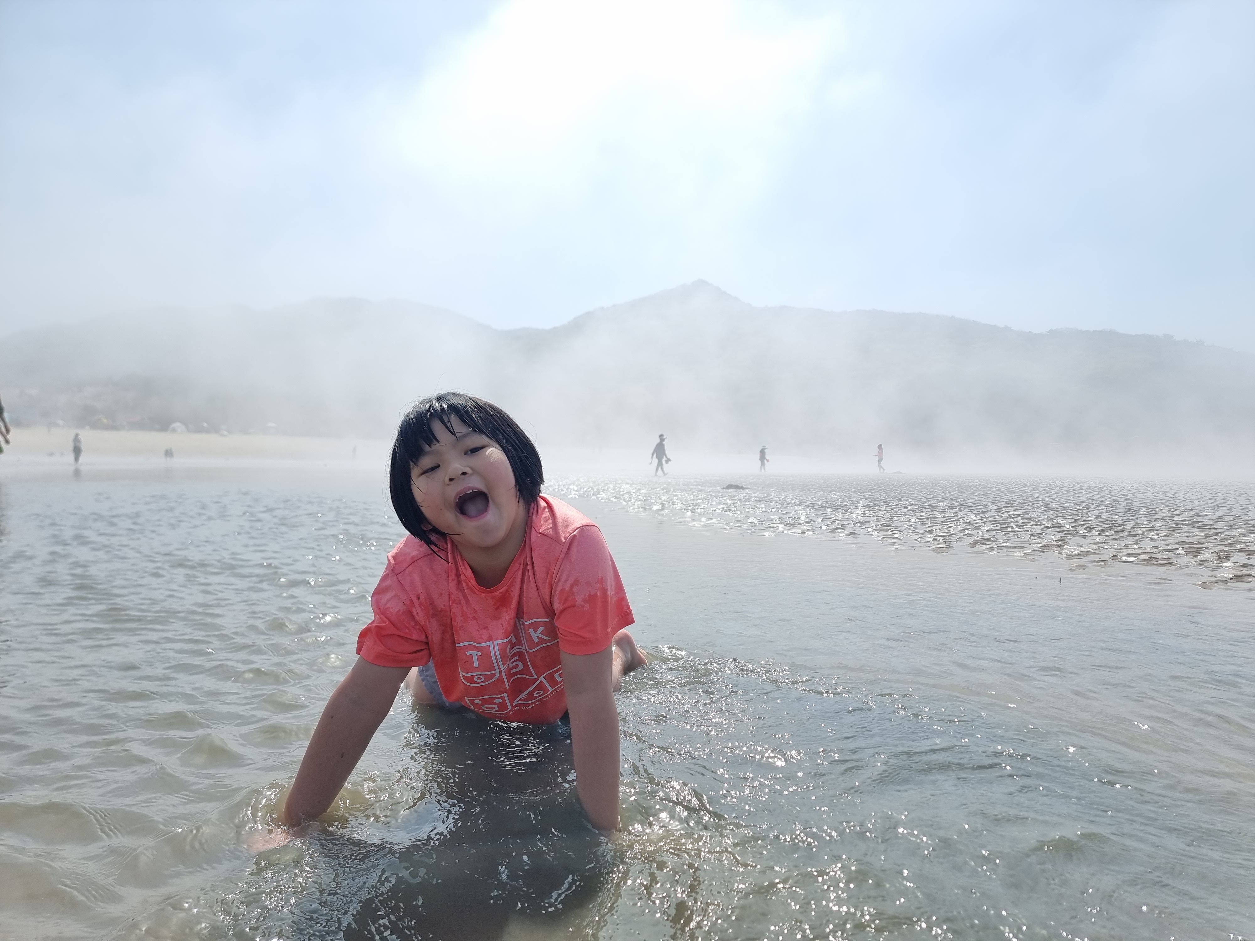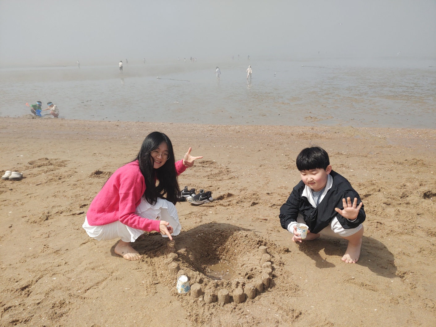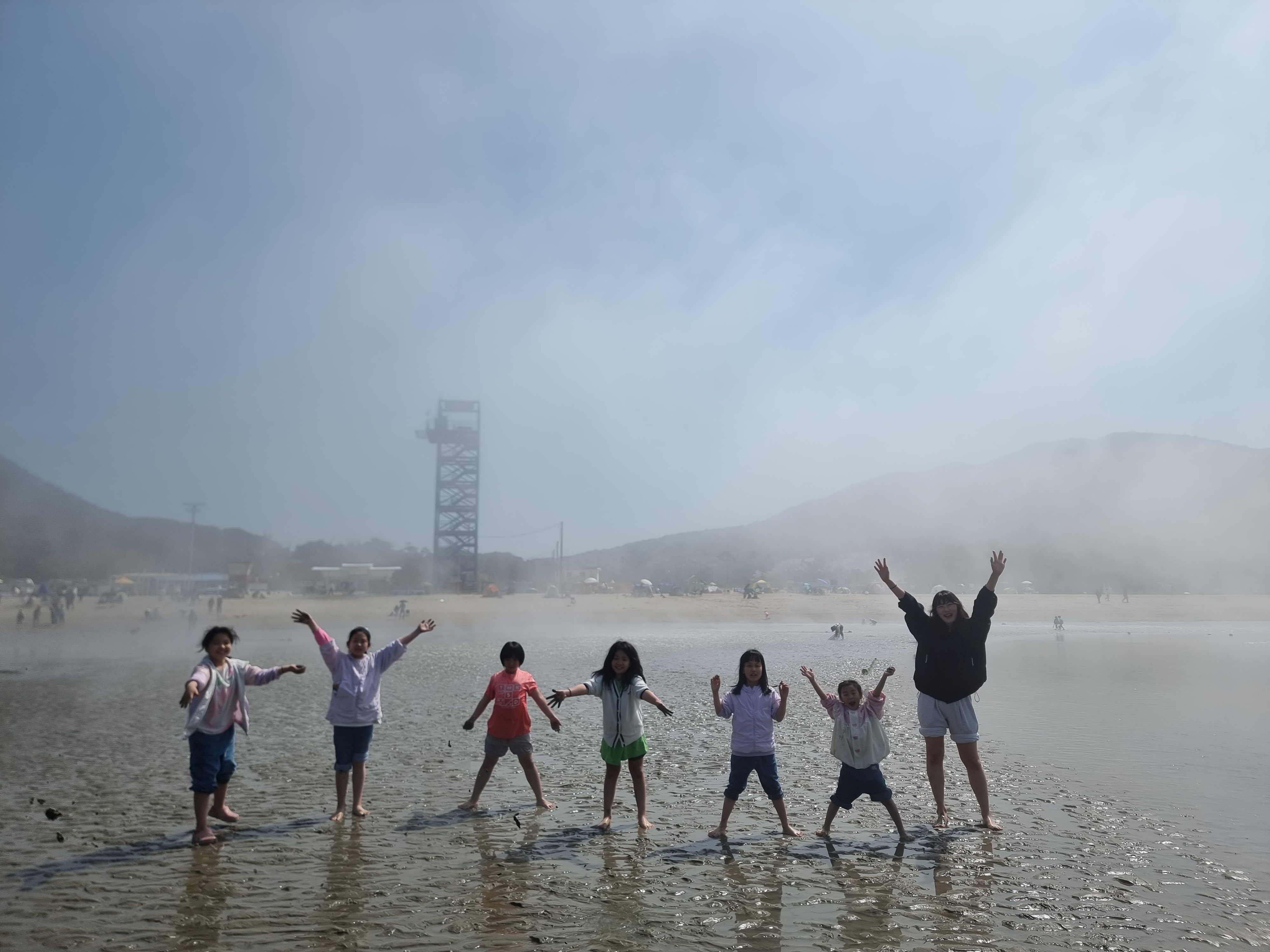 다른 아이들은 갯벌에서 온갖 생물과 놀고 조개를 캤습니다. 시원한 바람과 바다, 넘실거리는 해무, 해무가 걷히고 맑은 날씨, 절로 마음이 열렸습니다. 아이들도 서로 신나게 어울려 놀았습니다. 바다에 들어가지 않은 아이들과 어른들은 백사장에서 모래놀이와 모래에서 그림그리기를 하고 놀았습니다. 2월 전래놀이 활동가 교육을 할 때 아이들끼리 놀면서 조금 더 가까워진 덕분입니다. 이후에 이렇게 함께 여행을 오니 작년보다 서로 더욱 친해졌습니다.