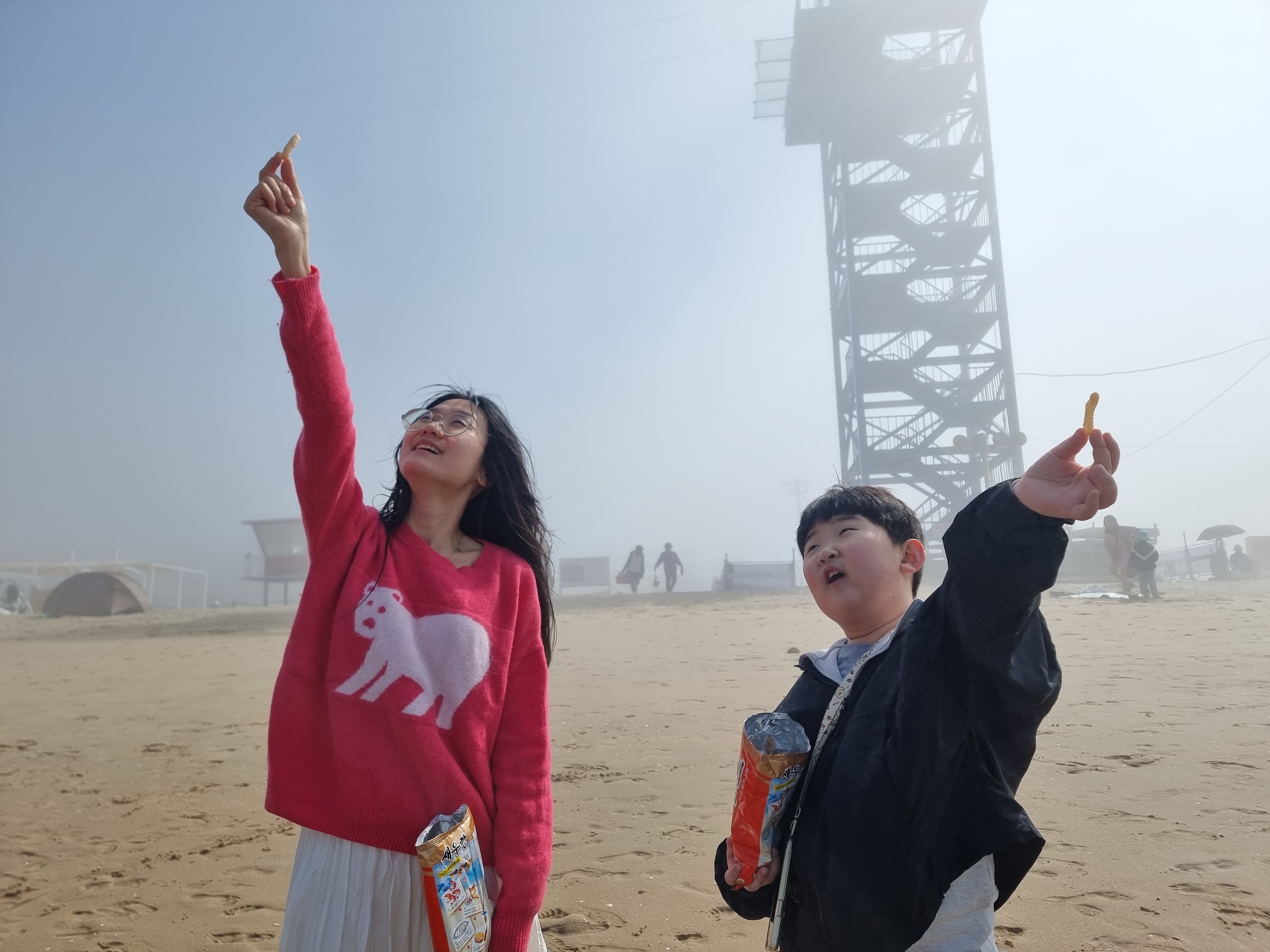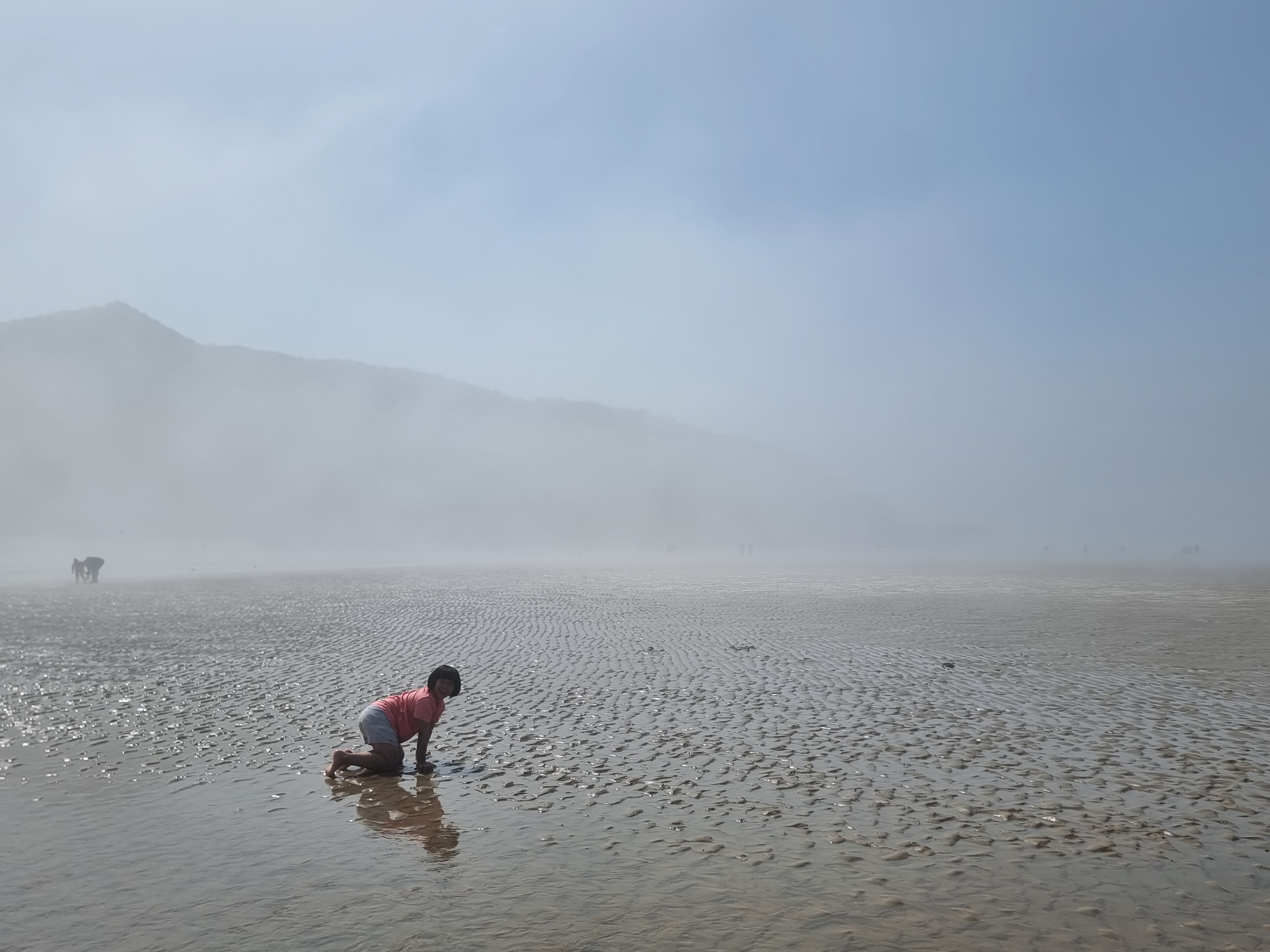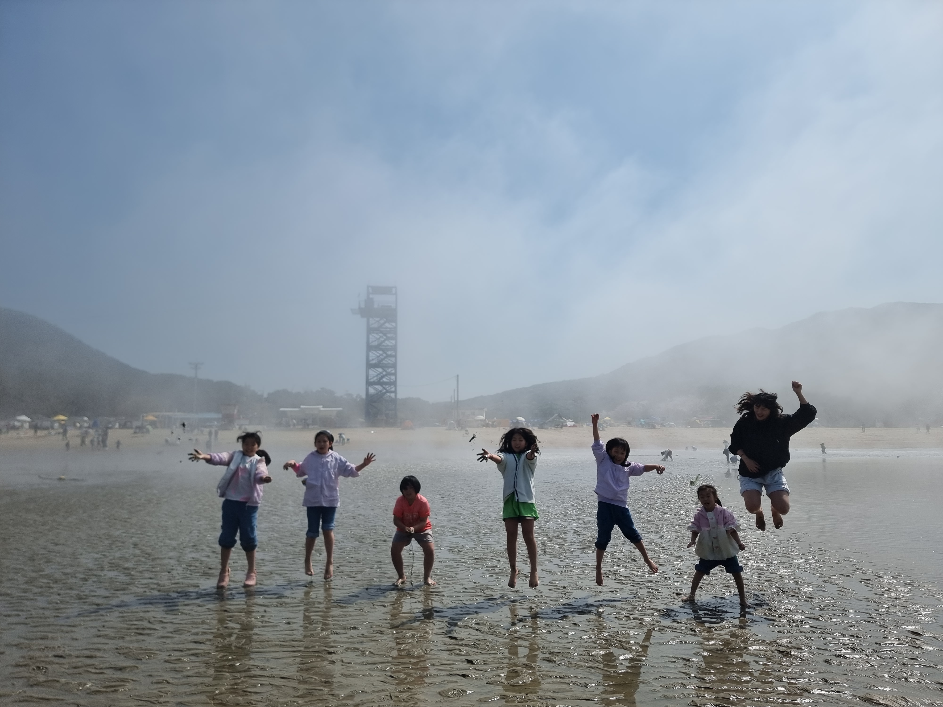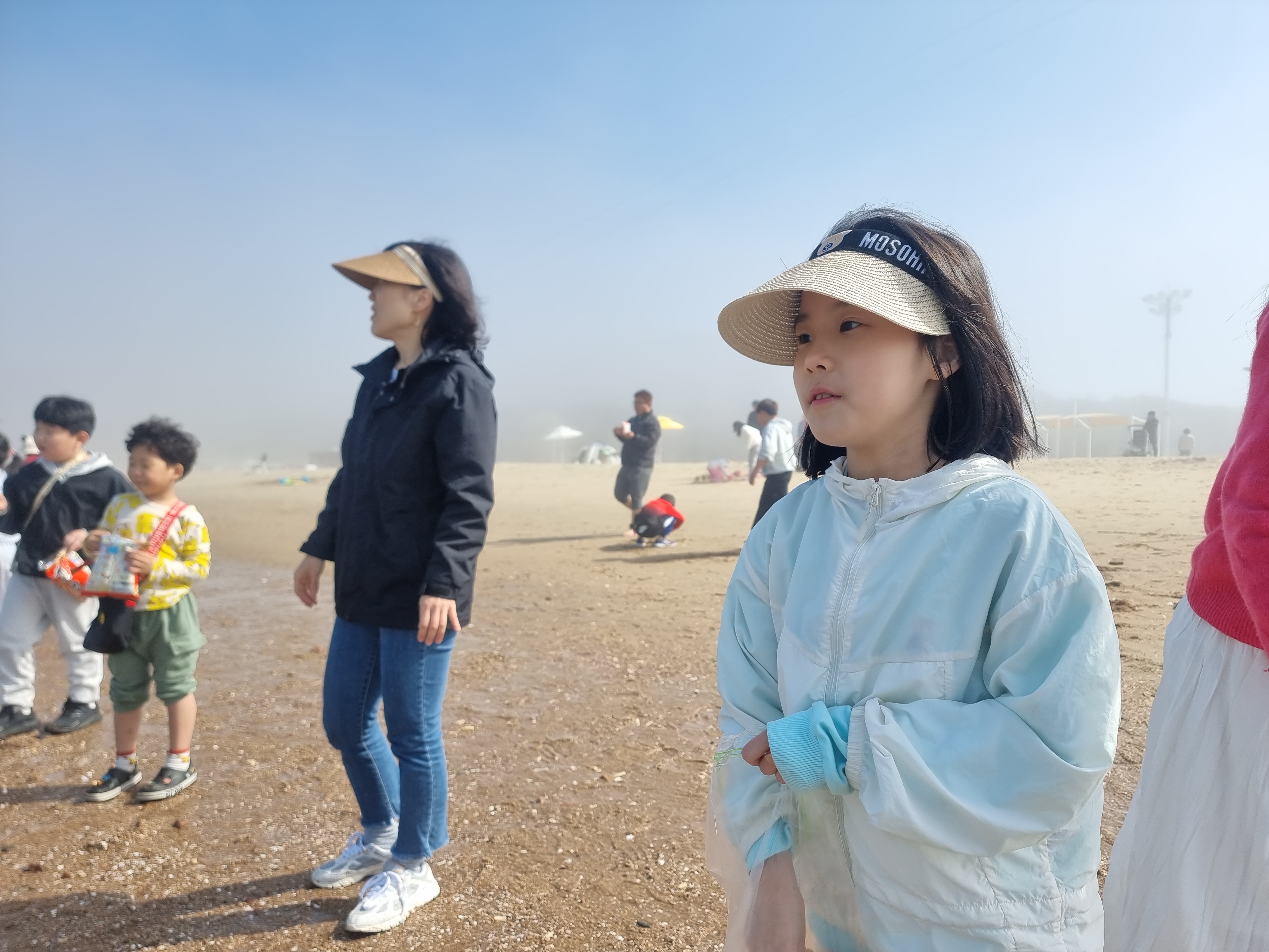 다른 아이들은 갯벌에서 온갖 생물과 놀고 조개를 캤습니다. 시원한 바람과 바다, 넘실거리는 해무, 해무가 걷히고 맑은 날씨, 절로 마음이 열렸습니다. 아이들도 서로 신나게 어울려 놀았습니다. 바다에 들어가지 않은 아이들과 어른들은 백사장에서 모래놀이와 모래에서 그림그리기를 하고 놀았습니다. 2월 전래놀이 활동가 교육을 할 때 아이들끼리 놀면서 조금 더 가까워진 덕분입니다. 이후에 이렇게 함께 여행을 오니 작년보다 서로 더욱 친해졌습니다.