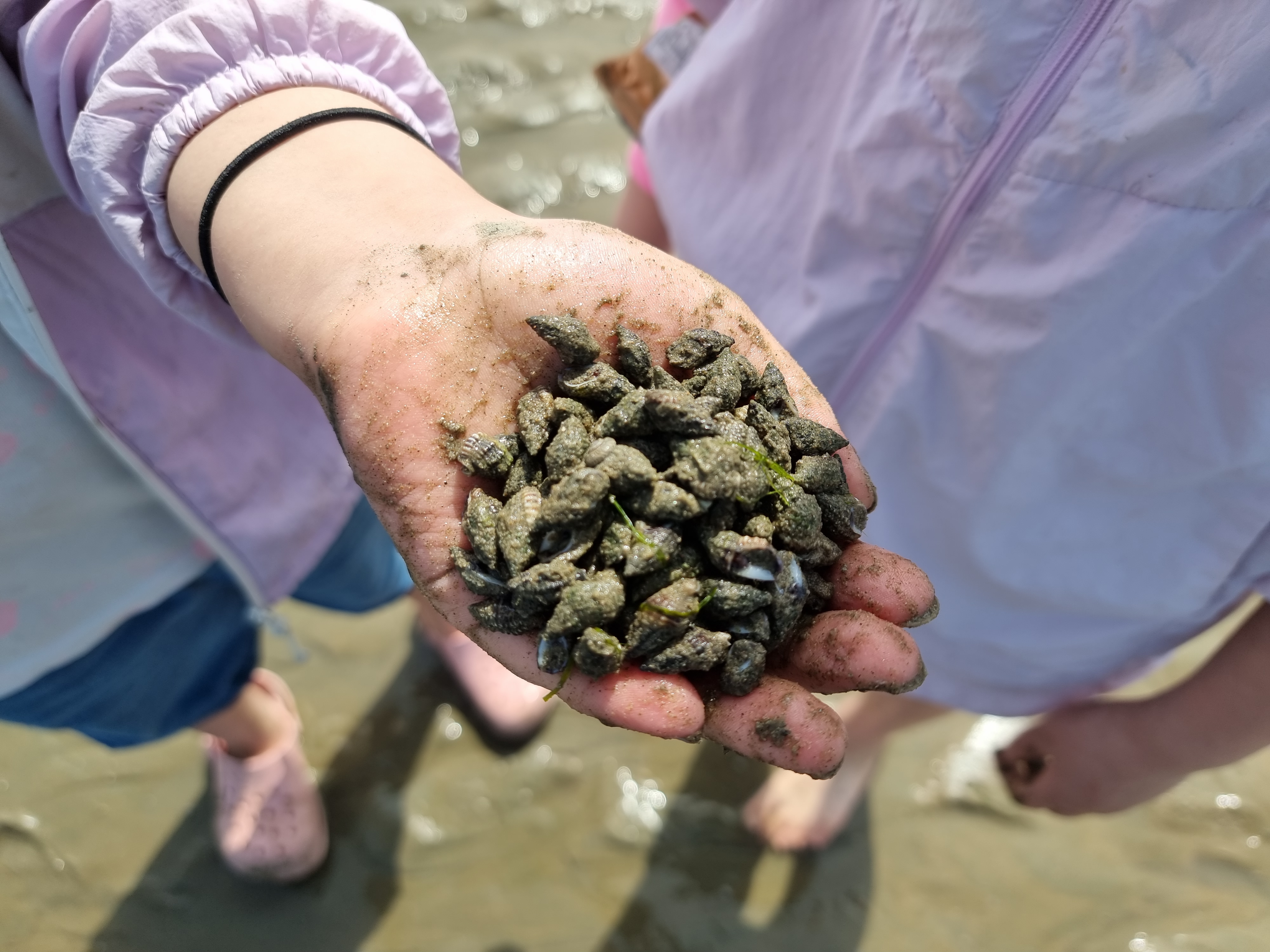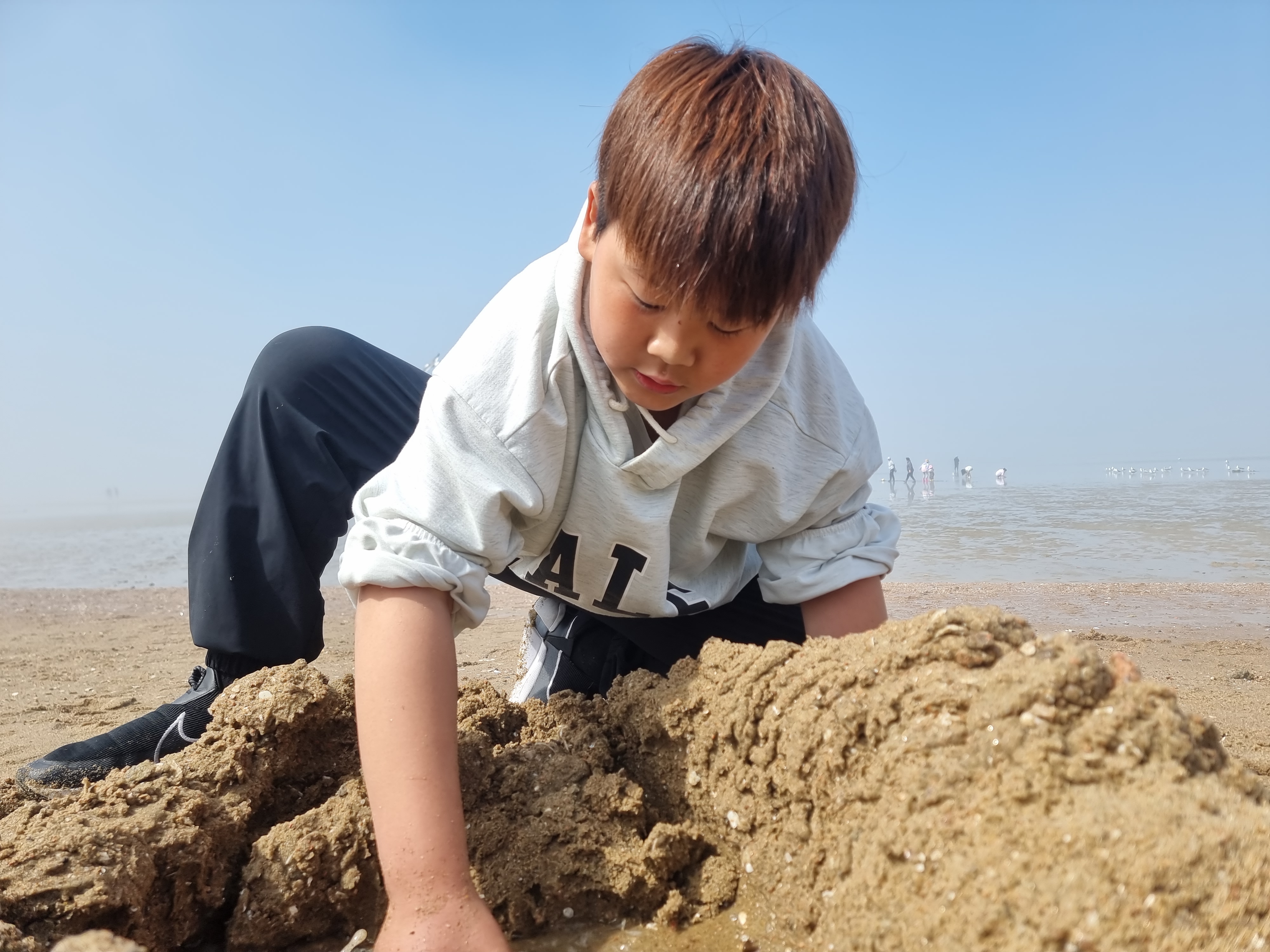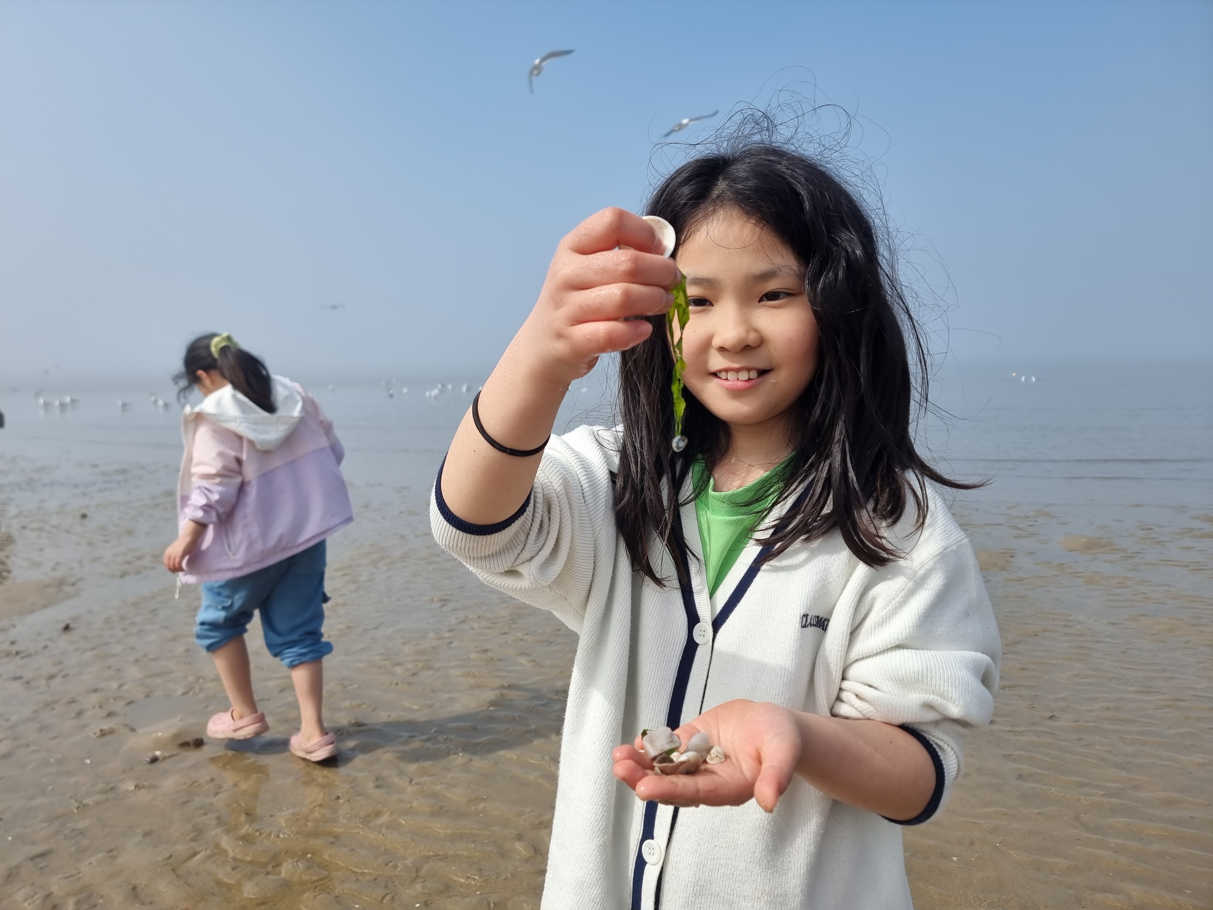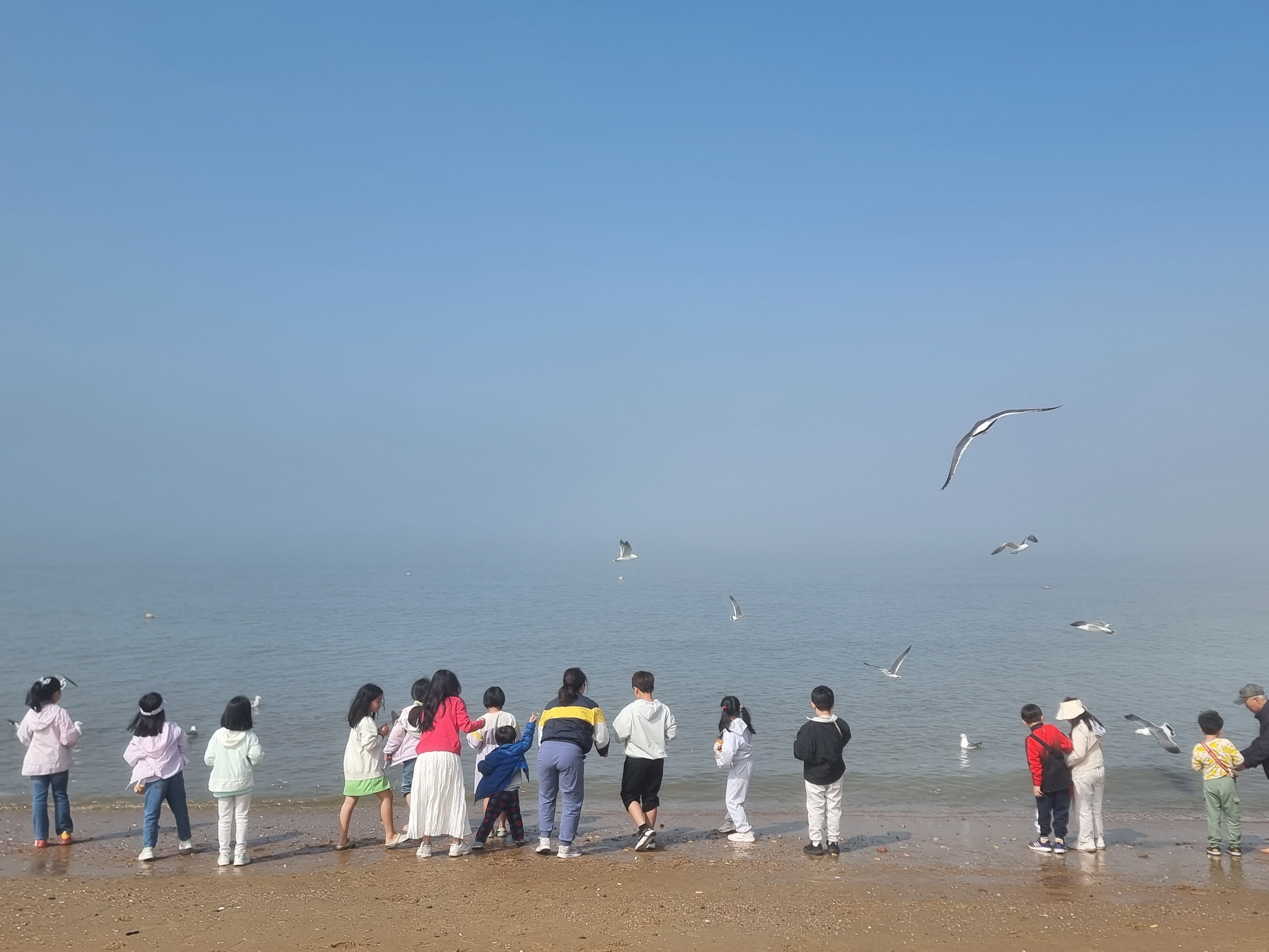 다른 아이들은 갯벌에서 온갖 생물과 놀고 조개를 캤습니다. 시원한 바람과 바다, 넘실거리는 해무, 해무가 걷히고 맑은 날씨, 절로 마음이 열렸습니다. 아이들도 서로 신나게 어울려 놀았습니다. 바다에 들어가지 않은 아이들과 어른들은 백사장에서 모래놀이와 모래에서 그림그리기를 하고 놀았습니다. 2월 전래놀이 활동가 교육을 할 때 아이들끼리 놀면서 조금 더 가까워진 덕분입니다. 이후에 이렇게 함께 여행을 오니 작년보다 서로 더욱 친해졌습니다.