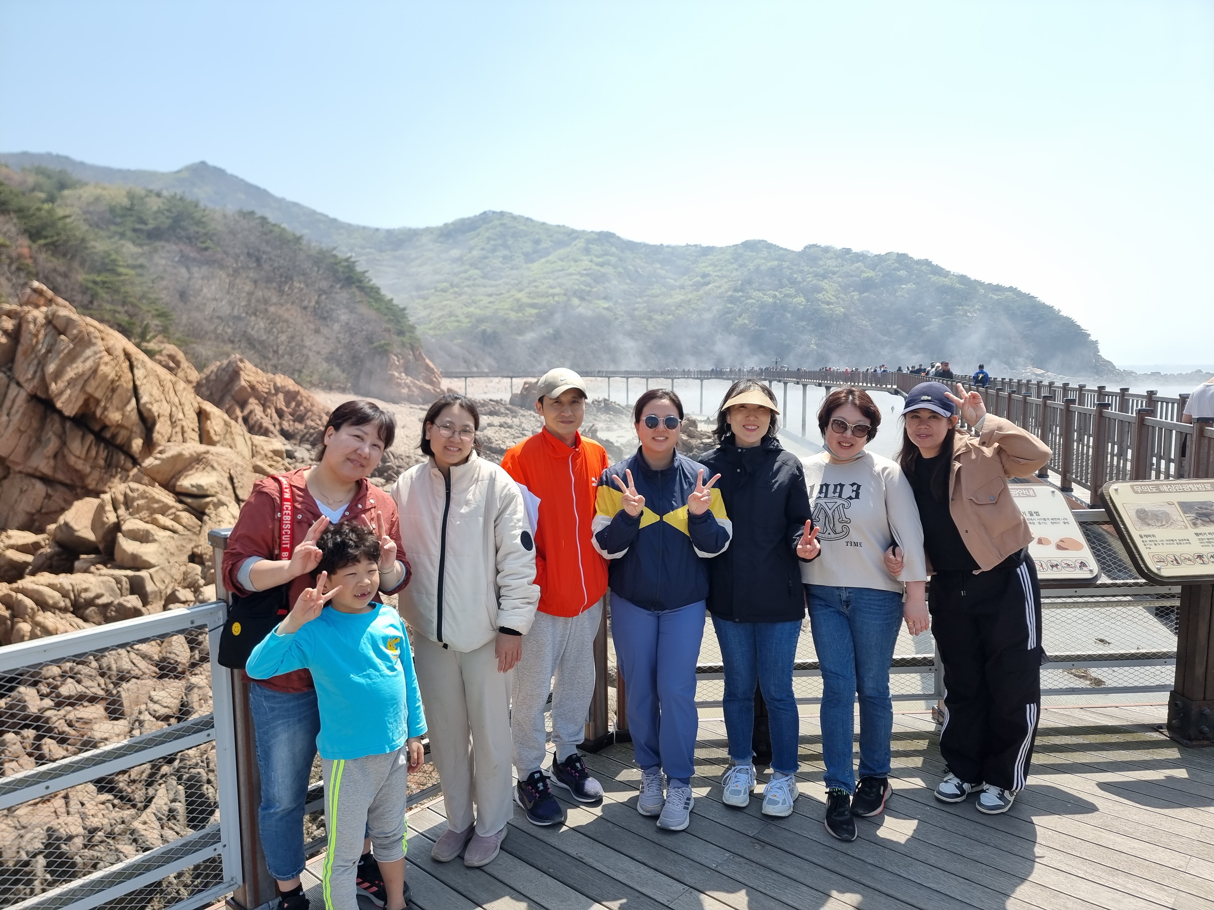 엄마들과 해상탐방로 끝까지 걸었습니다. 엄마들은 아이들이 어느 정도 크니 이제 아이들을 두고 엄마끼리 이렇게 나설 수 있다고 했습니다. 해상탐방로 끝에서 산길로 돌아왔습니다. 산길에 서니 해상탐방로가 작게 보입니다. 산길에서 힘차게 손을 흔드니 해상탐방로에서도 모르는 사람들이 손을 흔들어주었습니다. 마치 10대 소녀처럼 꺄르르 웃었습니다.