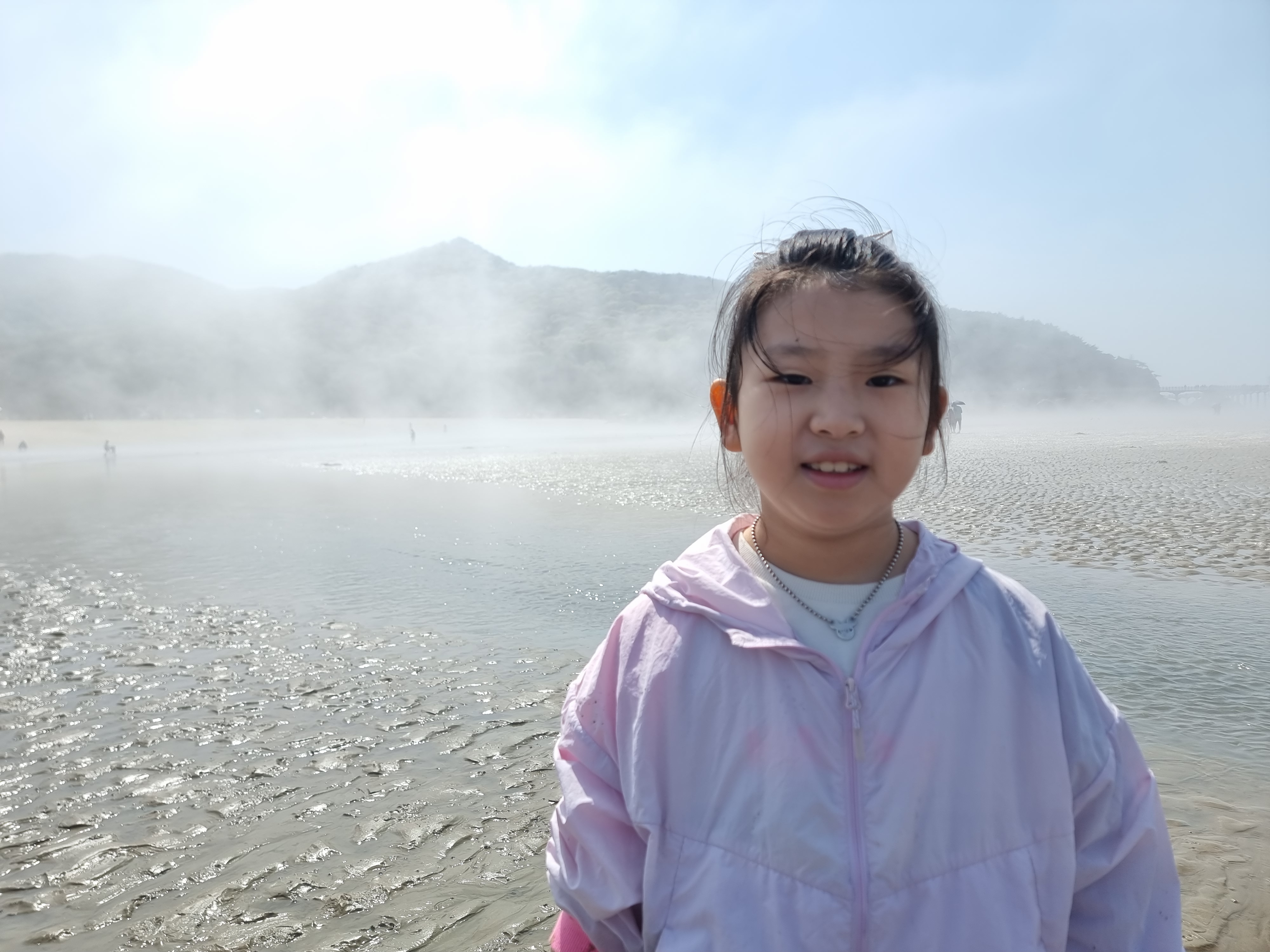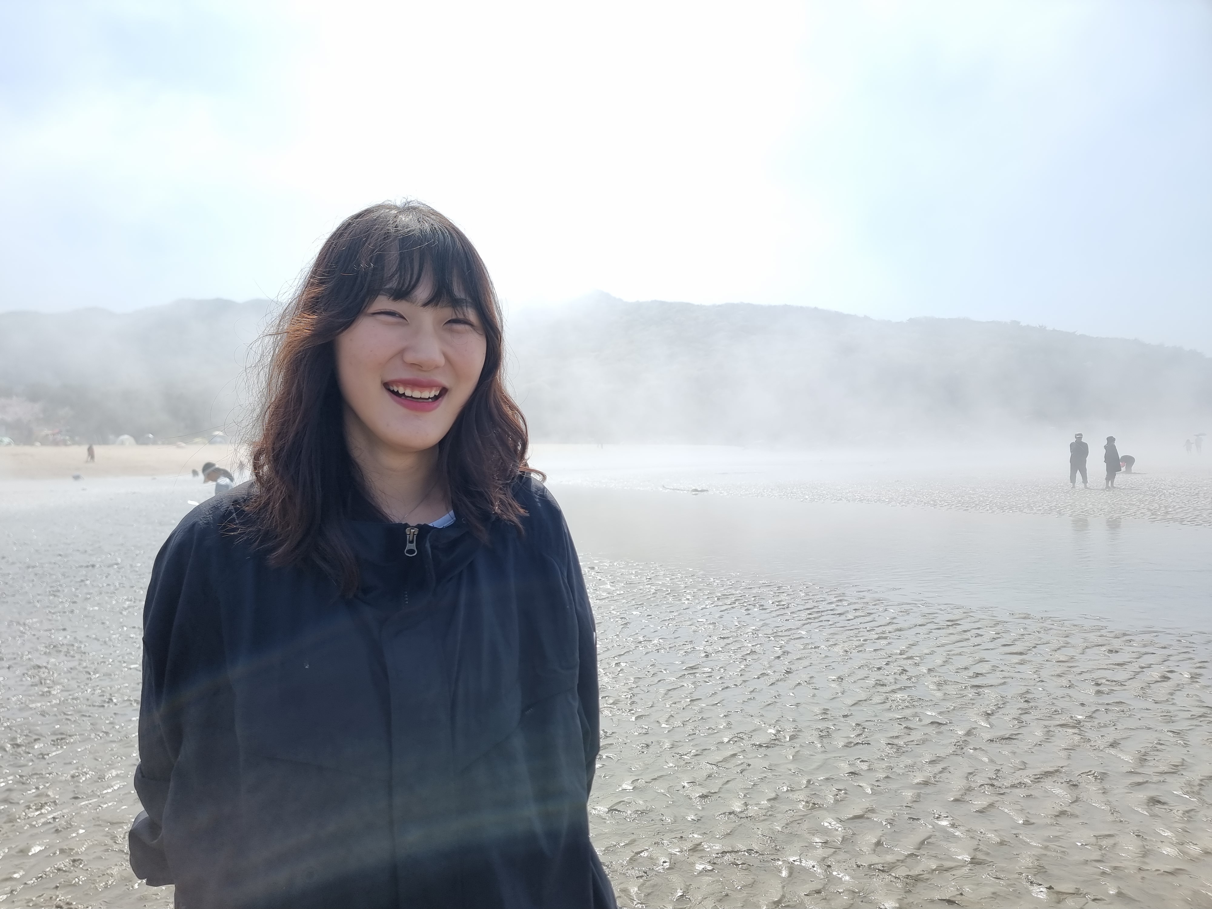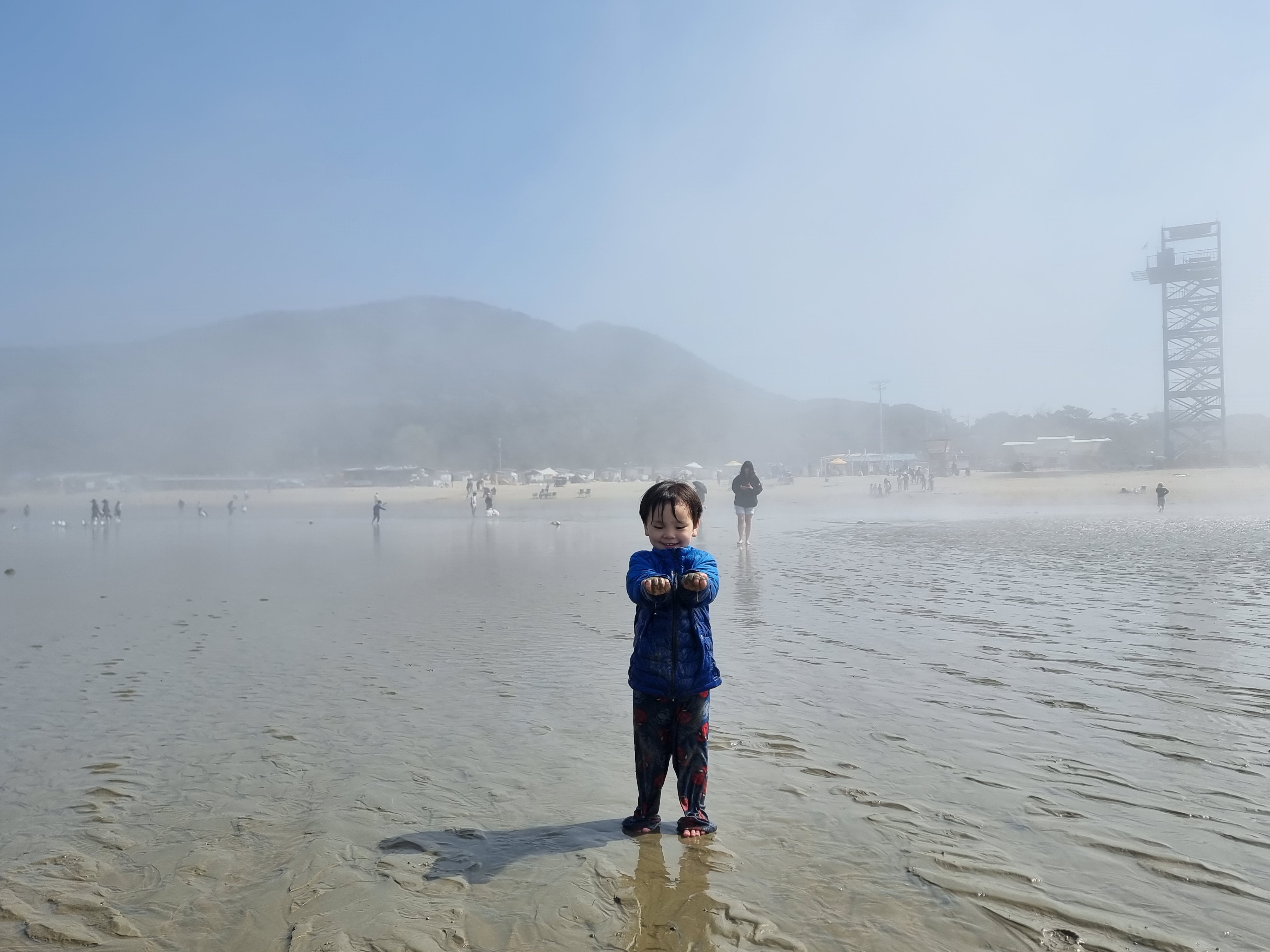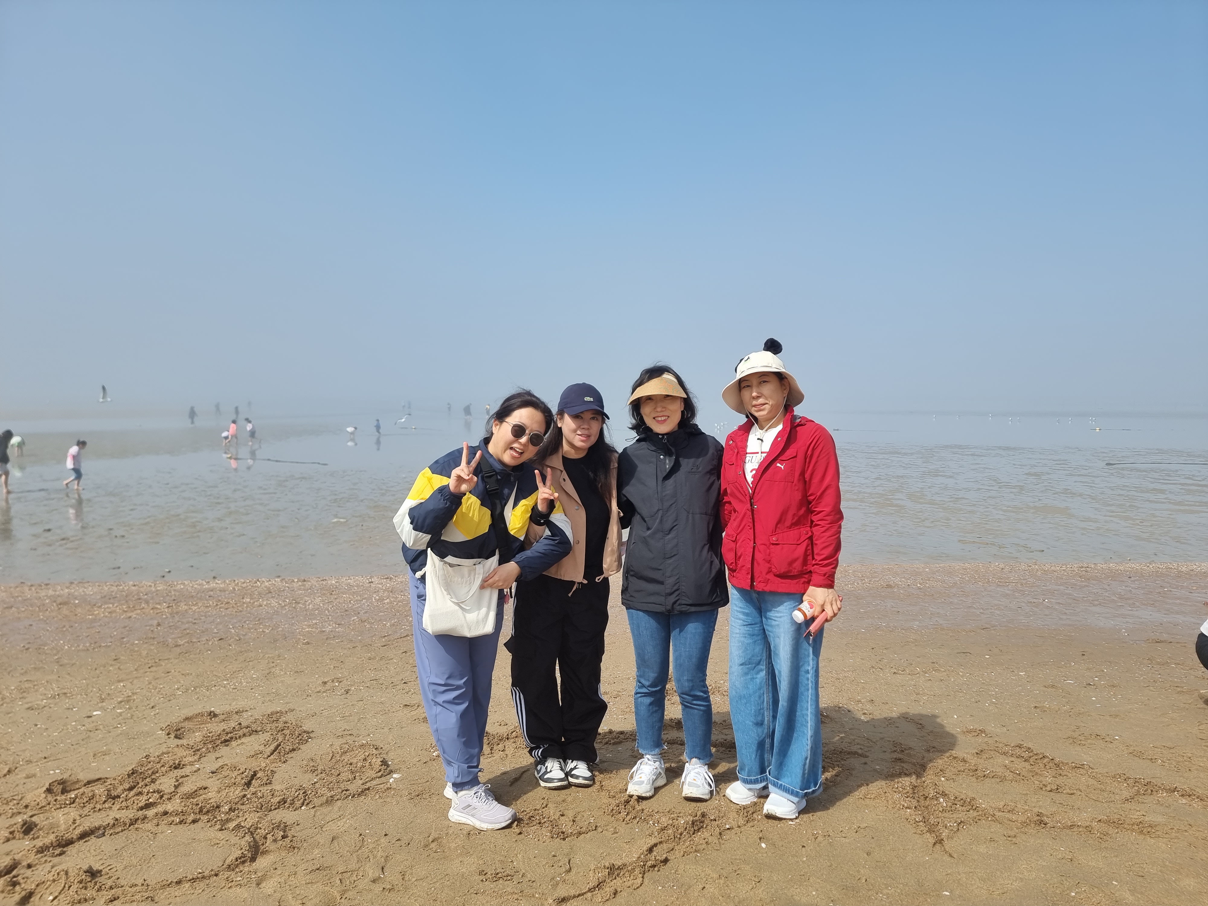 때마침 썰물입니다. 바다가 조금씩 뒤로 빠졌습니다. 하나둘 신발을 벗고 바다에 발을 내디뎠습니다. 아직 맨발로 바다에 들어가기엔 추운 4월 중순이지만 시원하고 물컹한 갯벌 촉감이 좋았습니다. 해무가 조금씩 걷혔습니다. 멀리 수평선과 산이 조금씩 선명하게 보이기 시작합니다. 멋진 풍경입니다. 모두 감탄했습니다.