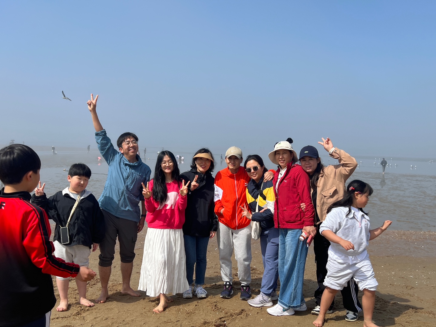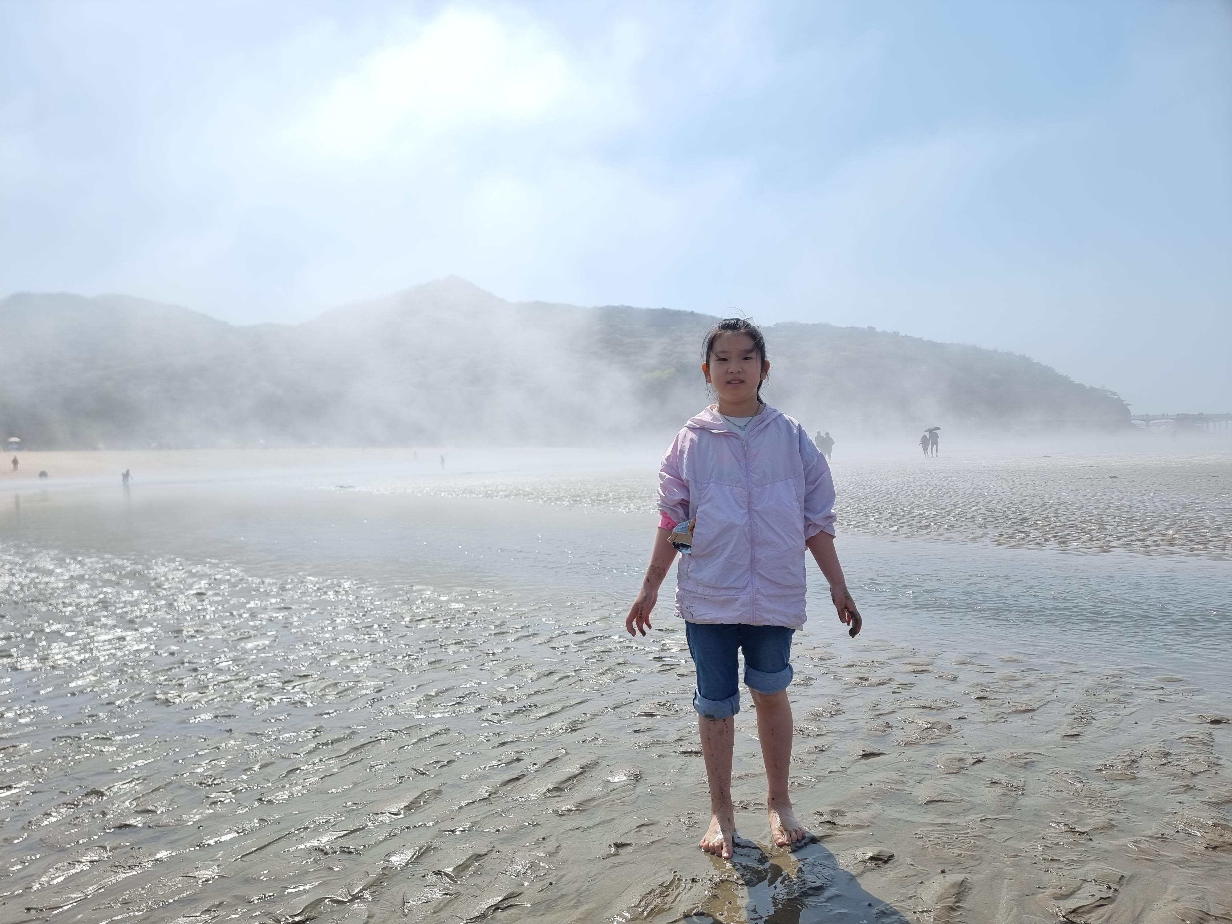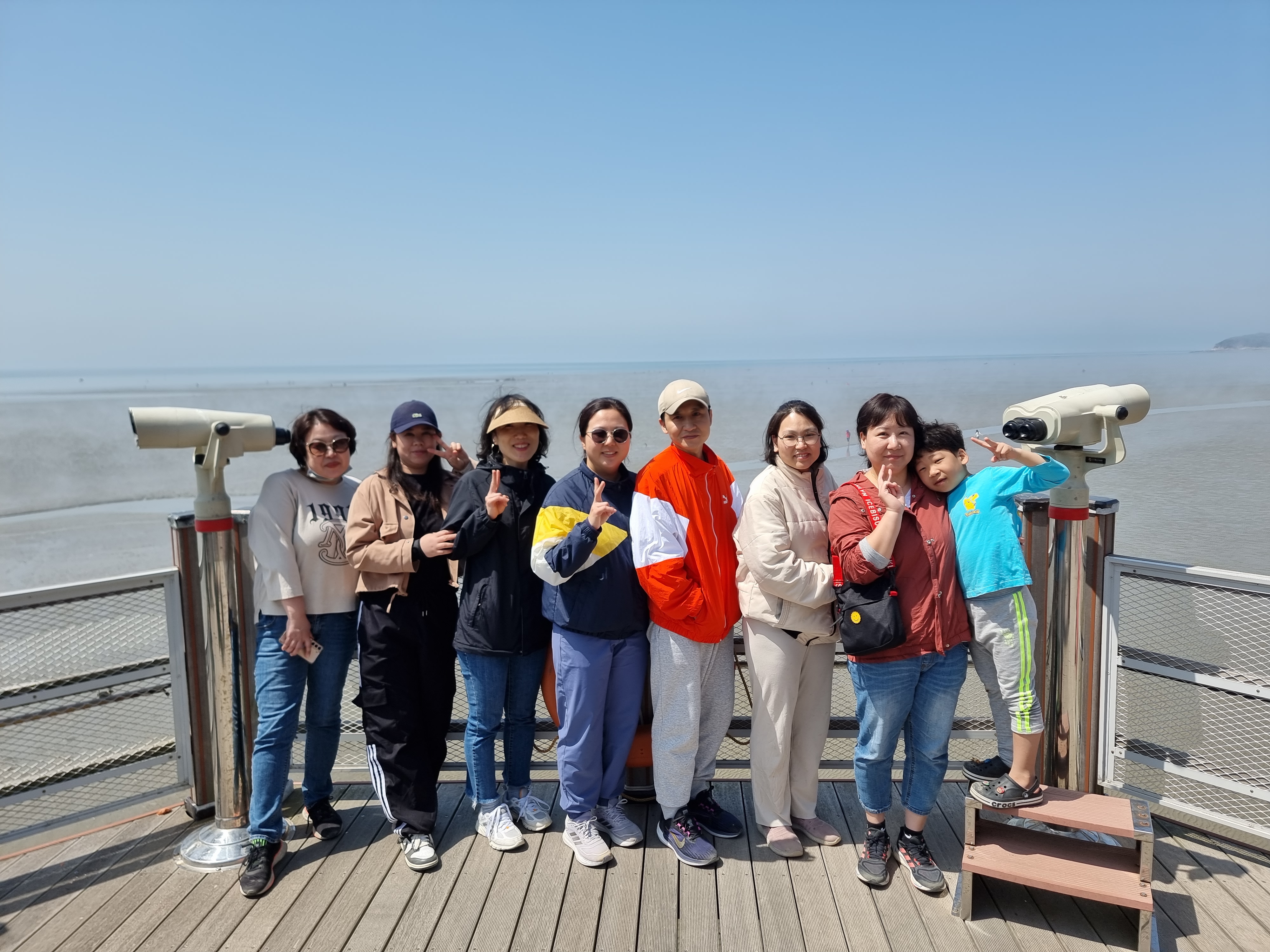 때마침 썰물입니다. 바다가 조금씩 뒤로 빠졌습니다. 하나둘 신발을 벗고 바다에 발을 내디뎠습니다. 아직 맨발로 바다에 들어가기엔 추운 4월 중순이지만 시원하고 물컹한 갯벌 촉감이 좋았습니다. 해무가 조금씩 걷혔습니다. 멀리 수평선과 산이 조금씩 선명하게 보이기 시작합니다. 멋진 풍경입니다. 모두 감탄했습니다.