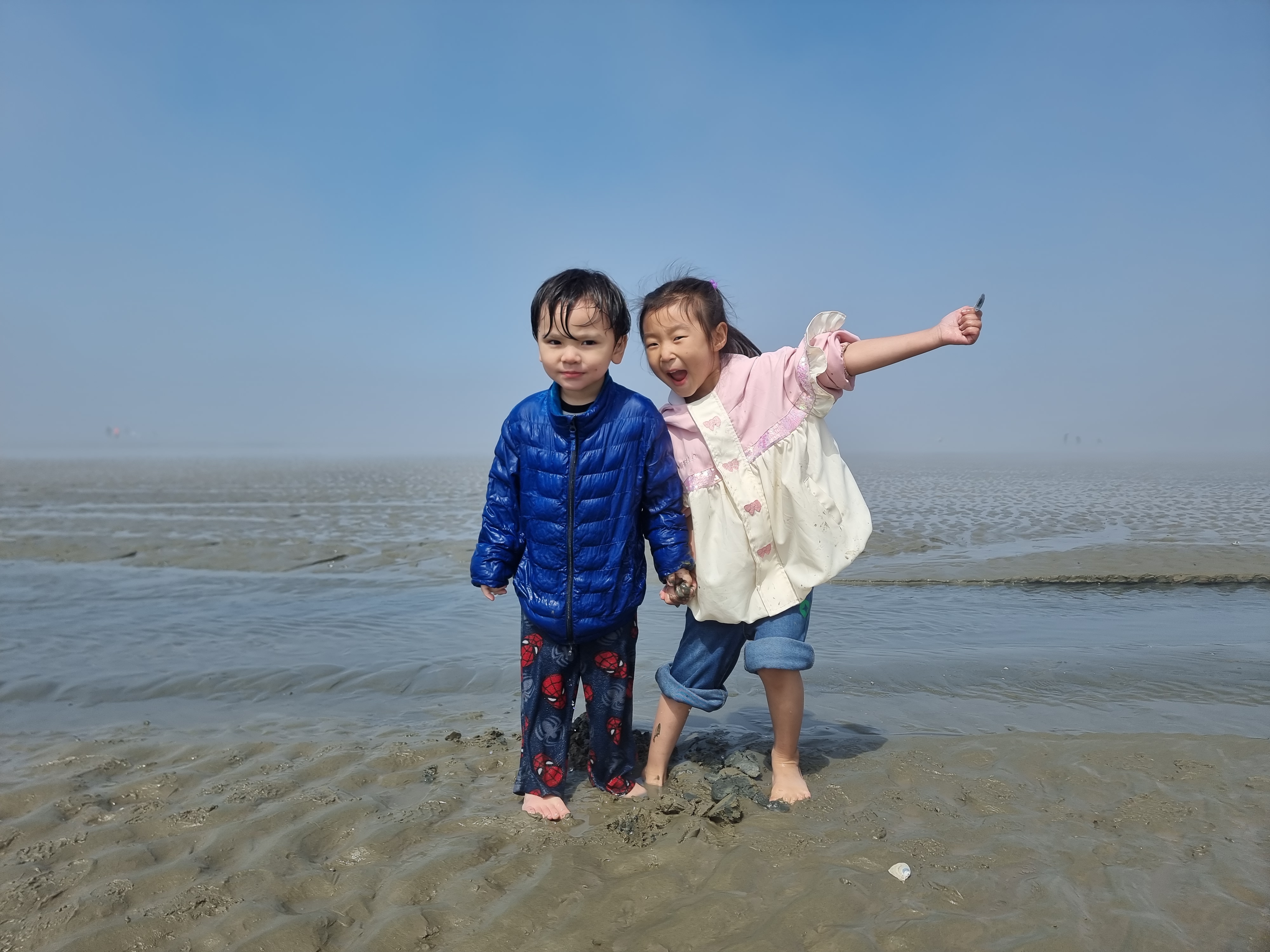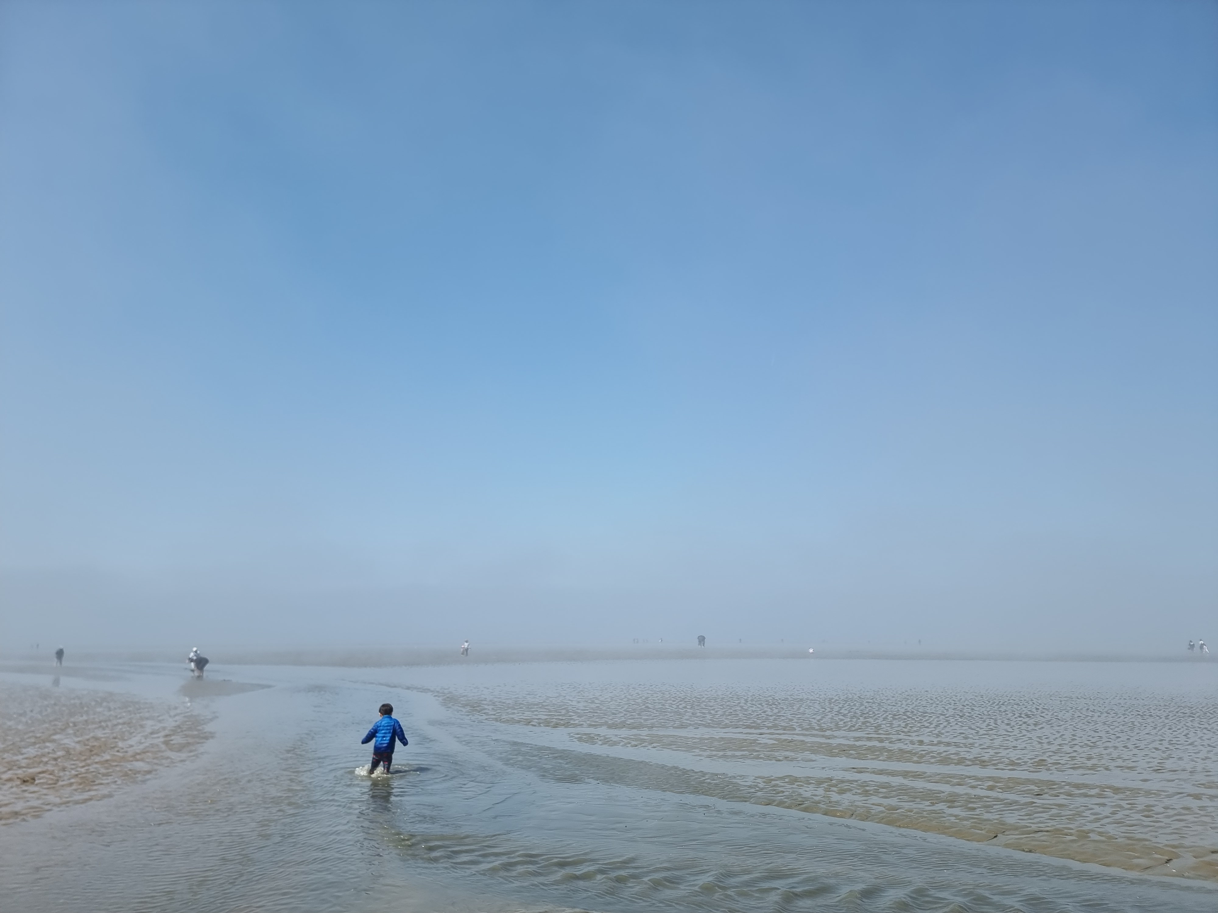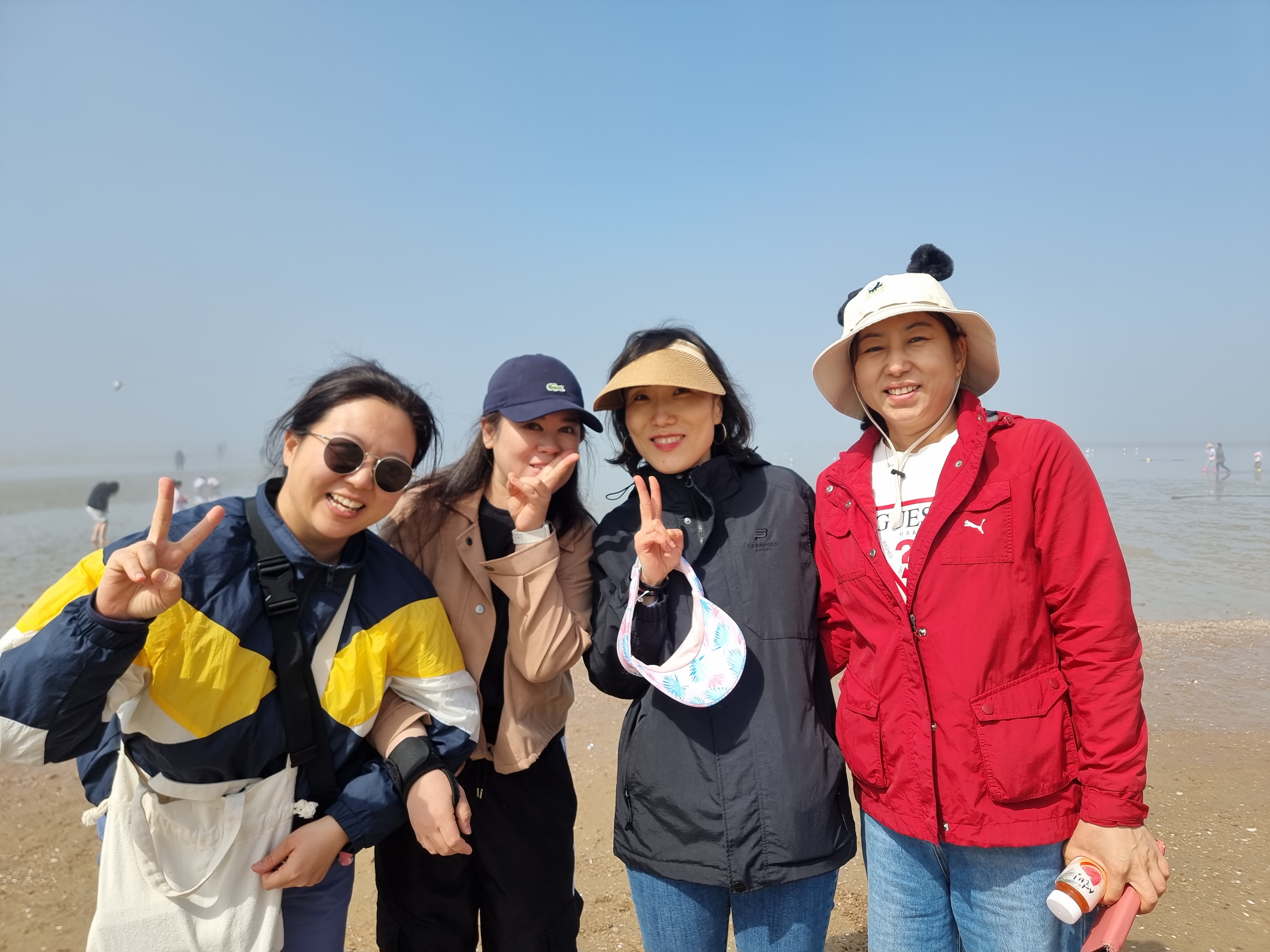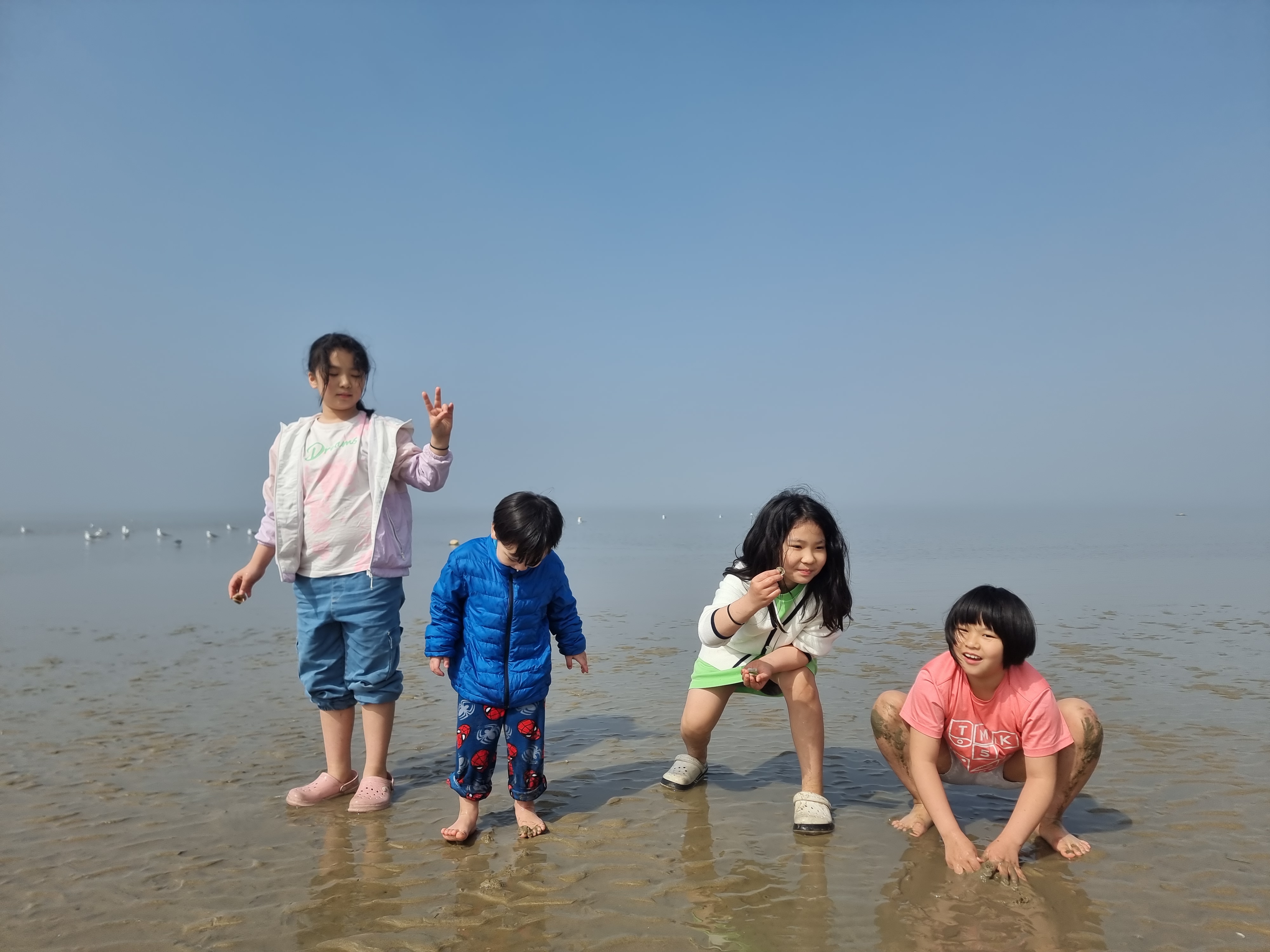 때마침 썰물입니다. 바다가 조금씩 뒤로 빠졌습니다. 하나둘 신발을 벗고 바다에 발을 내디뎠습니다. 아직 맨발로 바다에 들어가기엔 추운 4월 중순이지만 시원하고 물컹한 갯벌 촉감이 좋았습니다. 해무가 조금씩 걷혔습니다. 멀리 수평선과 산이 조금씩 선명하게 보이기 시작합니다. 멋진 풍경입니다. 모두 감탄했습니다.
