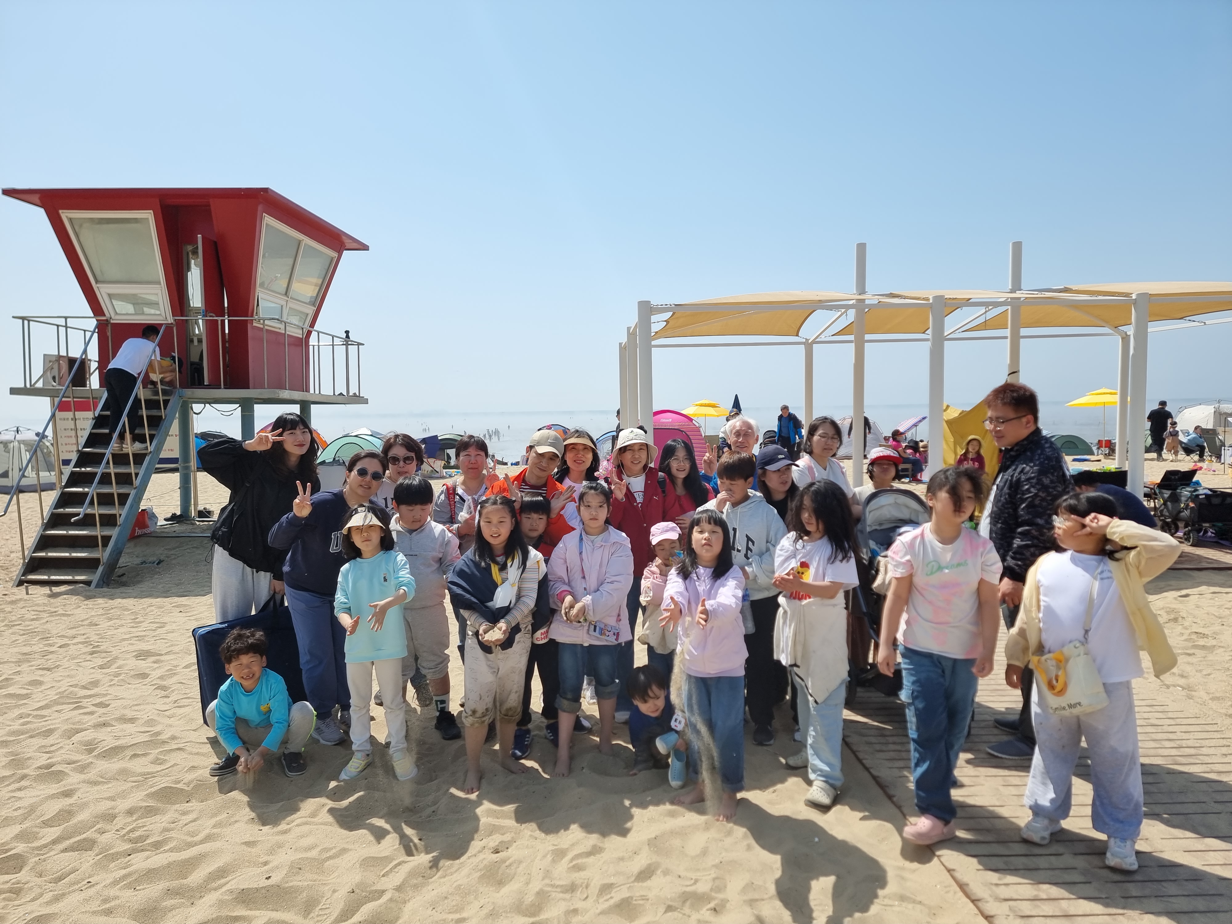 다시 바다로 돌아왔습니다. 어느새 해안가 가득 텐트와 타프가 가득합니다. 사람들이 많이 모였습니다. 집으로 돌아갈 시간입니다. 짐을 정리하고 단체 사진을 찍고 무의도 하나개 해수욕장을 떠났습니다.
