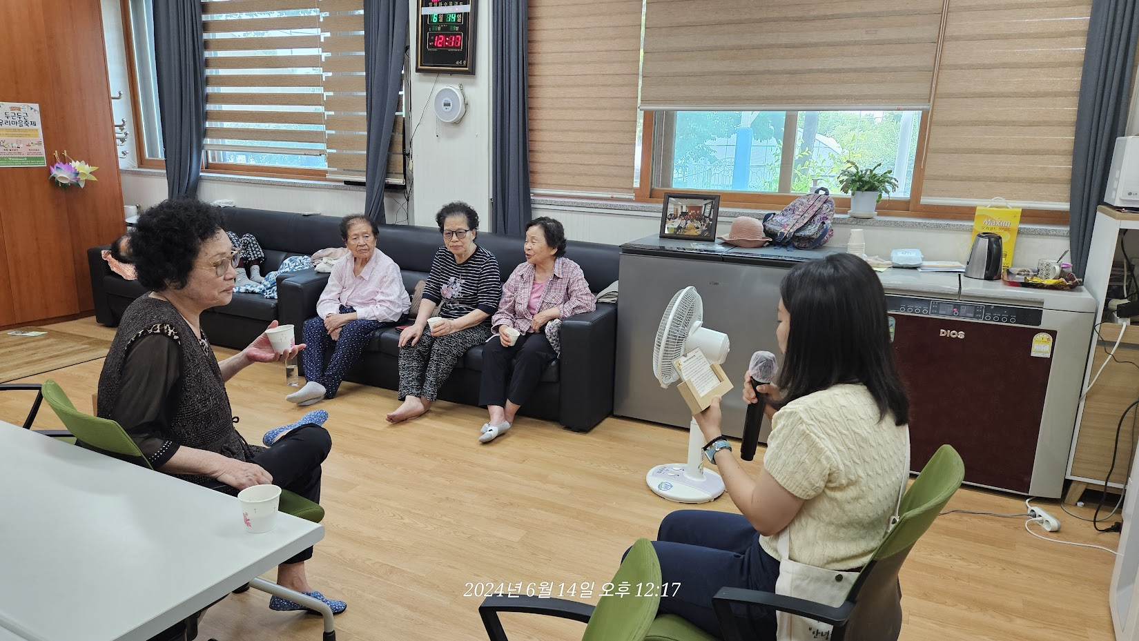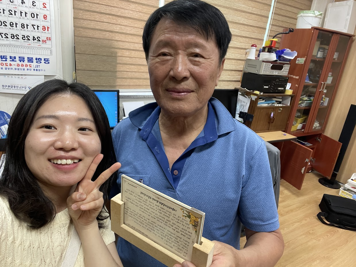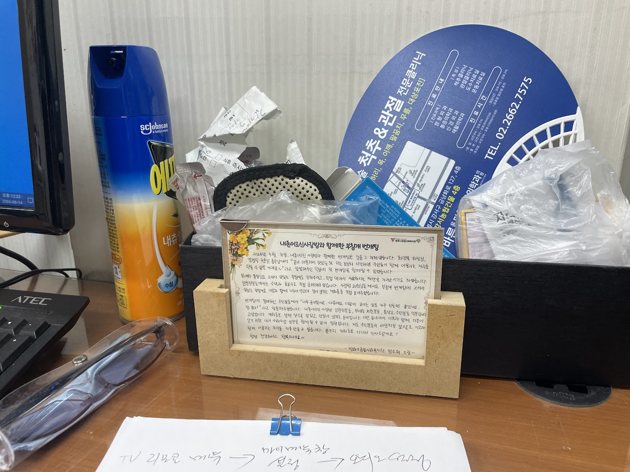어르신들께서도 커피 한 잔씩 손에 꼭 쥐고 흐뭇한 미소로 잘 들어주셨습니다. 편지를 읽으며 저도 참 마음에 깊은 감동이 있었습니다. 편지는 경로당 사무실 한 곳에 자리잡게 되었습니다!
