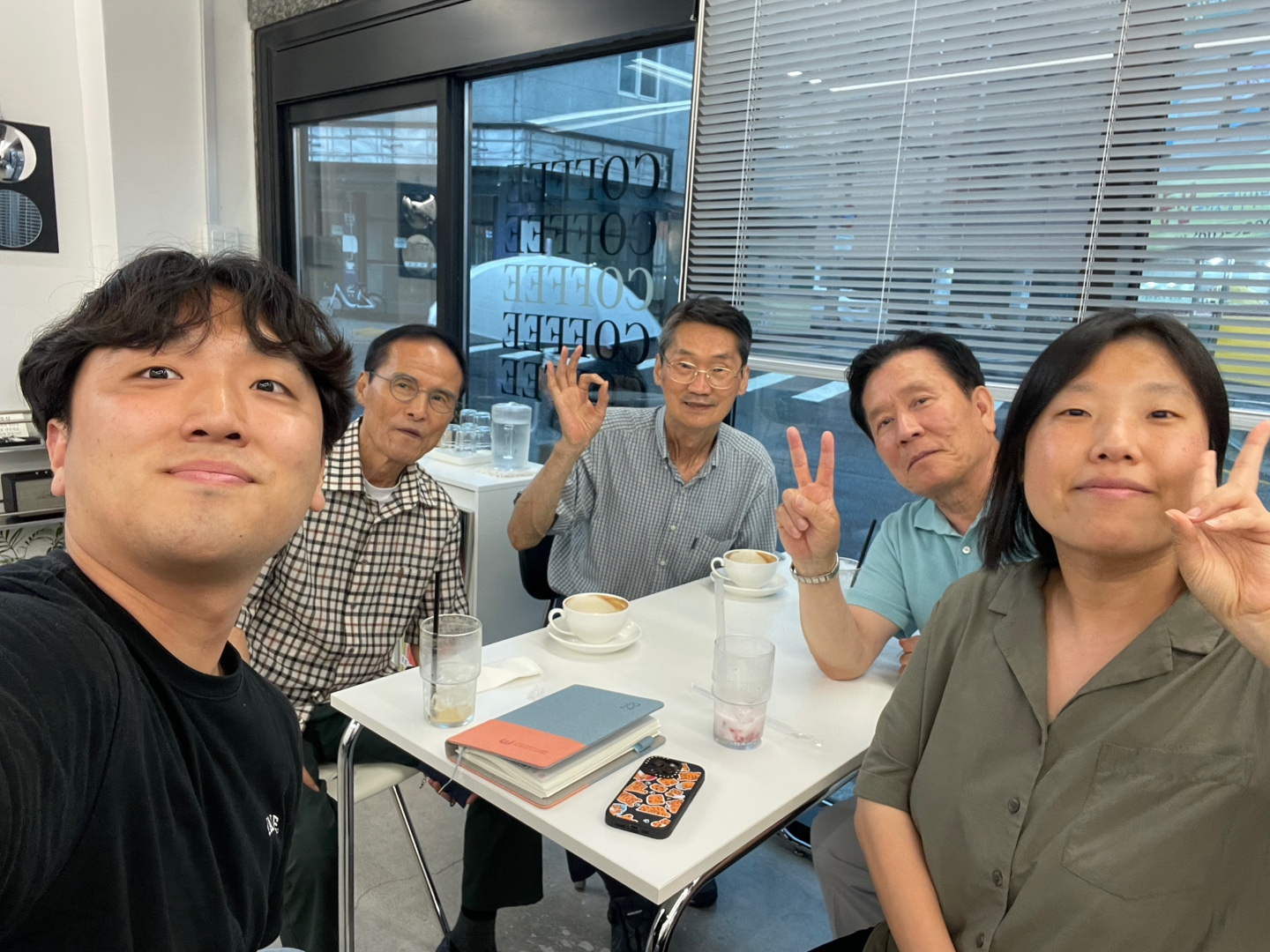 비를 뚫고 모임 장소인 공항동 주민센터에 도착했습니다. 김씨 아저씨께서 먼저 도착해 저와 권민지 과장님을 맞이해주셨습니다. 아직 도착하지 않은 참여자분들께도 연락을 돌리려는 찰나에 태씨 아저씨, 유씨 아저씨가 도착하셨습니다. 오씨 아저씨는 일정이 있으신지 오전부터 연락이 되지 않는 상황이었습니다. 우선은 모인 사람들끼리만 근처 카페로 장소를 옮겨 이야기 나누기로 했습니다.