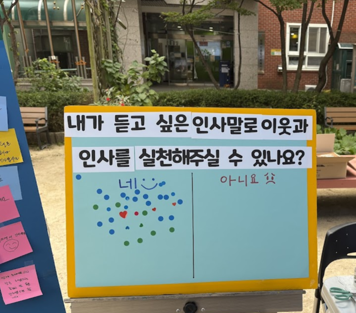 이번 번개팅에서는 주민분들이 이웃에게 어떤 인사말을 듣고 싶은지, 앞으로 이웃과 인사를 실천해 주실 수 있는지 이야기를 듣는 번개팅을 진행했습니다.