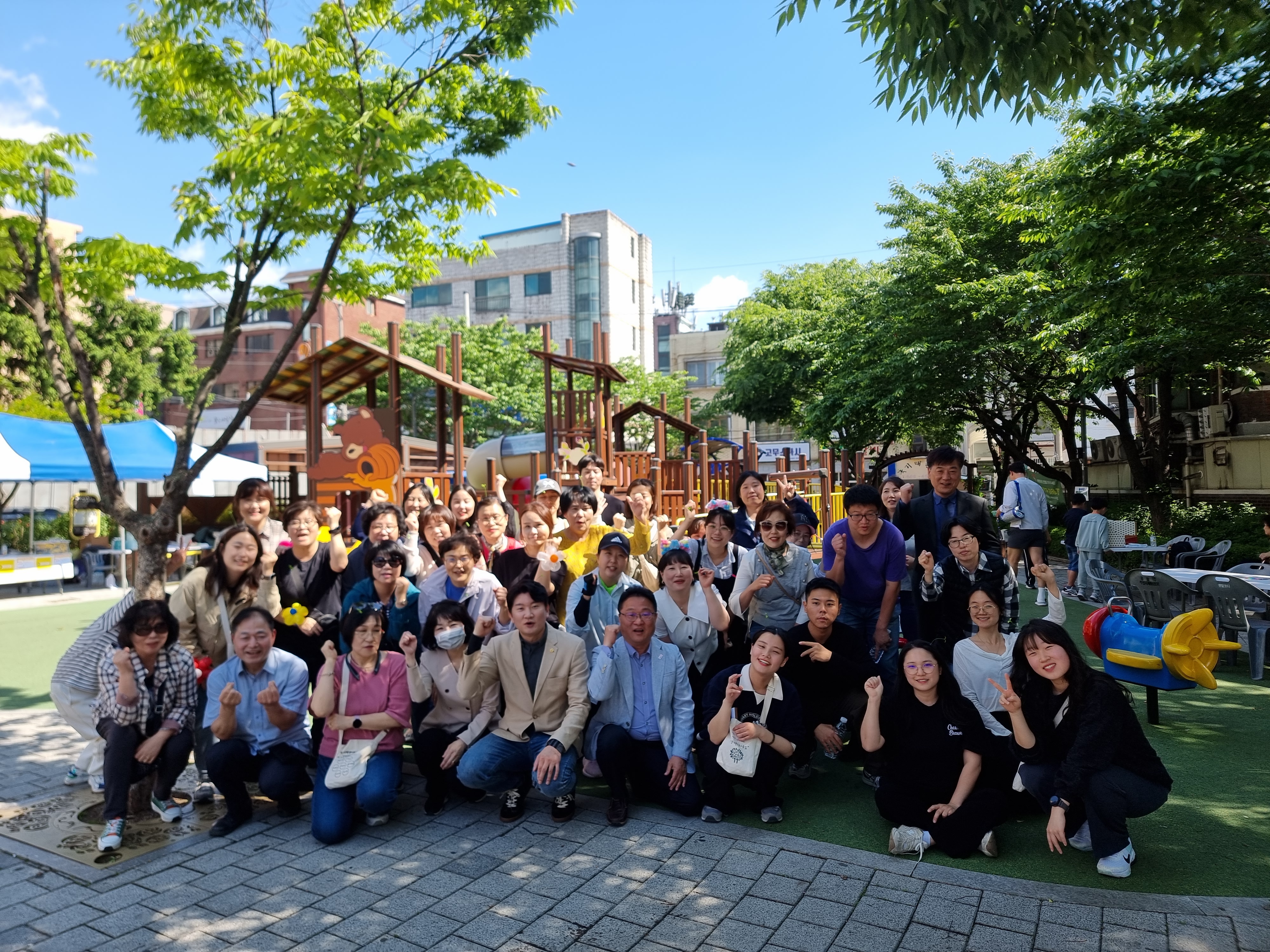 잔치 준비를 마치고 공원에 동그랗게 모였습니다. 각 기관들을 소개하고 박수치며 응원했습니다. 특별히 공항동 주민센터 곽진영 동장님, 서덕순 대표님, 공항벧엘교회 목사님, 복지관 권순범 관장님께서 오늘 잔치를 응원해주셨습니다. 다함께 모여 단체사진을 찍었습니다. 이렇게 동네와 아이들을 위해 애써주시는 분들이 많으니 든든하고 고맙습니다.