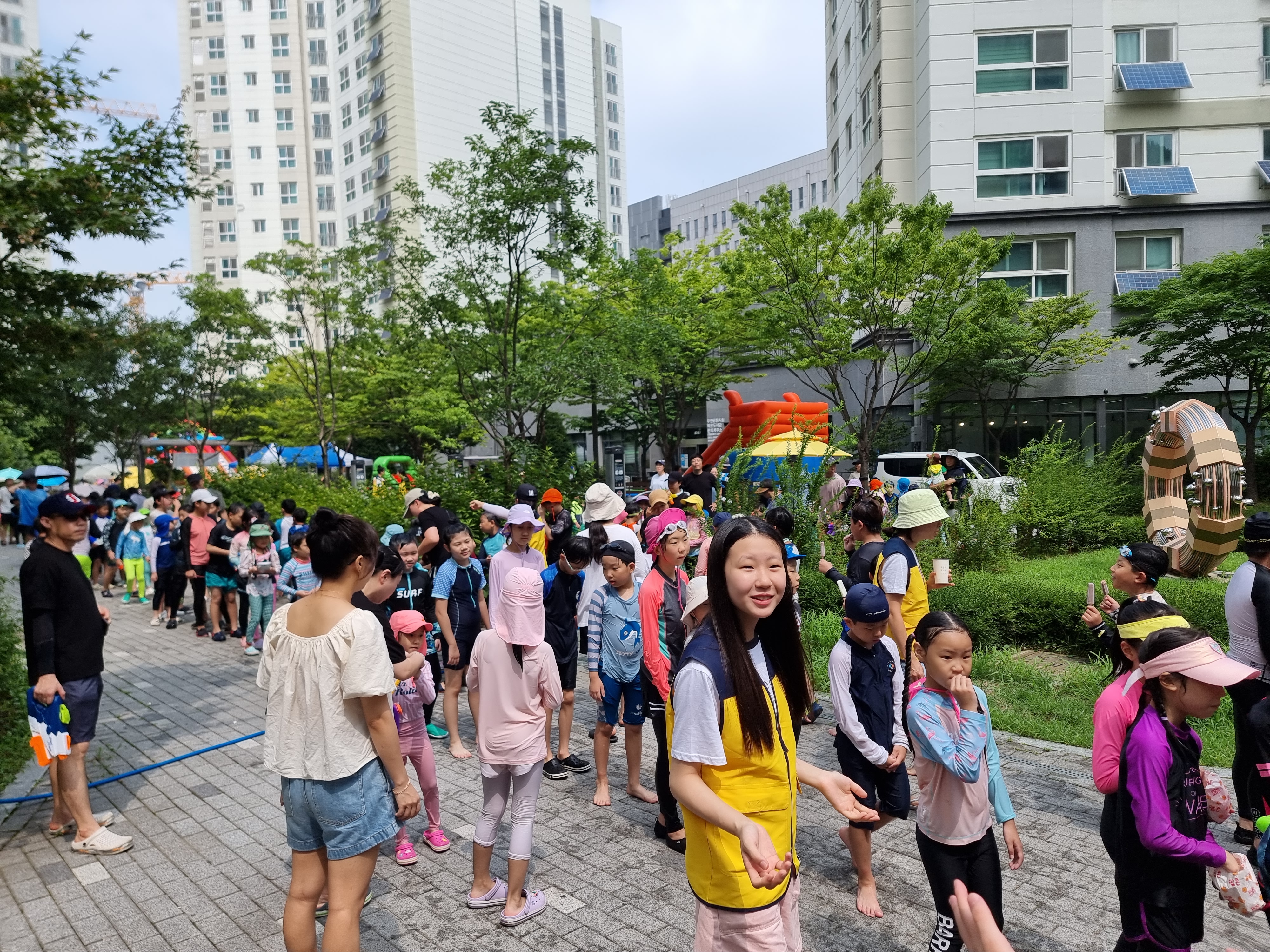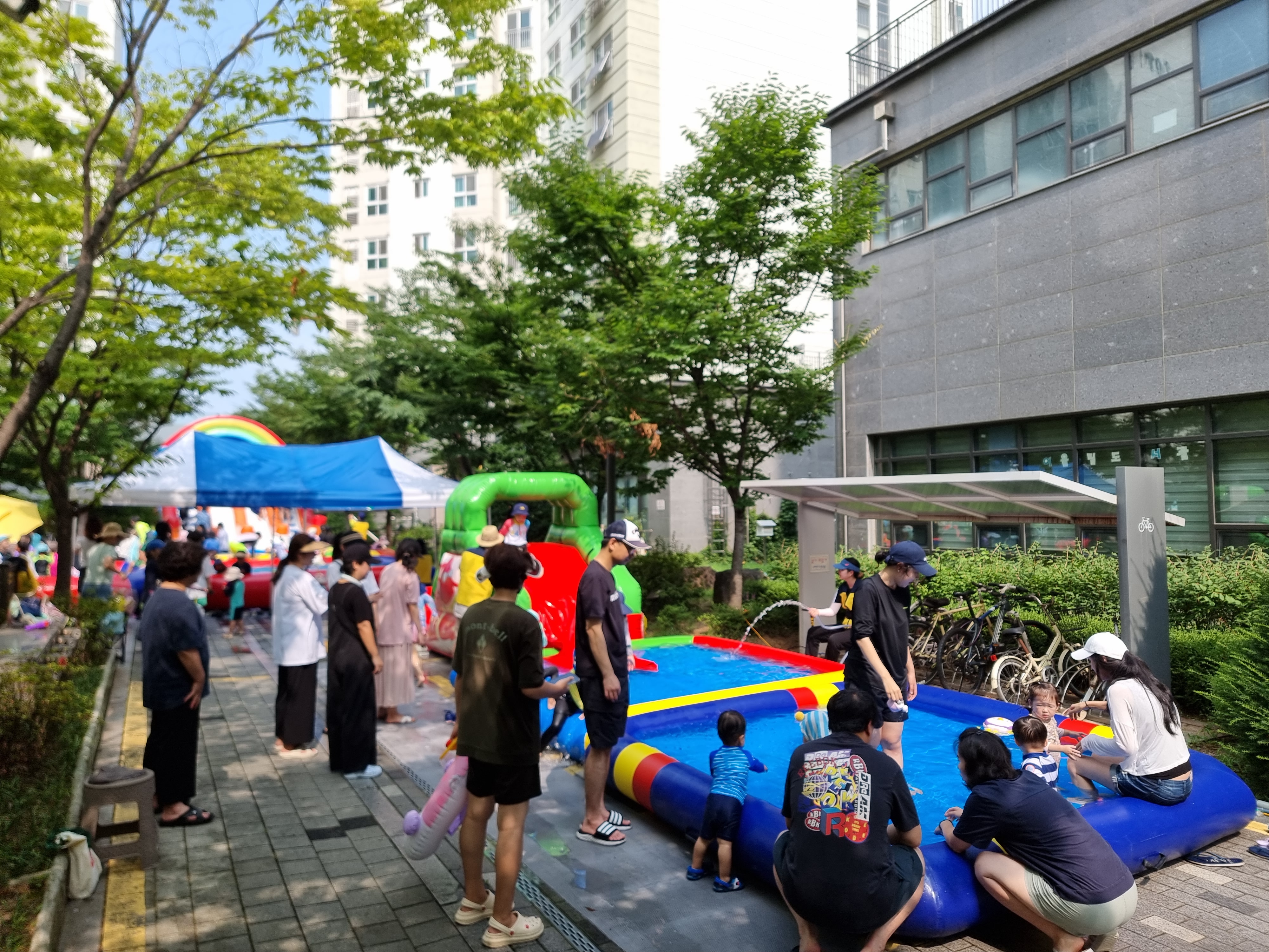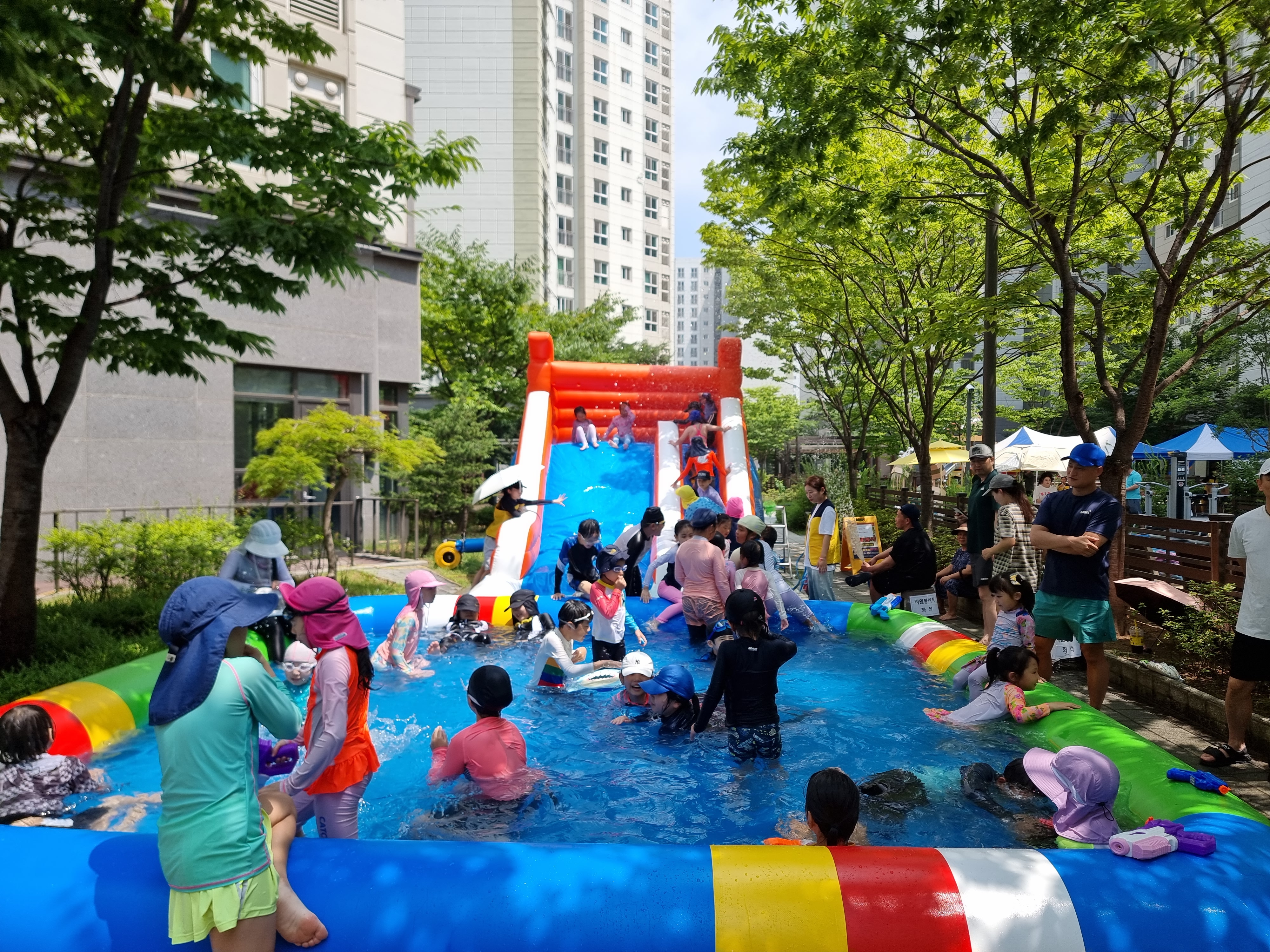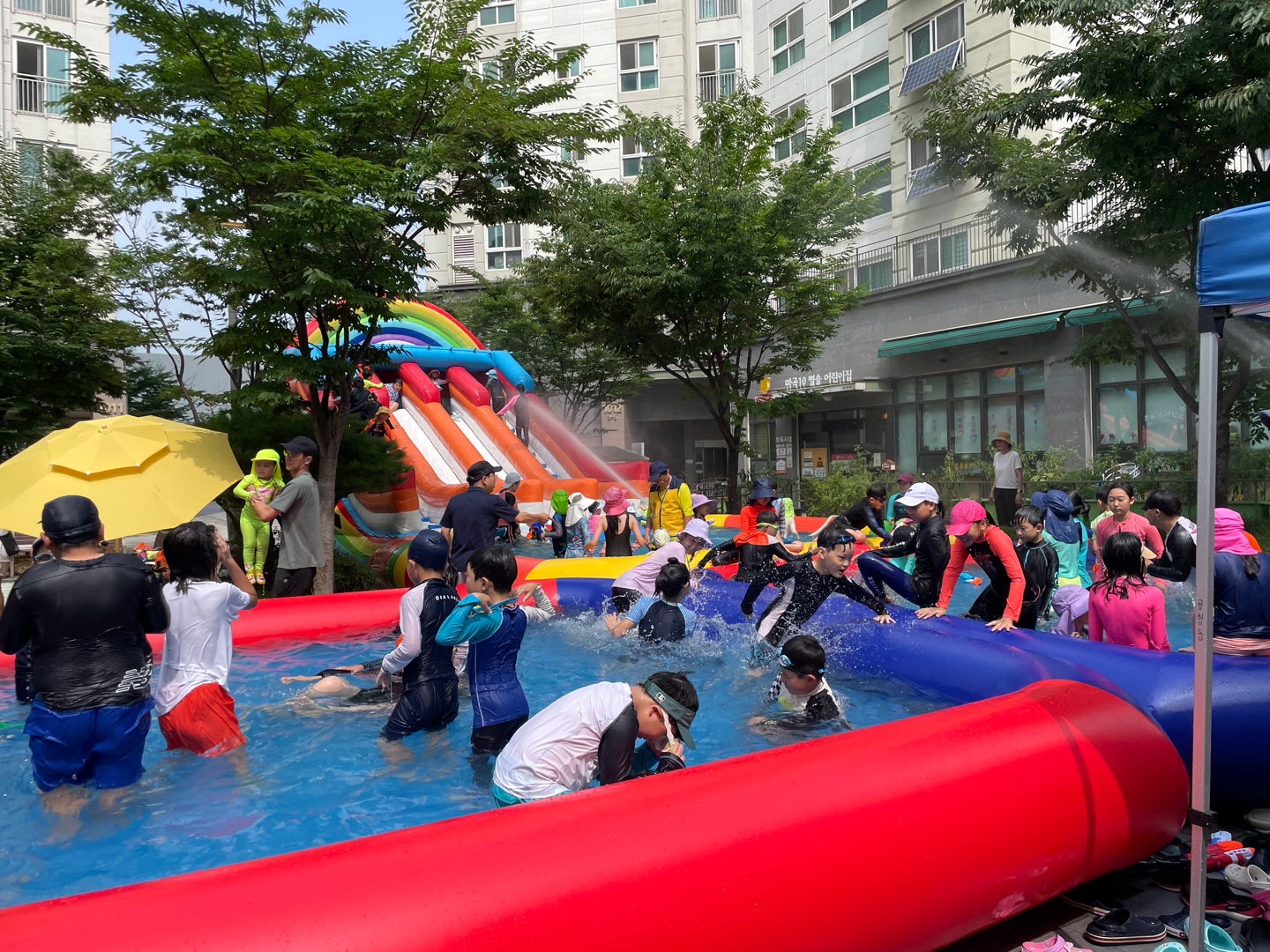 잔치 전날, 아이들처럼 설레고 기대되는 마음에 잠이 잘 오지 않더라고요. 오늘 물놀이 잔치로 동네 아이들이 정말 많이 나왔어요. 제가 아는 아이들도 있고 오가며 만난 아이들도 이번에 이야기 나누기도 했어요. 어른들이 애쓴 덕분에 멀리 가지 않아도 집 앞에서 이렇게 여름 물놀이 잔치를 했어요. 다른 아파트에는 없는 우리 문화에요. 동네 사람들도 우리 아파트가 정겹고 살맛 난다고 해요. (동네친구들 강미애 님)