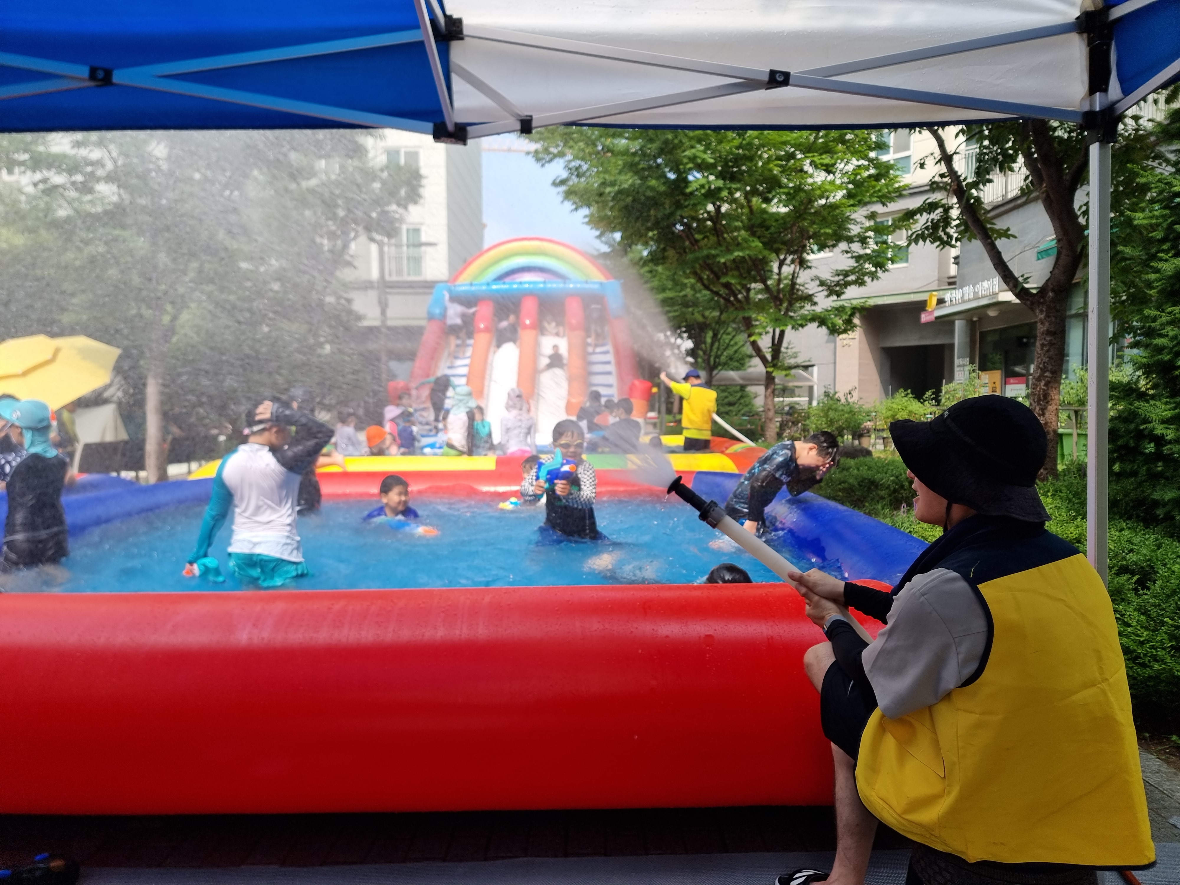 물놀이 소방호스 관리는 입주자대표회에서 동네 아빠들을 섭외했습니다. 소방호스가 무겁고 수압이 쎈 만큼 아빠들이 시간마다 돌아가며 관리하기로 했습니다. 끊임없이 에어바운스와 하늘로 물을 뿌려 더위를 식힙니다.