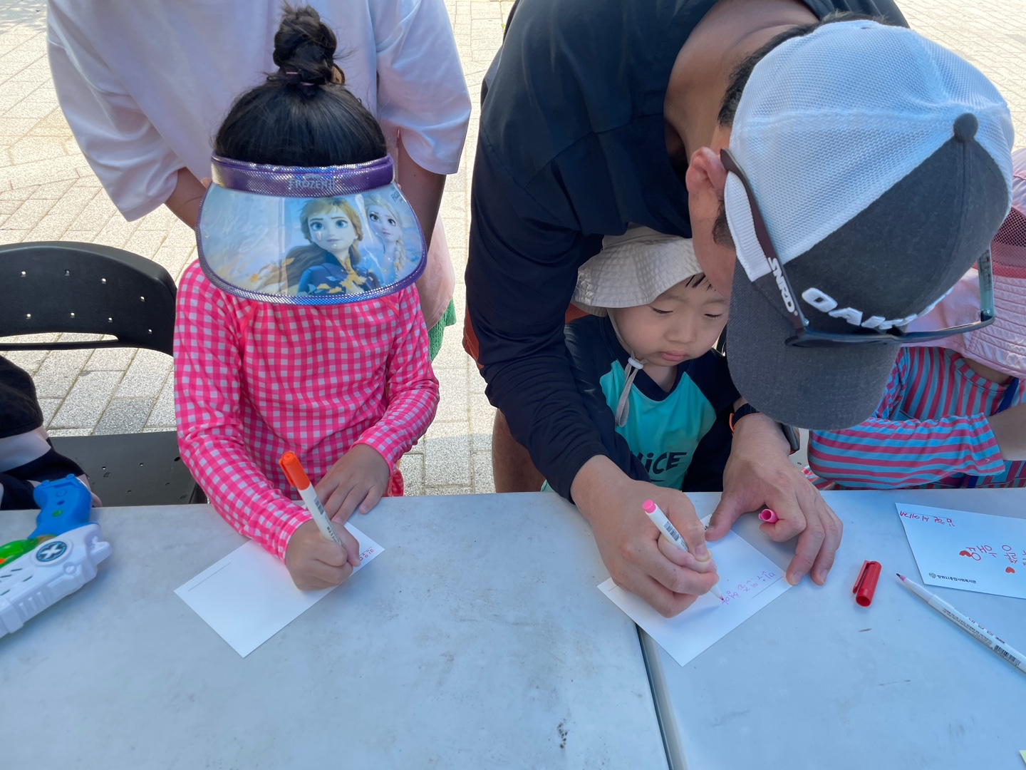자원봉사자들도 하나둘 도착했습니다. 다함께 천막 책상 의자 물품을 설치했습니다. 10시부터 인사캠페인을 시작했습니다. 꾸준히 입주민들이 참여했습니다. 누구에게 마음을 전할지 궁리하다 이내 편지를 써 내려갔습니다. 물놀이 쉬는 시간에는 많은 사람이 몰려 북새통을 이루었습니다.